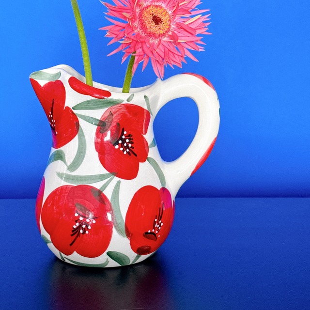 大きな赤いお花の絵付けが可愛い、スペイン製陶器のヴィンテージピッチャーです。1点ものになります。 ヴィンテージ品ですので、多少の傷や使用感はあります。そこも含めて魅力を感じて頂けると幸いです。 ※輸送中の大きな破損以外の、小傷やスレによる返品は承っておりませんので、ご理解の上ご購入下さいますようお願いいたします。 ◇サイズ 高さ 約18㎝ 幅 約18㎝ 口径 約11㎝ 底径 約9㎝