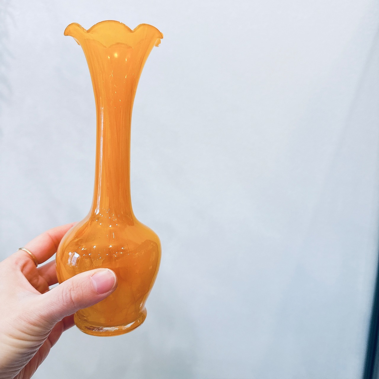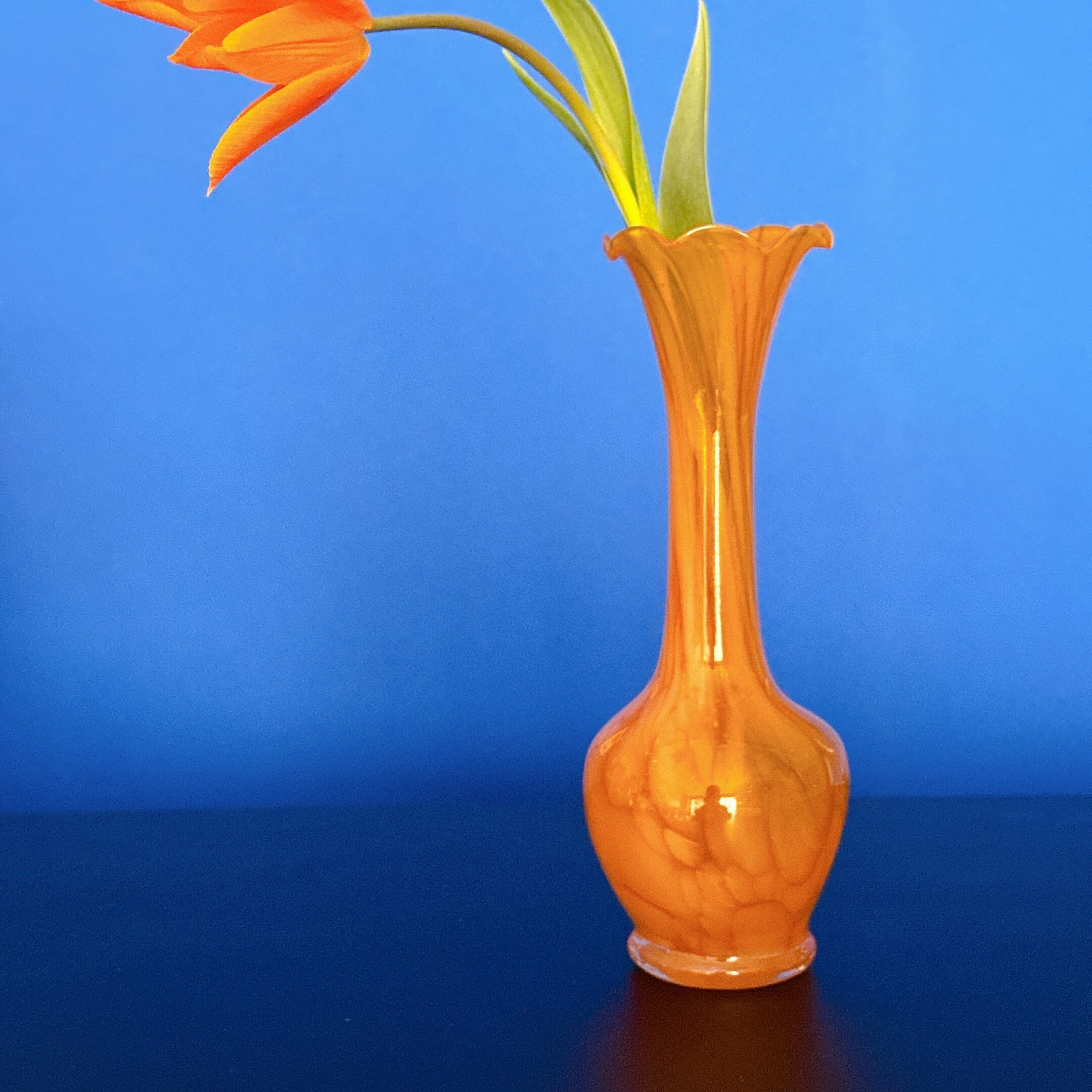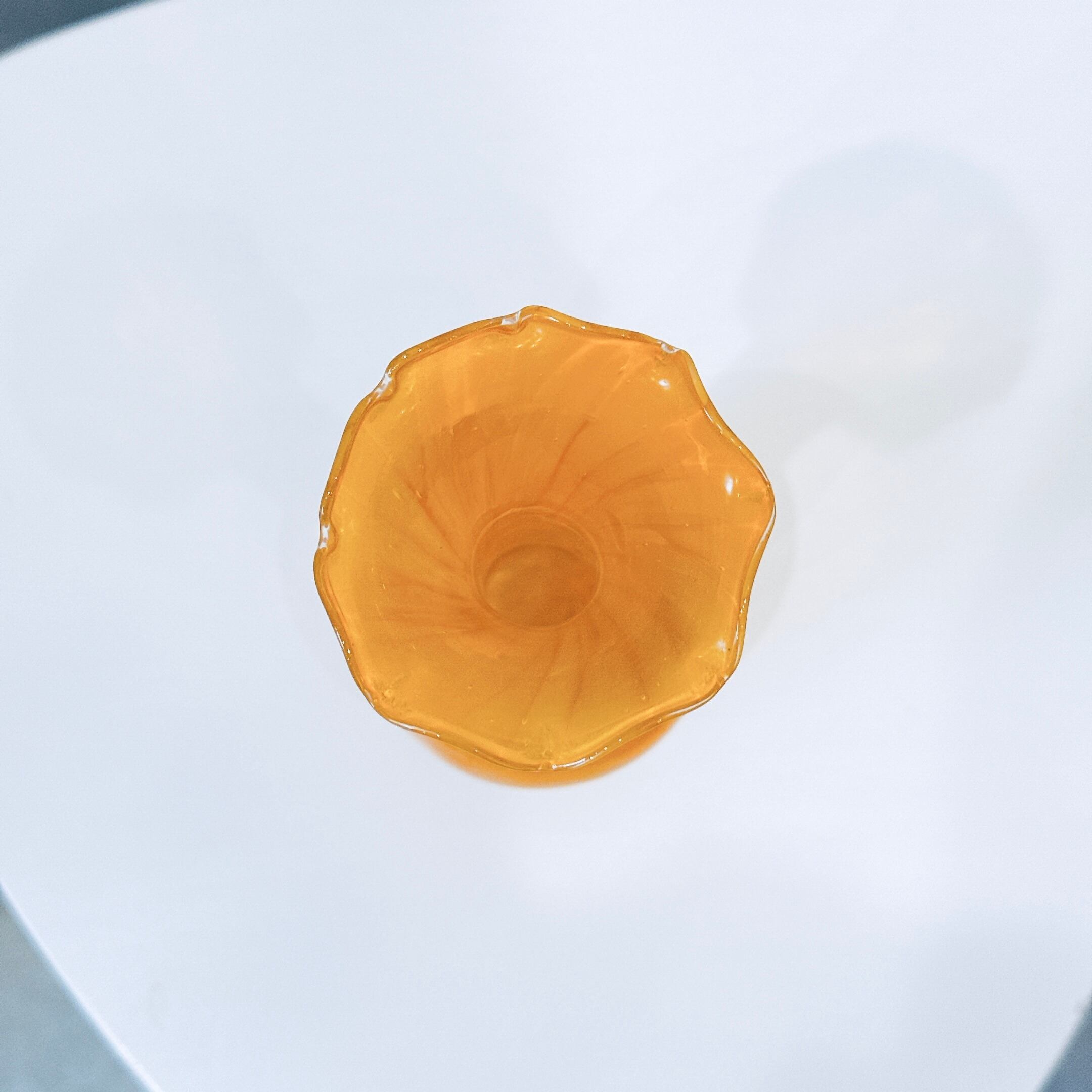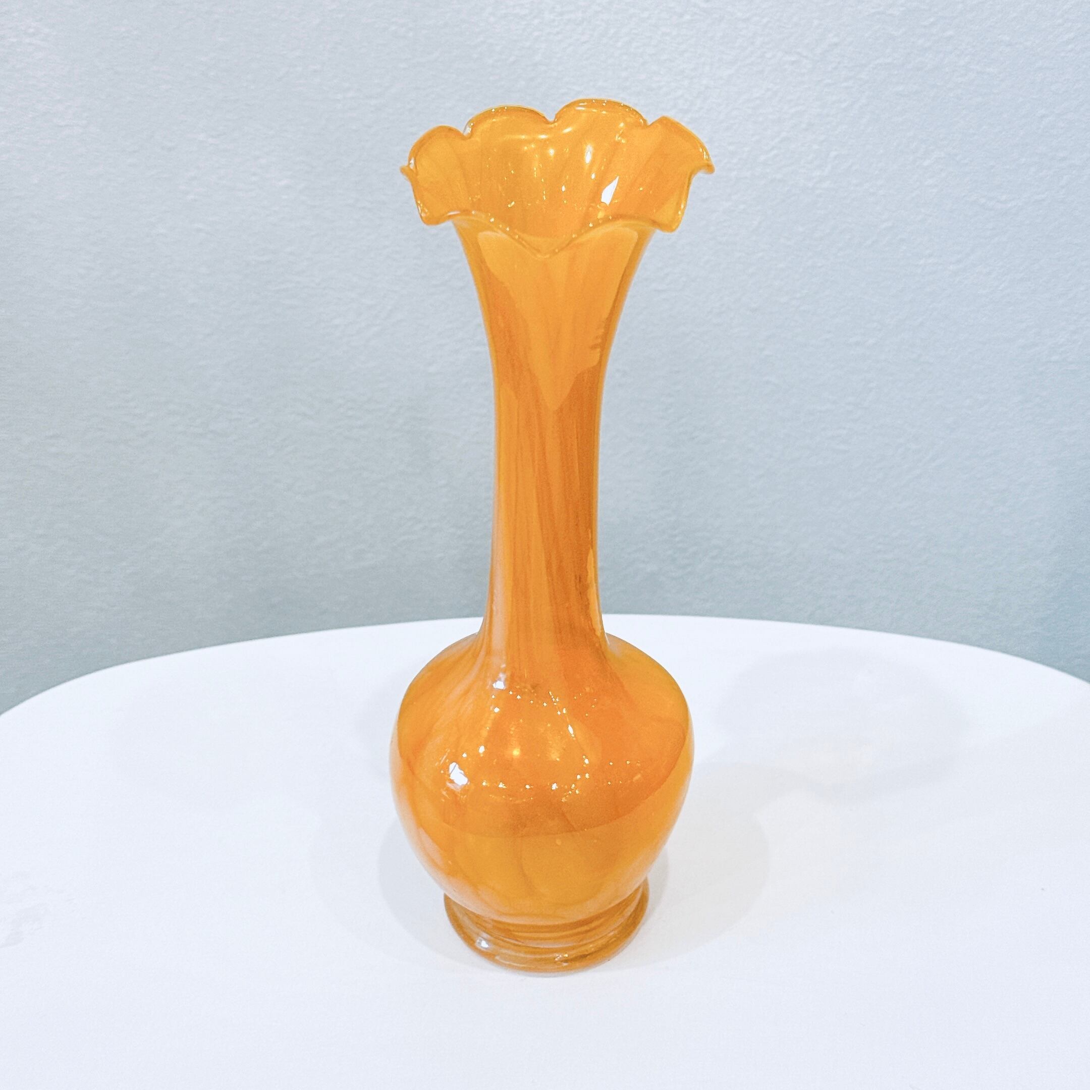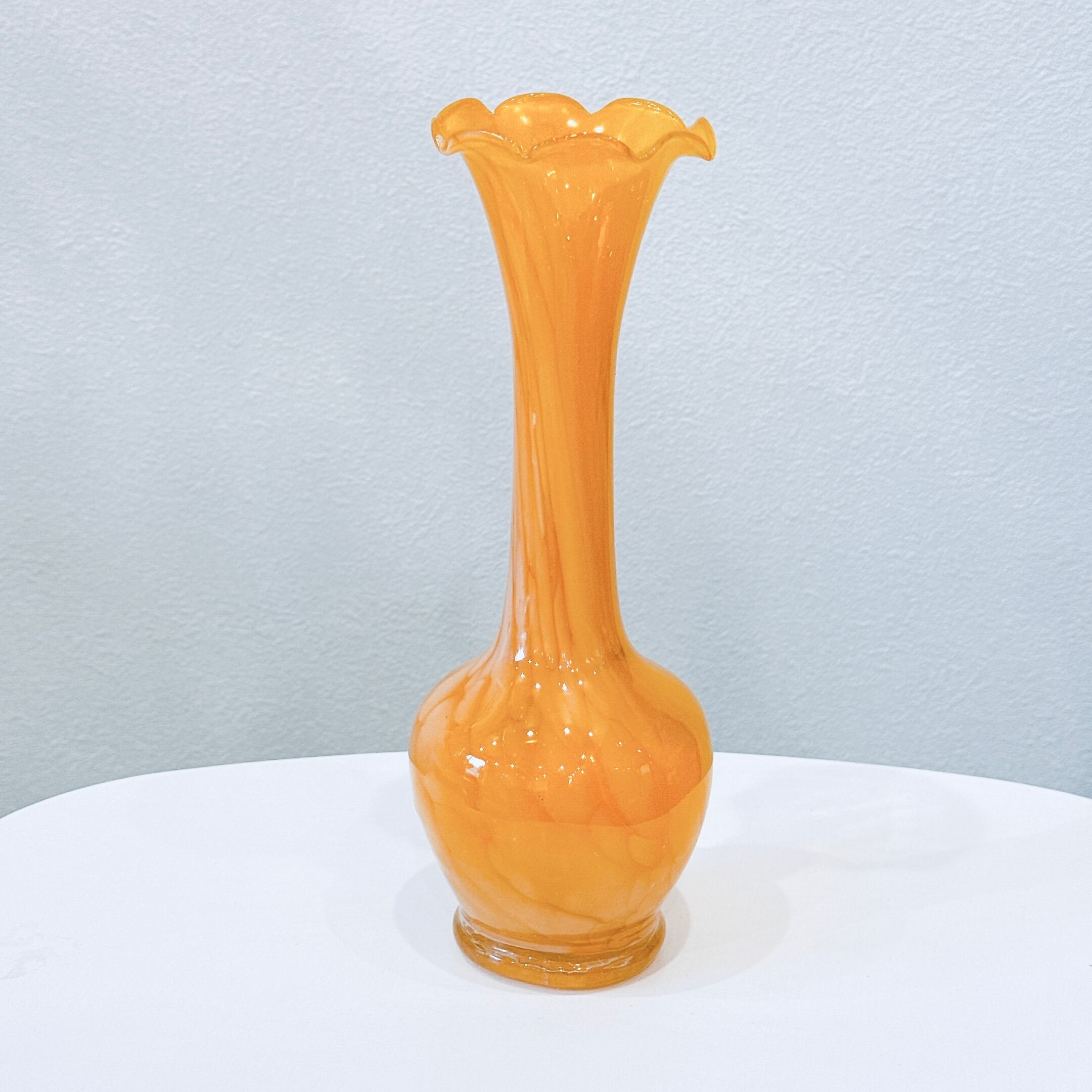 黄色いマーブル模様とフリルの口が可愛い、ガラス製のヴィンテージフラワーベースです。1点ものになります。