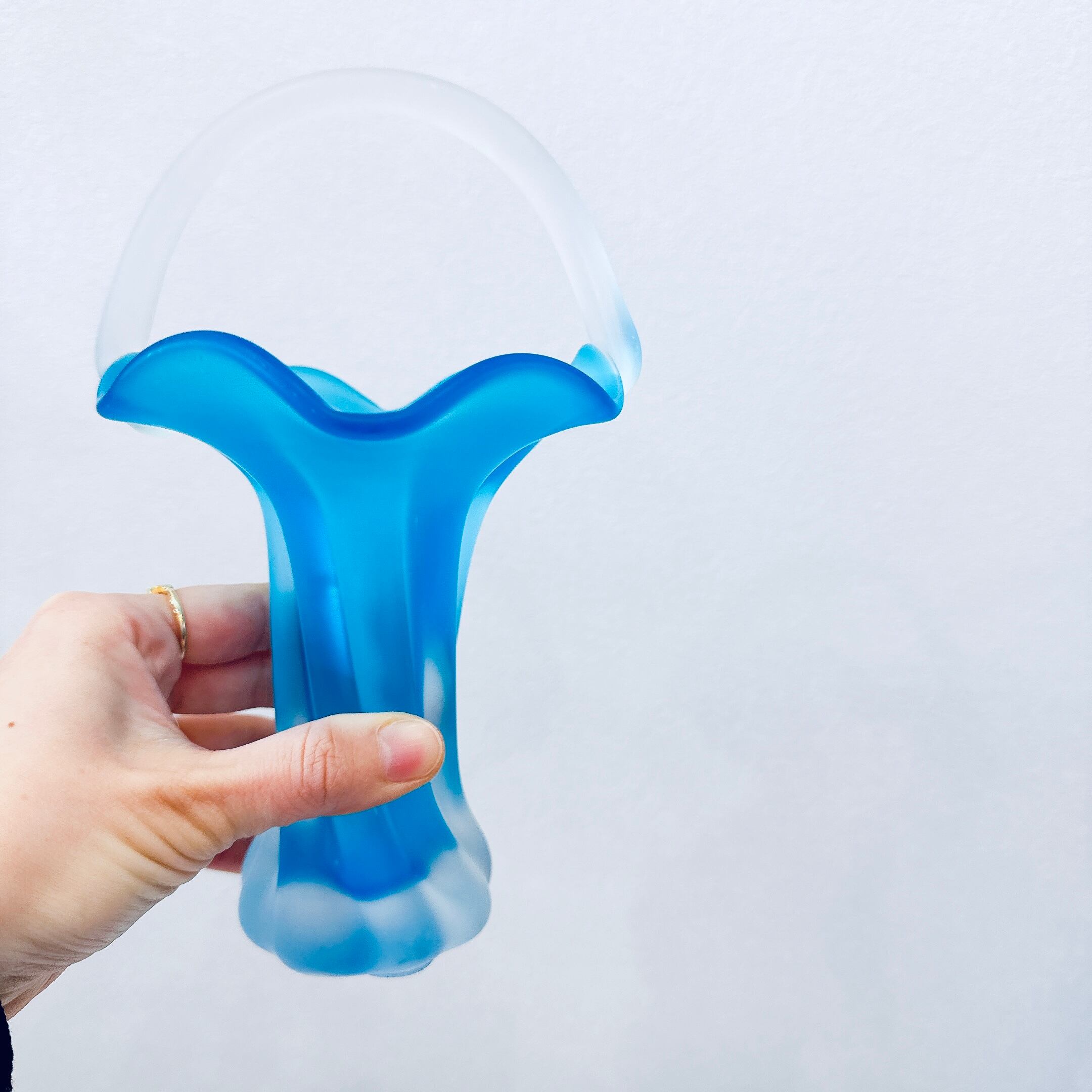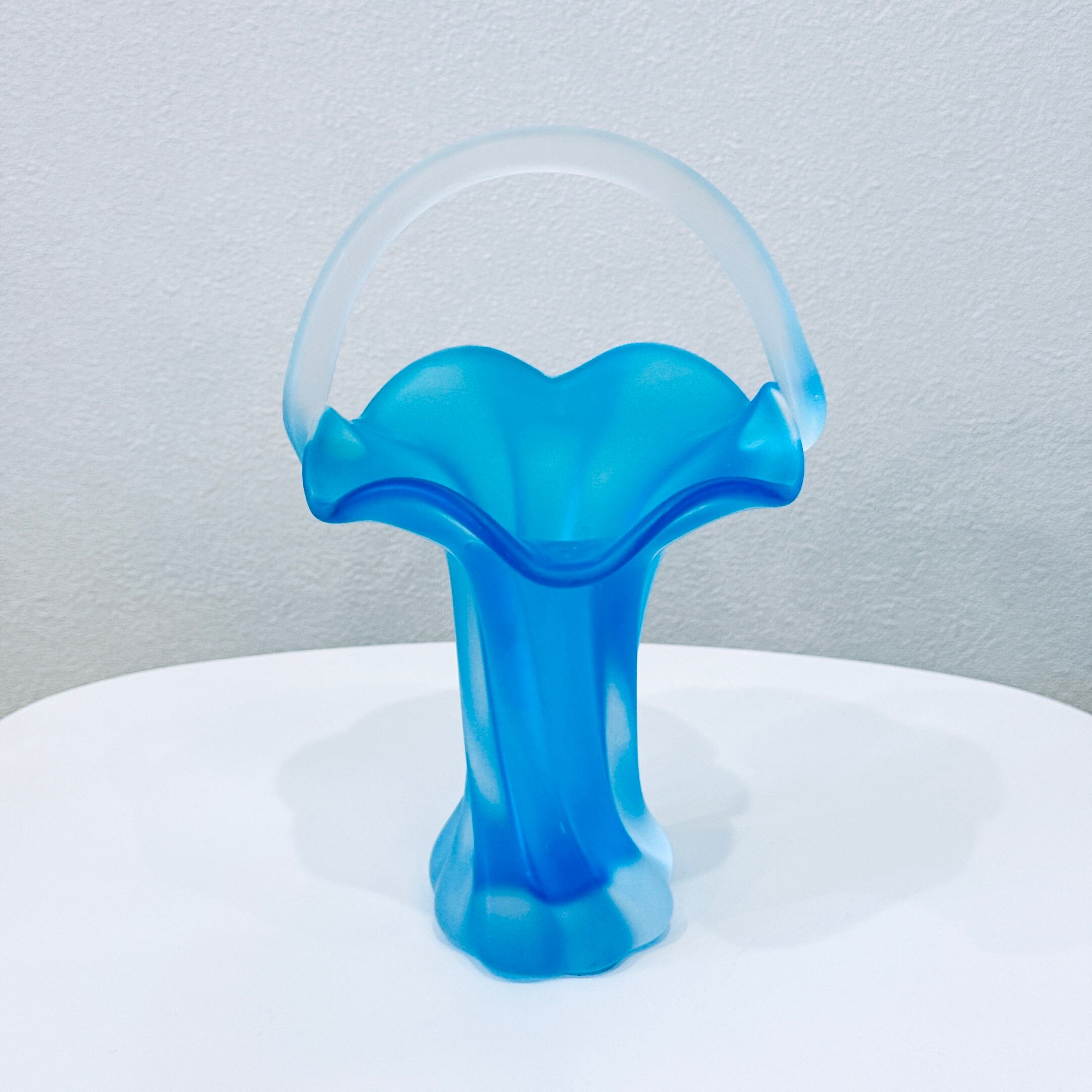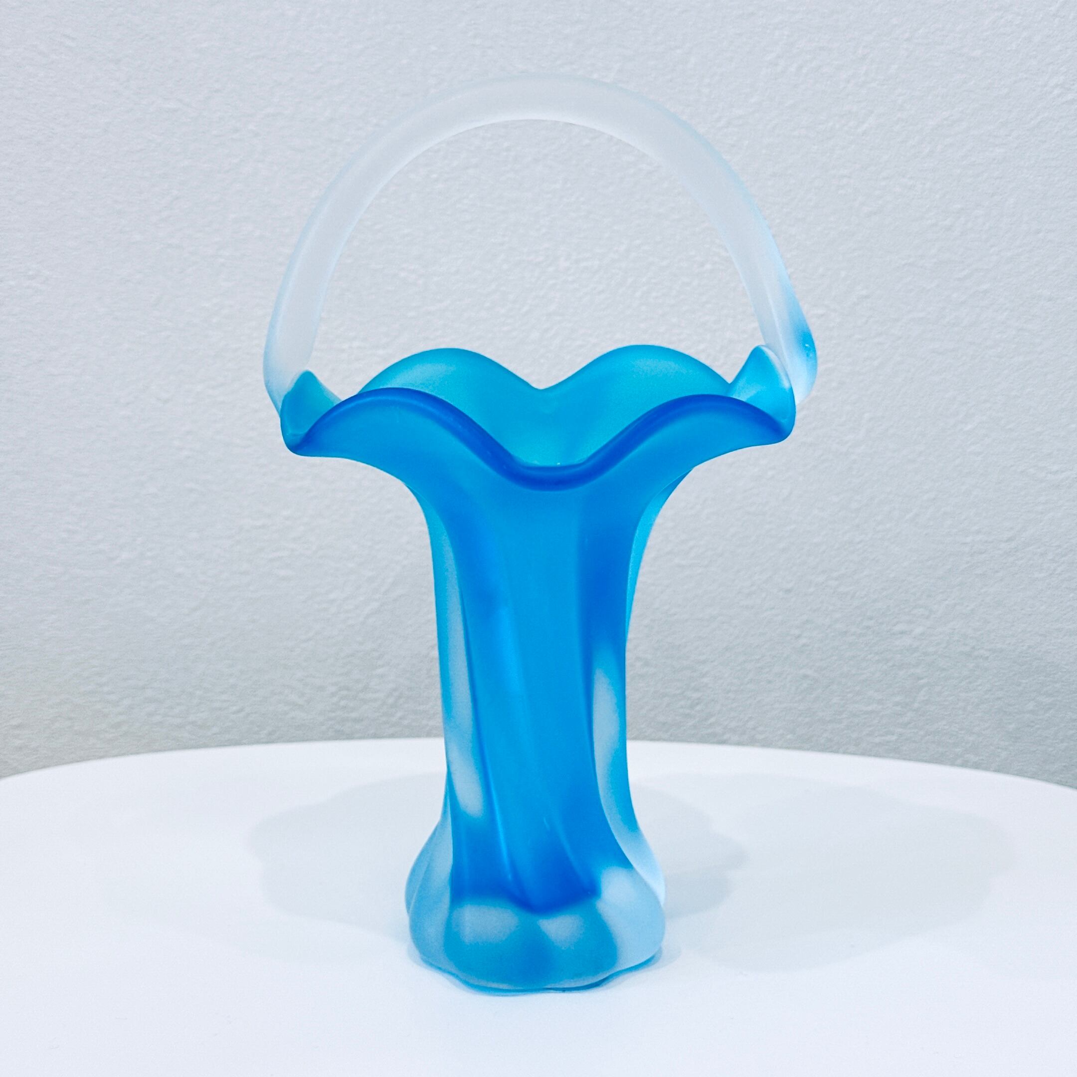 持ち手とフリルが可愛い、ガラス製のヴィンテージフラワーベースです。1点ものになります。