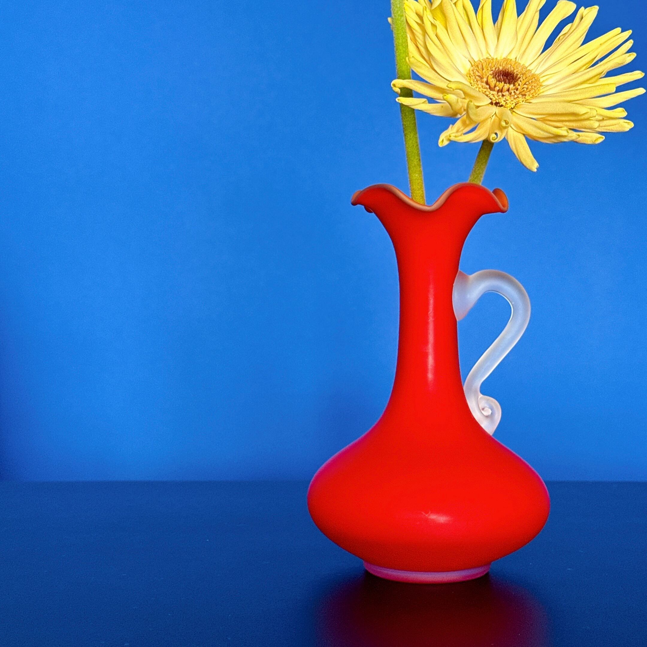 持ち手とフリルの口が可愛い、昭和レトロなガラス製ヴィンテージフラワーベースです。1点ものになります。