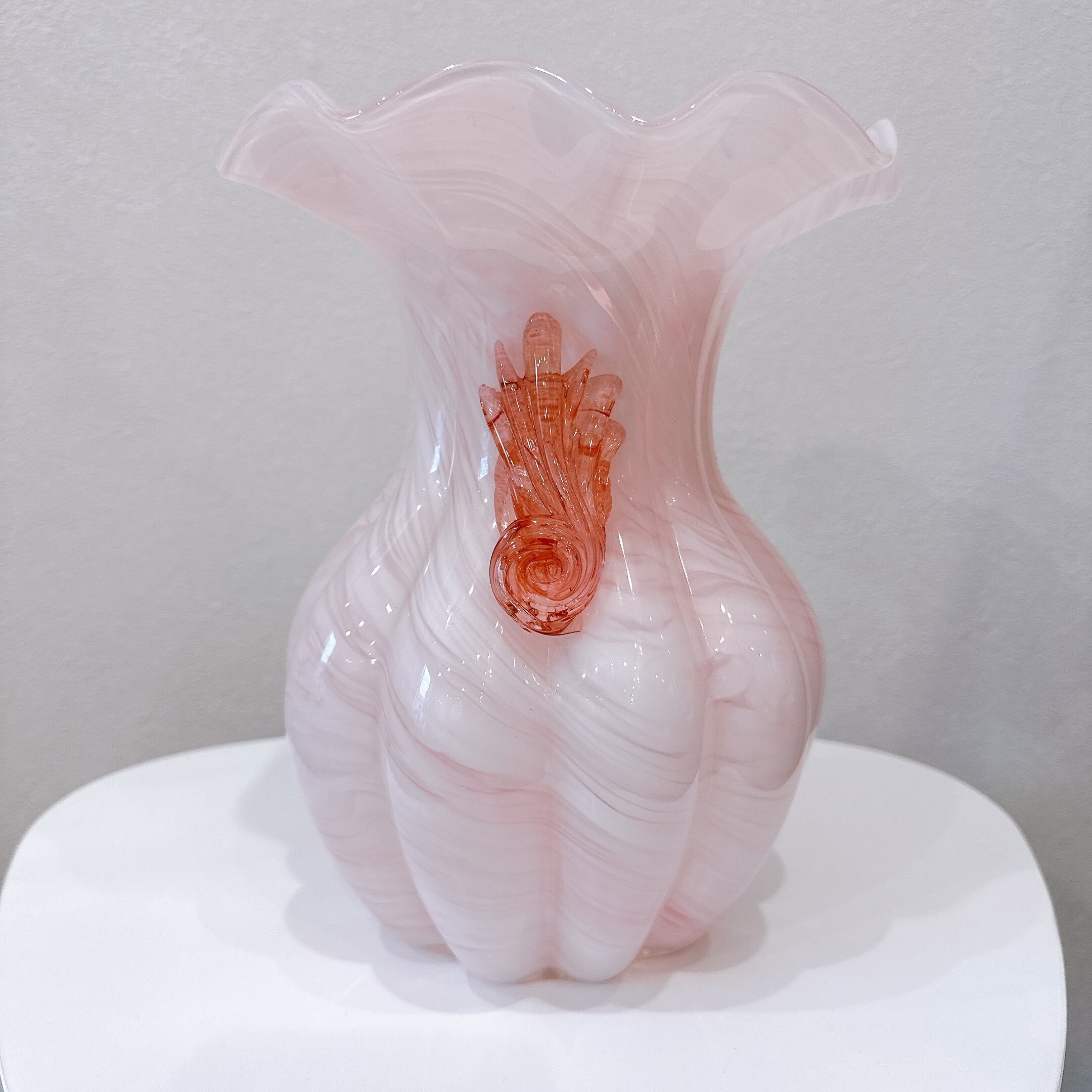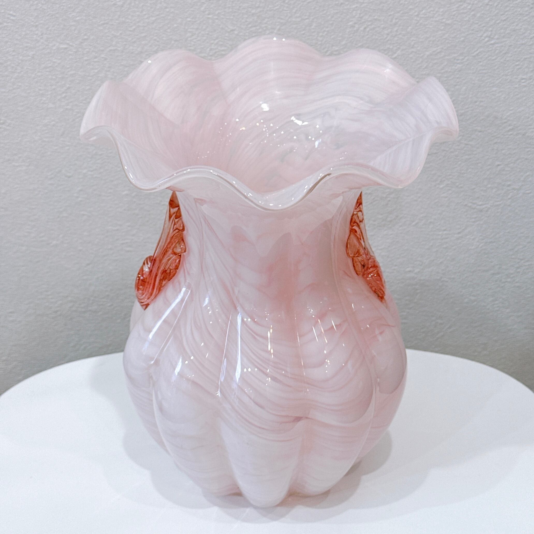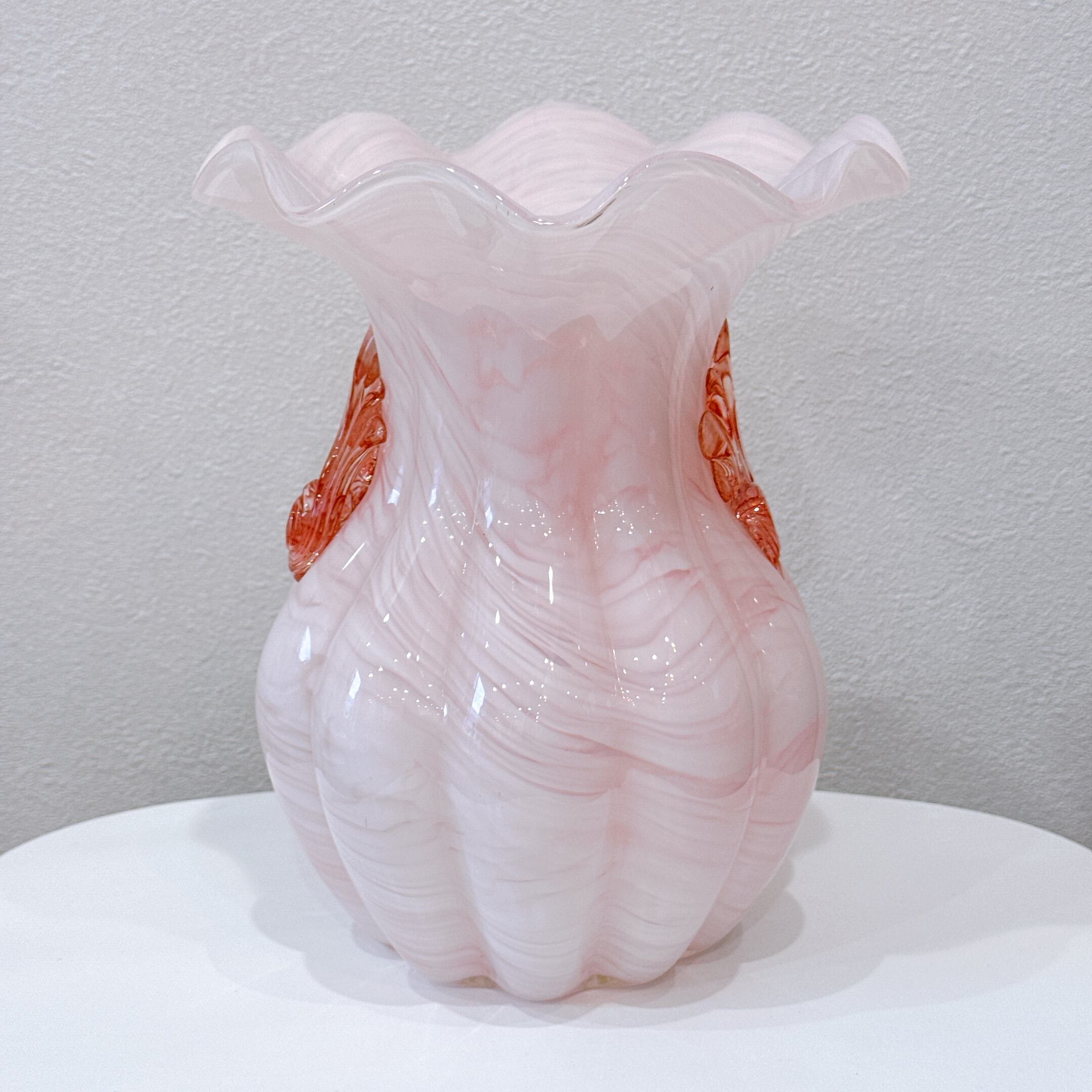 フリルの口と両サイドの貝殻モチーフの飾りが可愛い、ガラス製のヴィンテージフラワーベースです。1点ものになります。