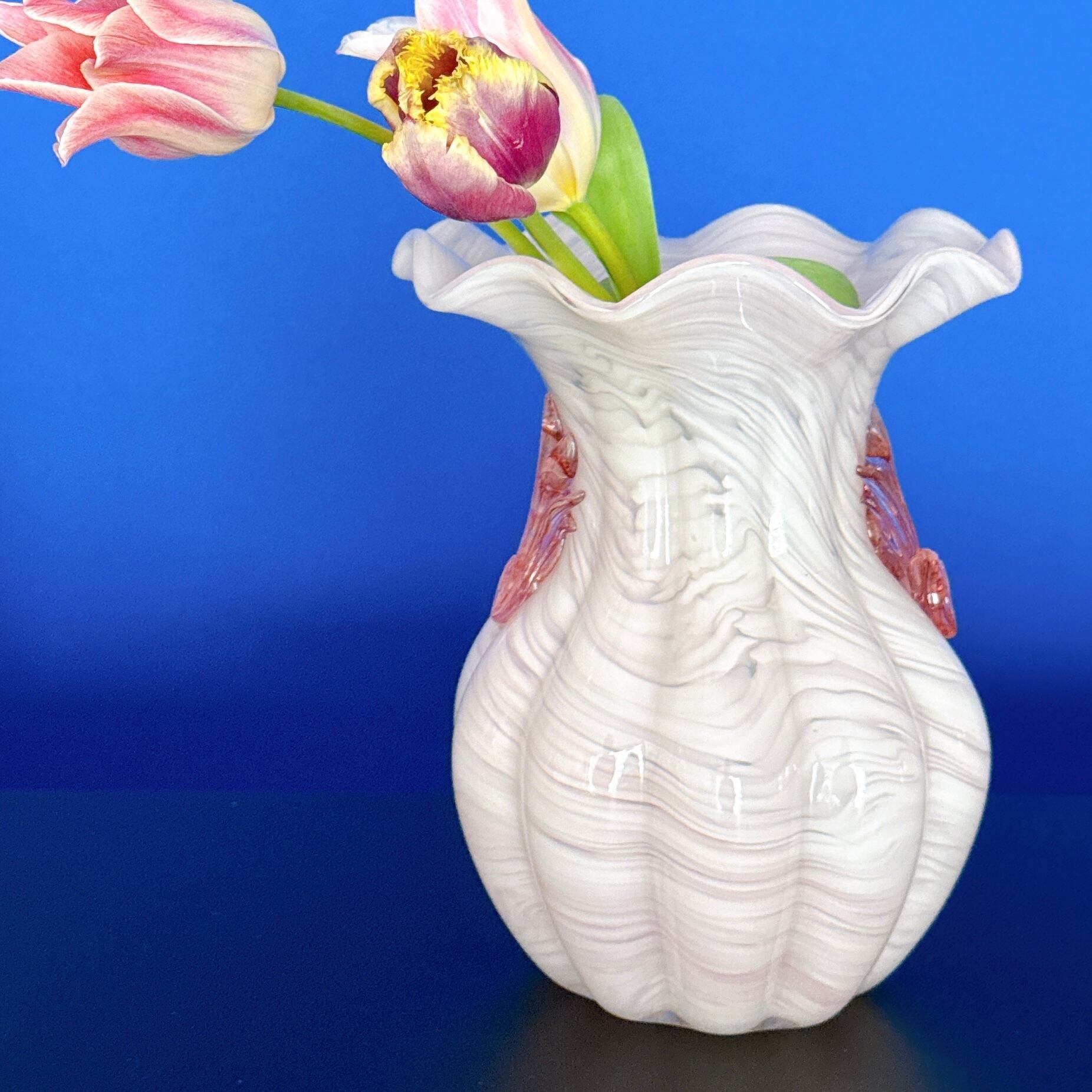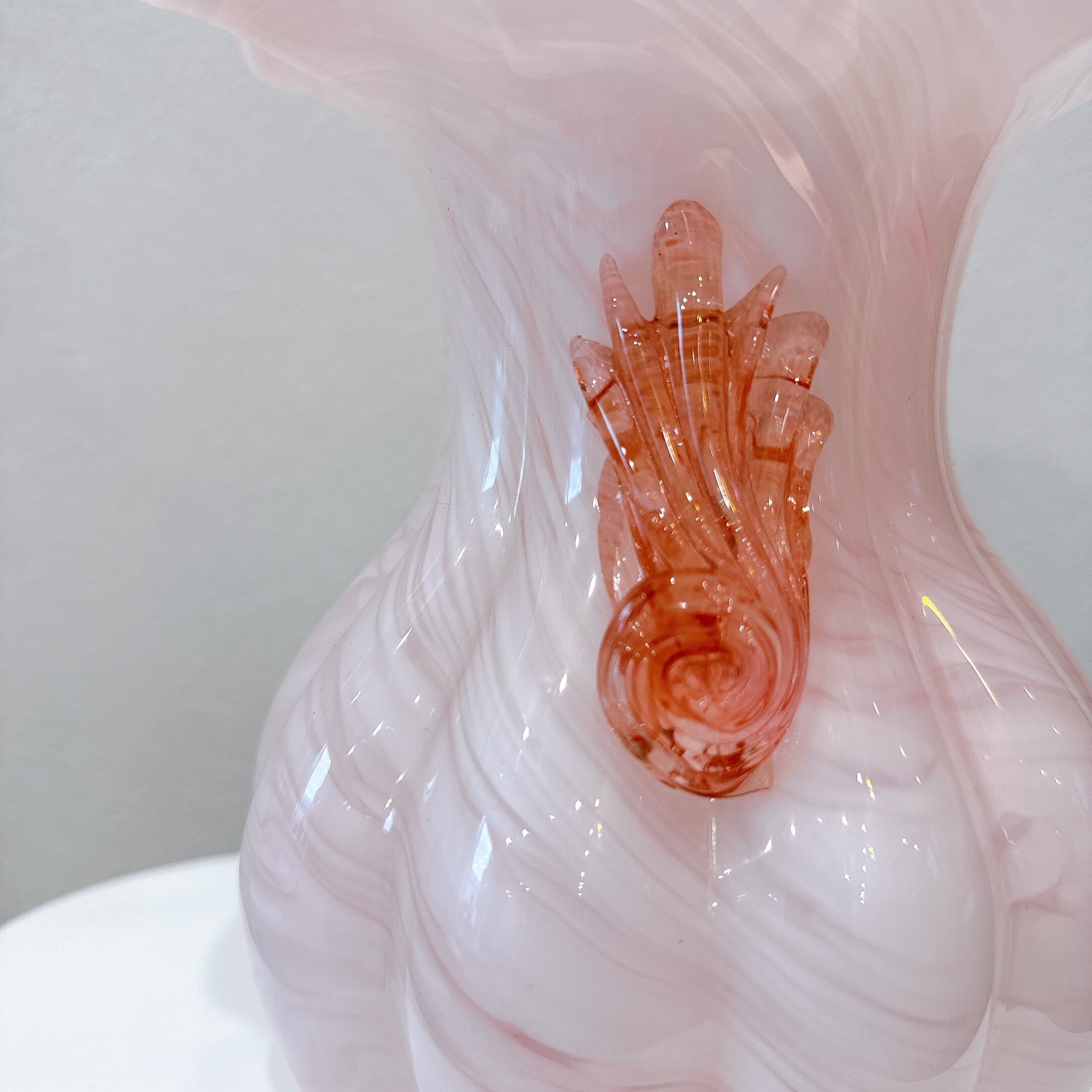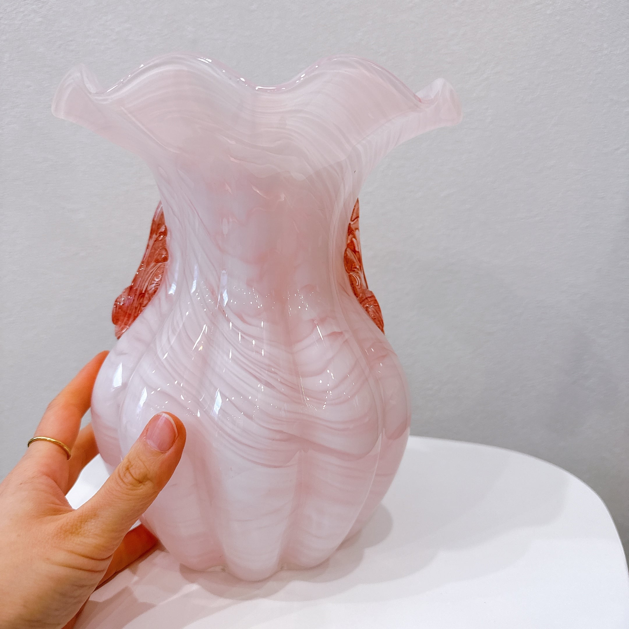 フリルの口と両サイドの貝殻モチーフの飾りが可愛い、ガラス製のヴィンテージフラワーベースです。1点ものになります。