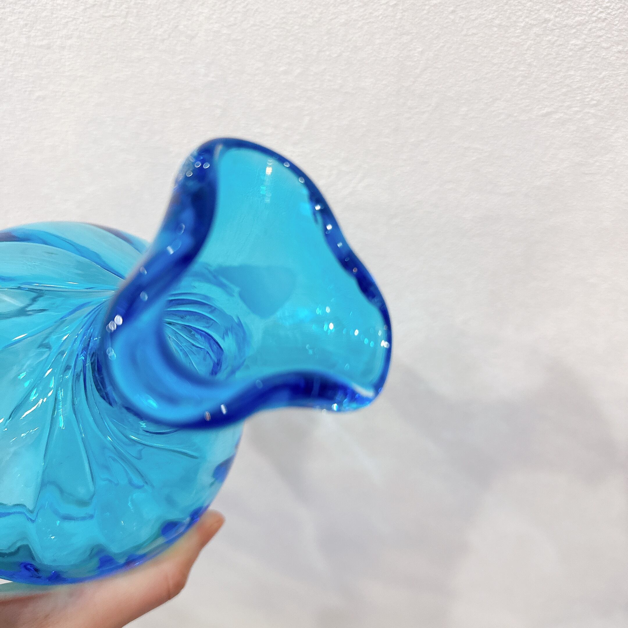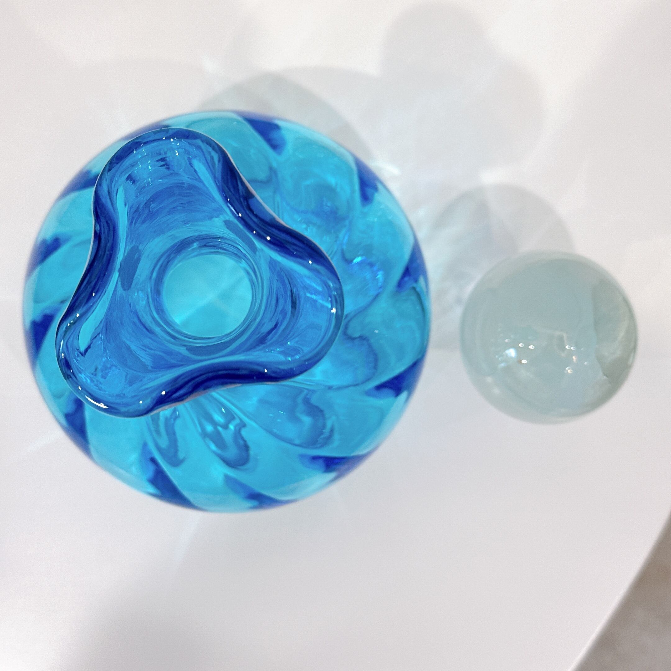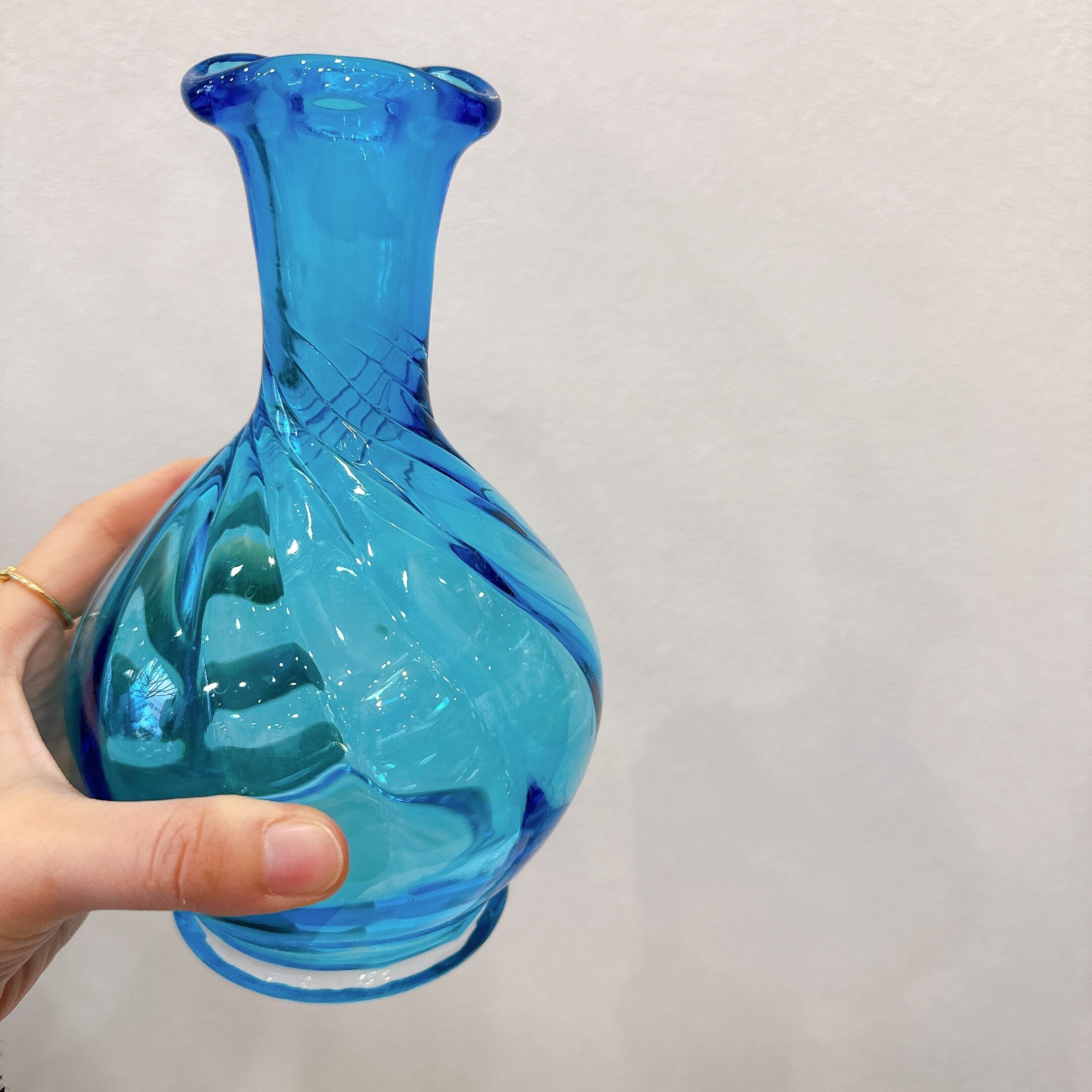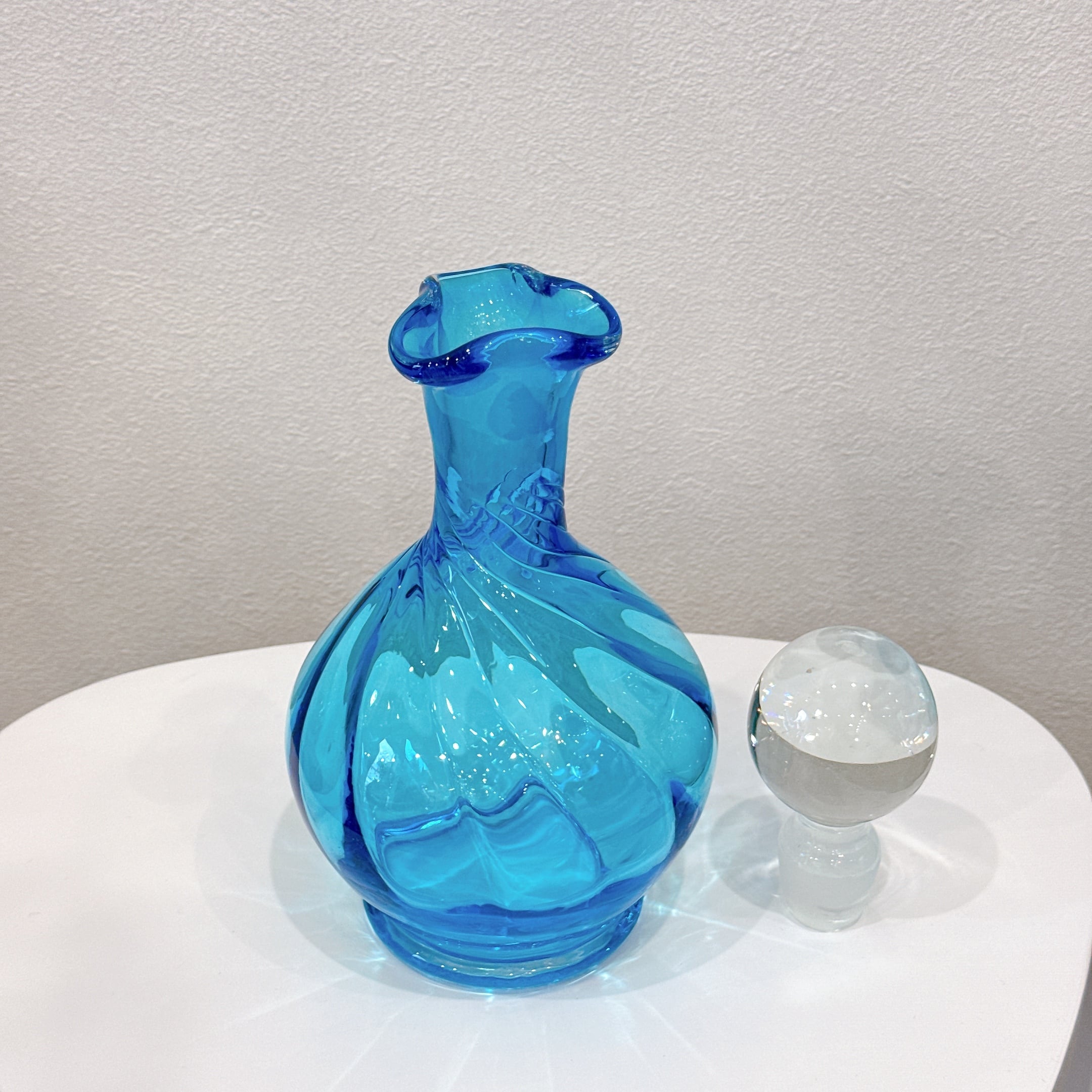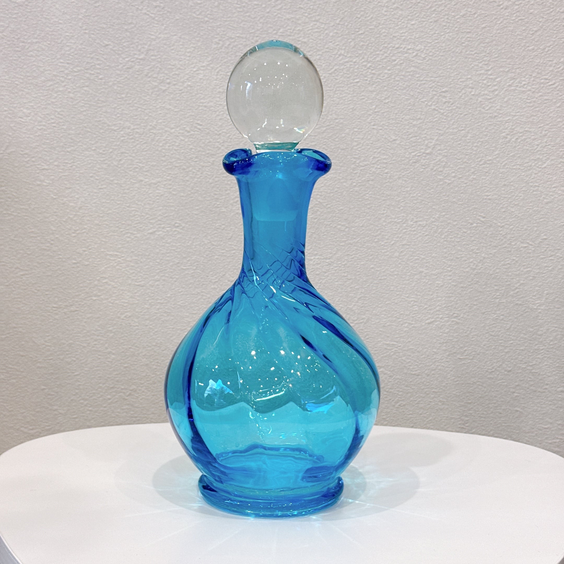 スパイラルの模様が美しい、昭和レトロなヴィンテージのデキャンタになりますので、ガラスの蓋付きです。蓋が擦れる部分が白い跡になっておりますので、あらかじめご了承下さいませ。