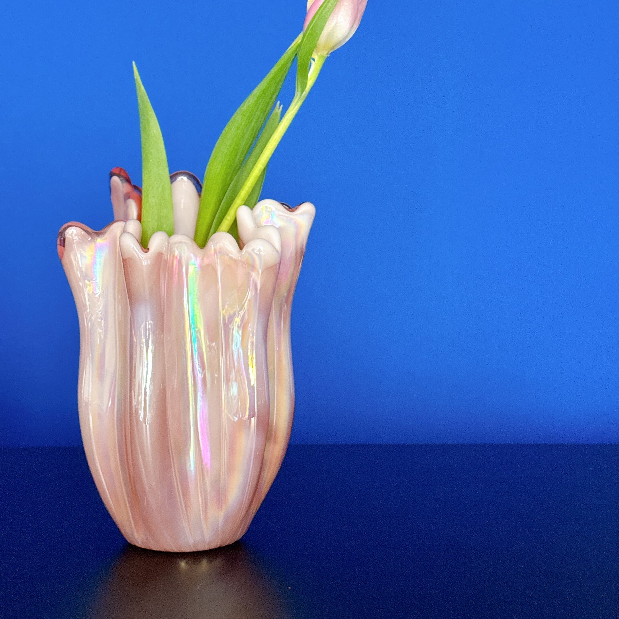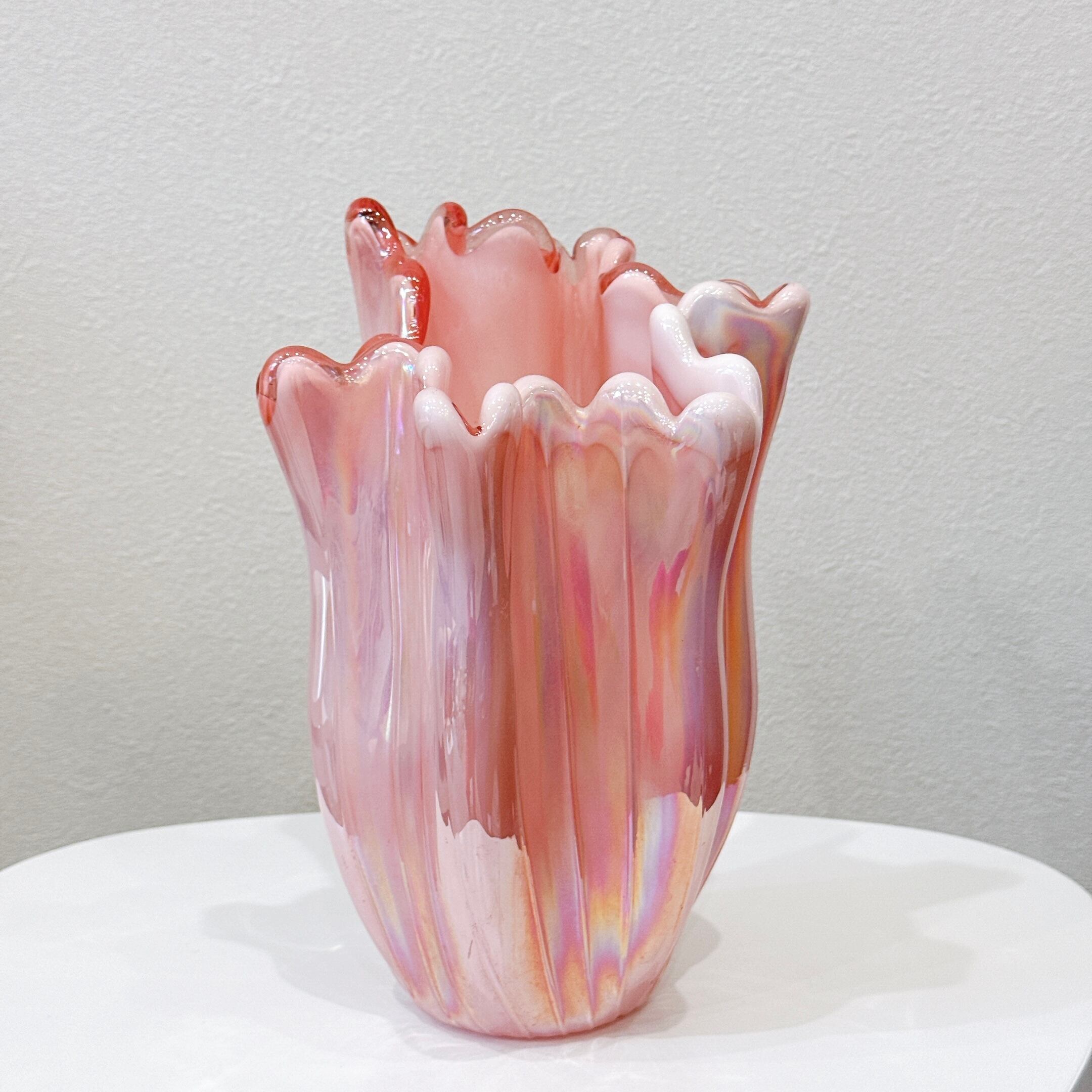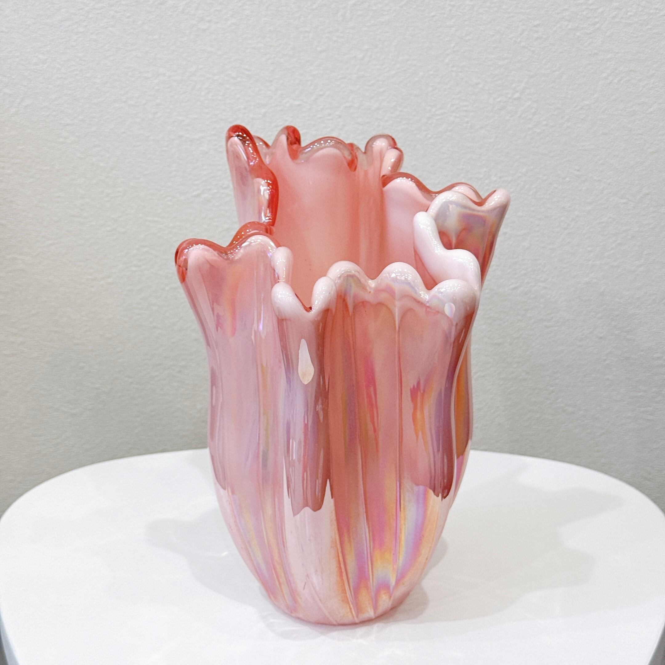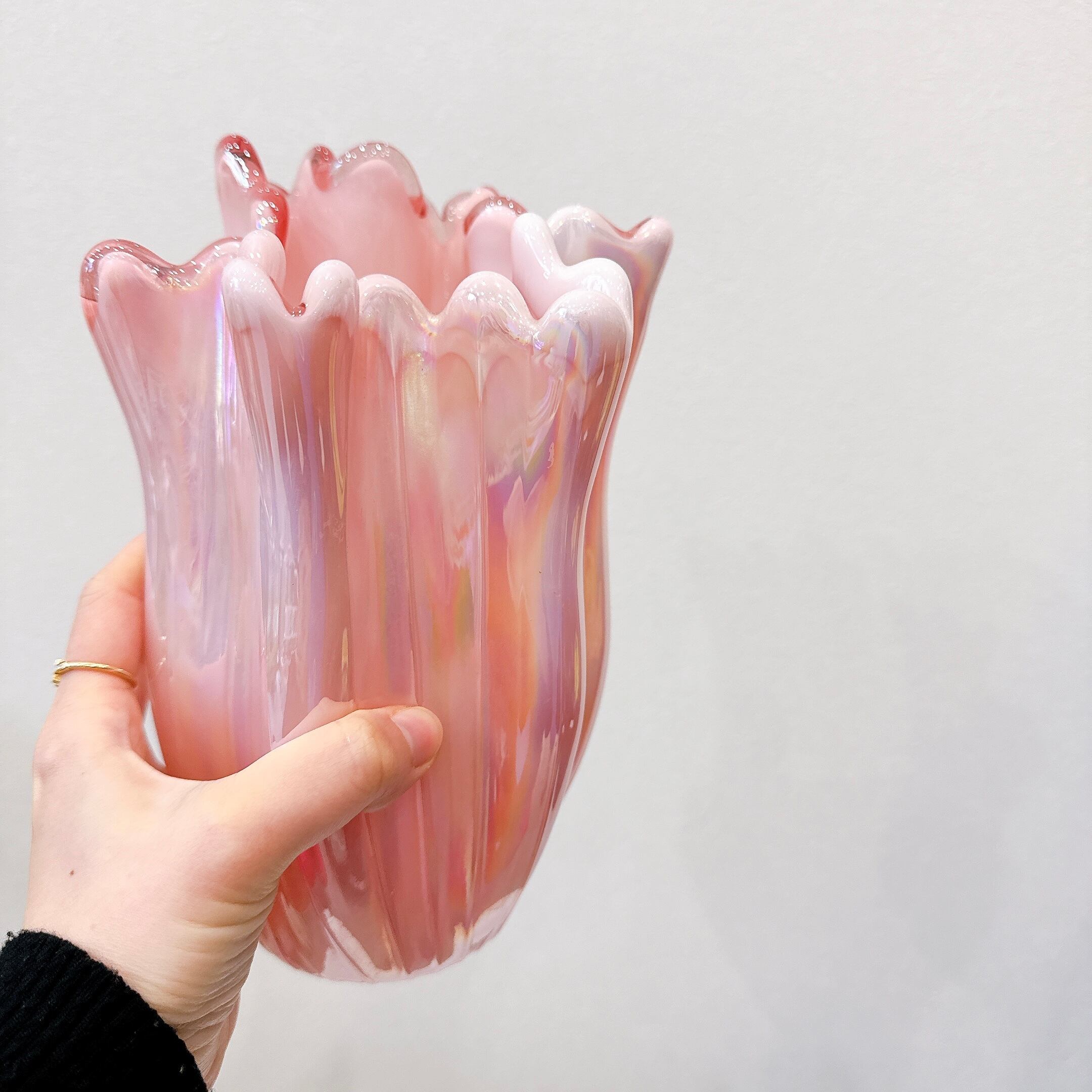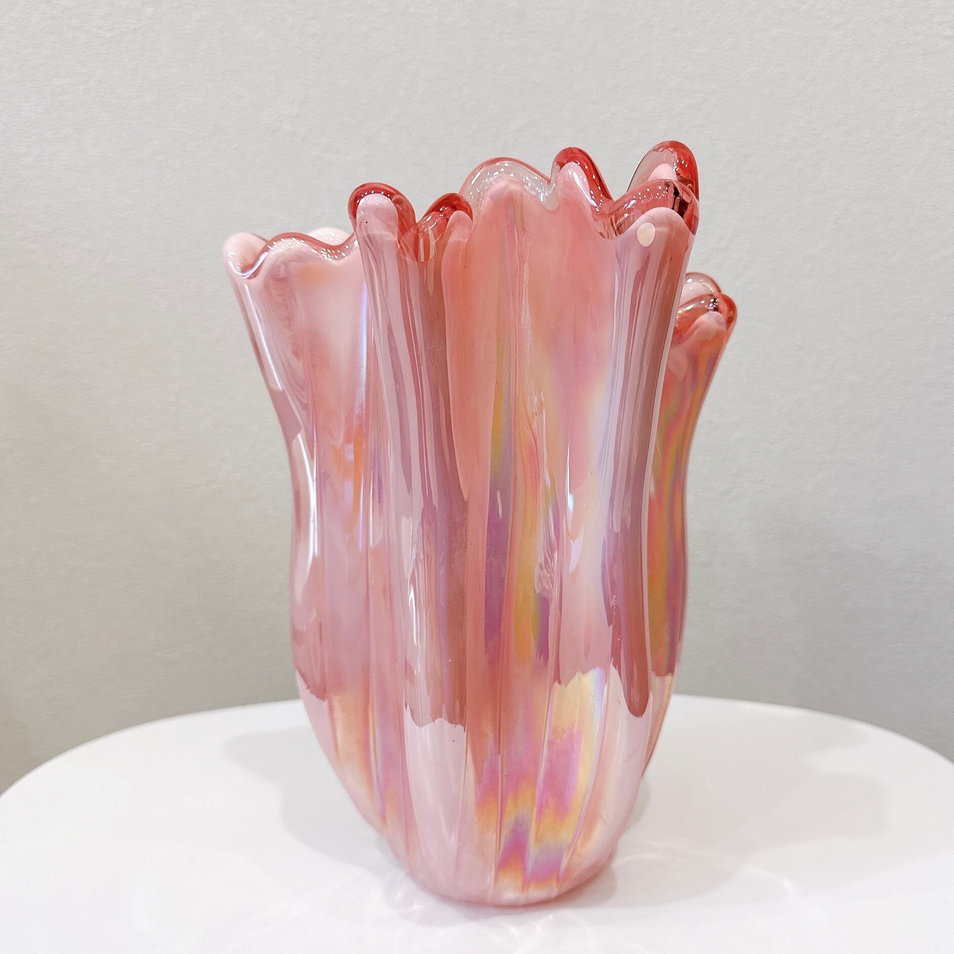 ピンクのオーロラカラーとフリルが可愛い、昭和レトロなヴィンテージフラワーベースです。1点ものになります。