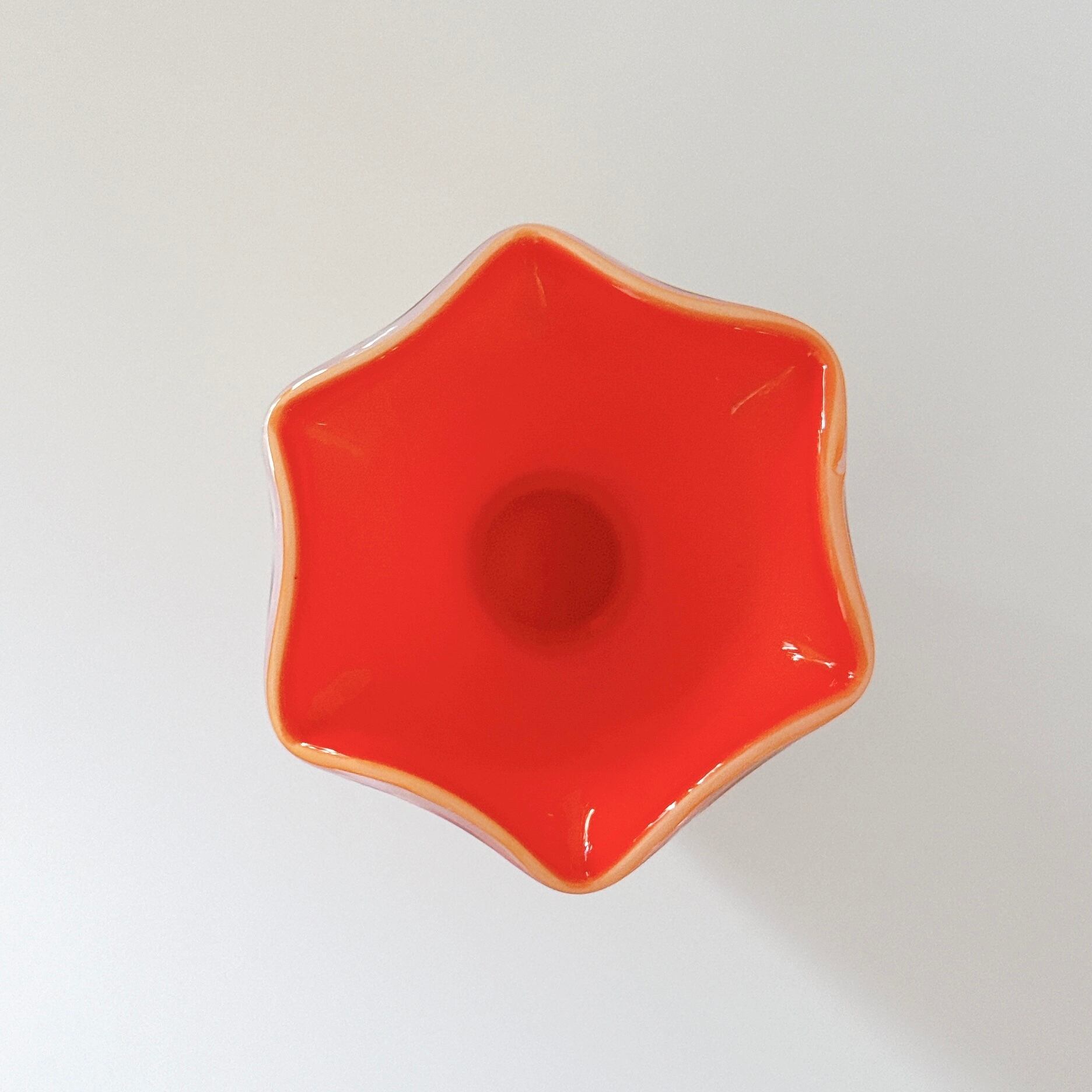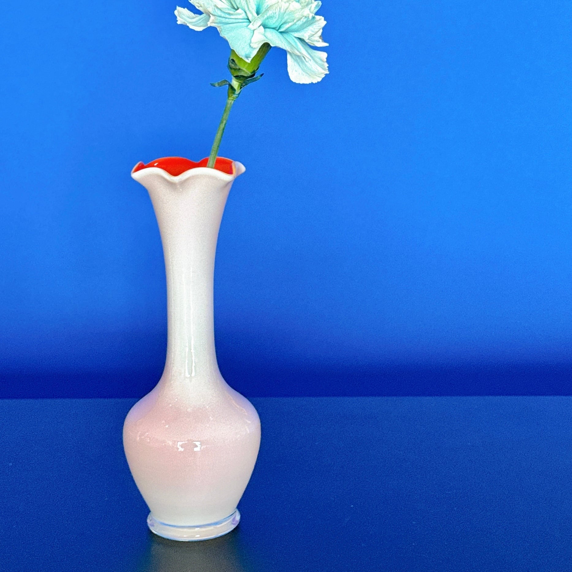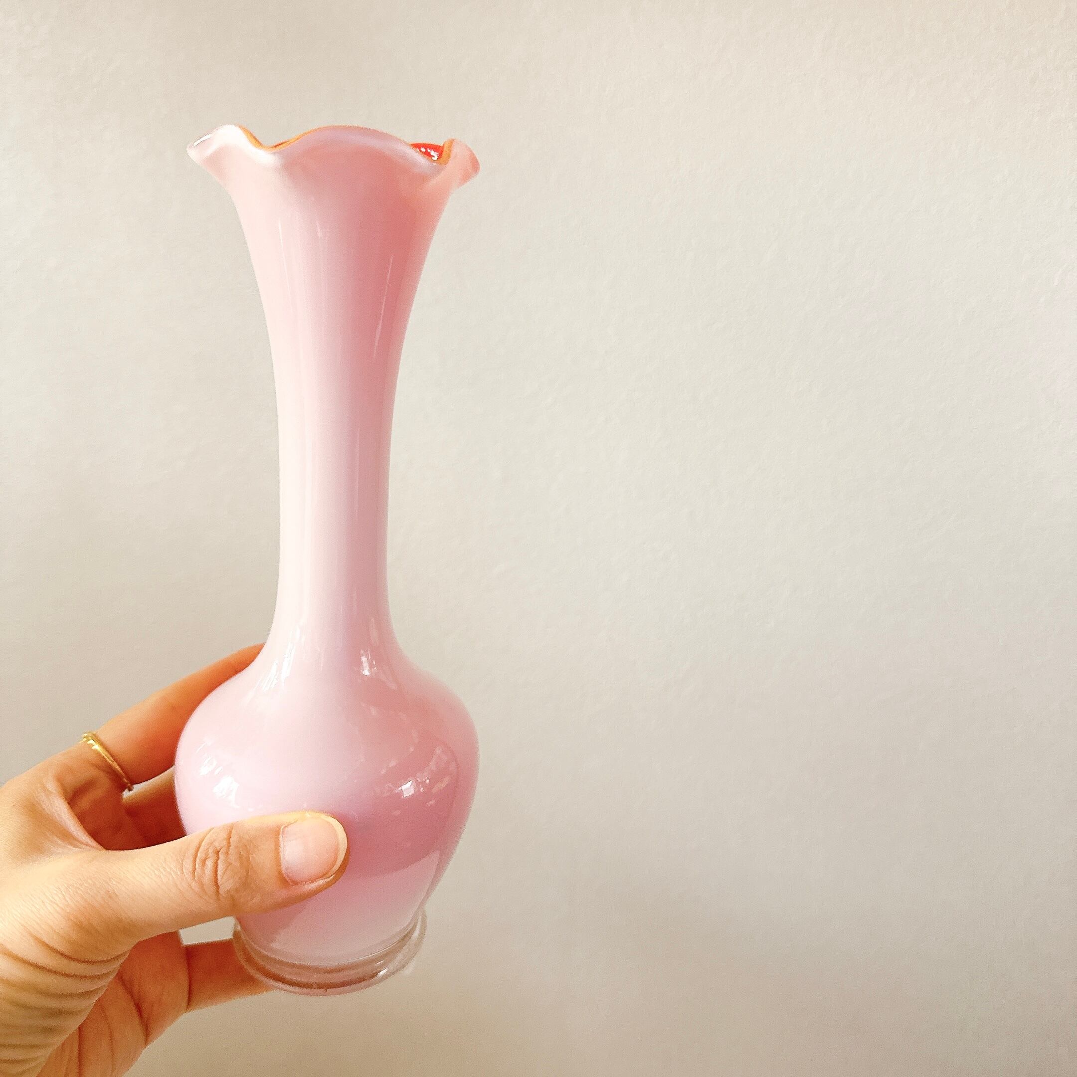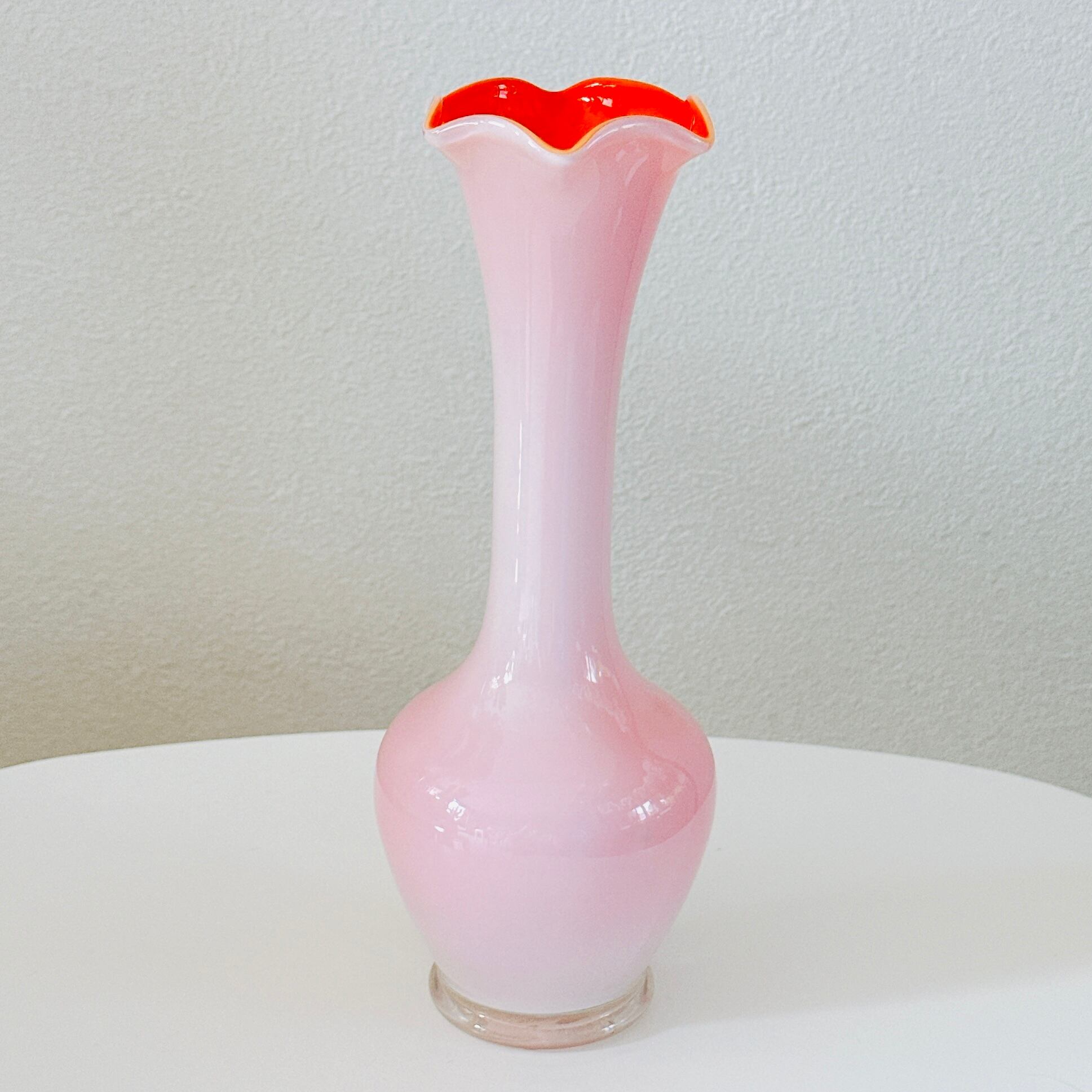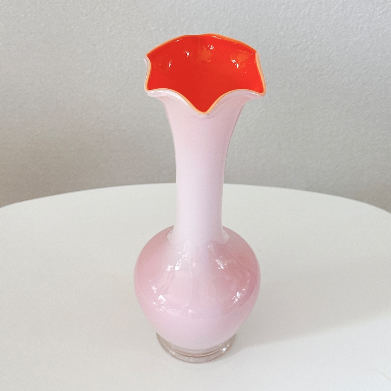 外側は乳白色、内側はサーモンピンクになっていて、外側からピンク色が透けて見えます。その薄いピンクがとても上品で可愛い、昭和レトロなヴィンテージフラワーベースです。1点ものになります。