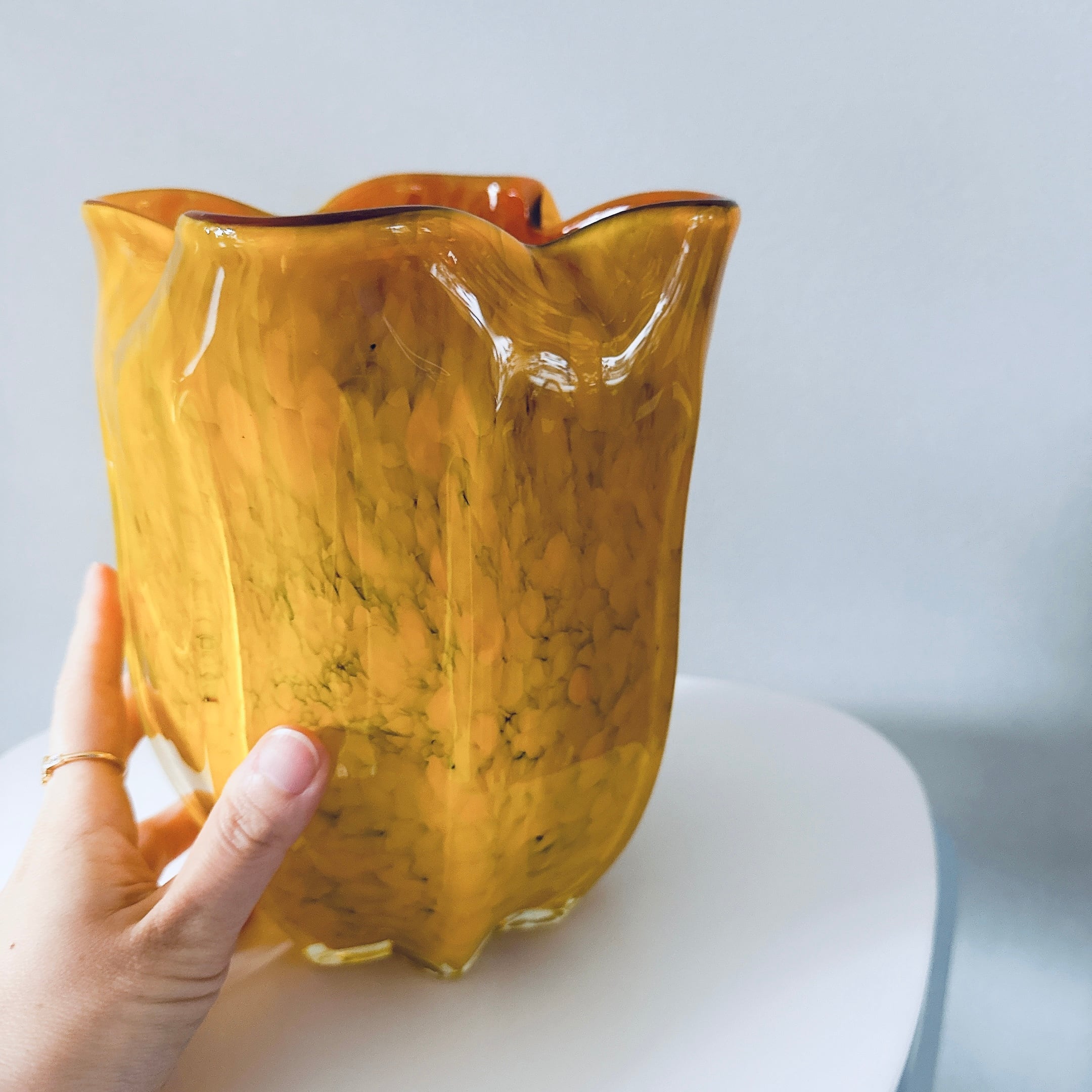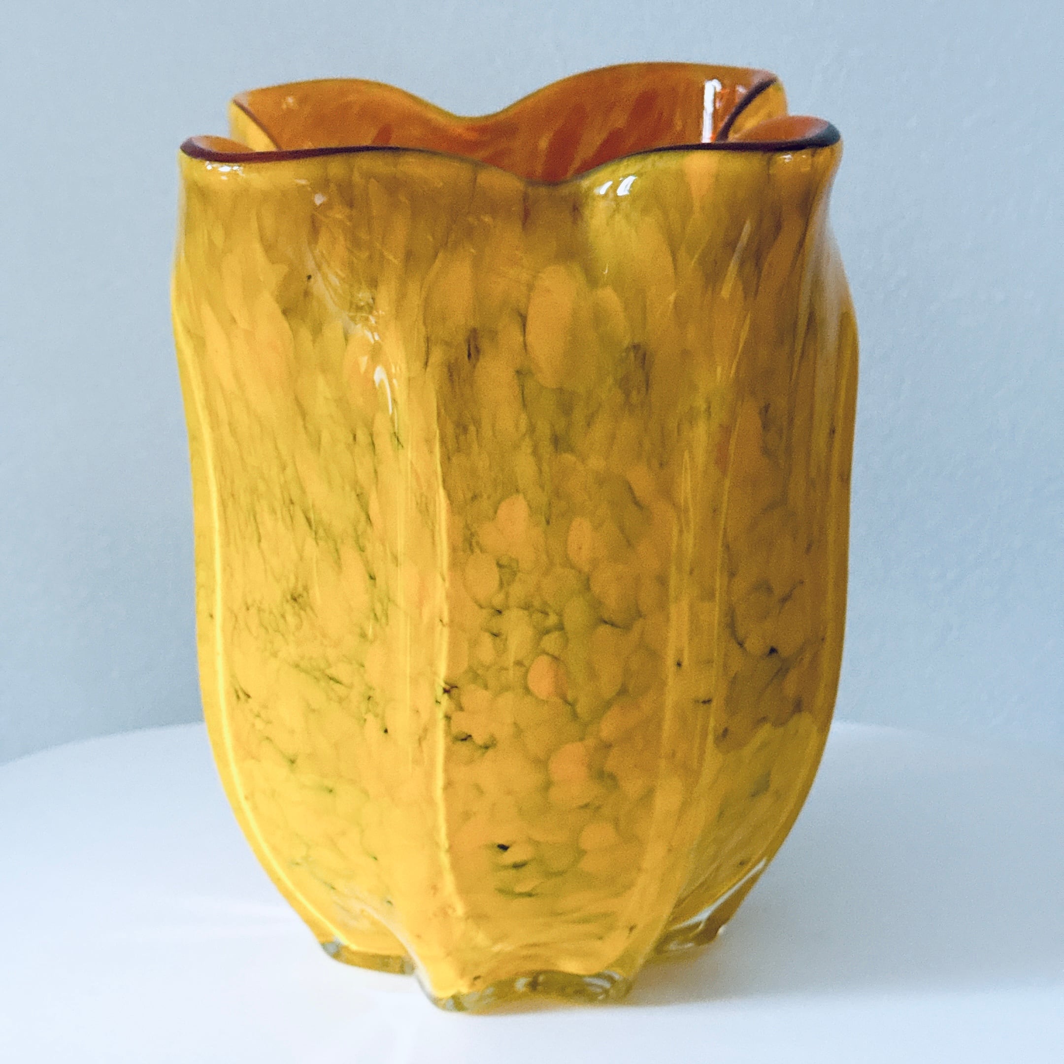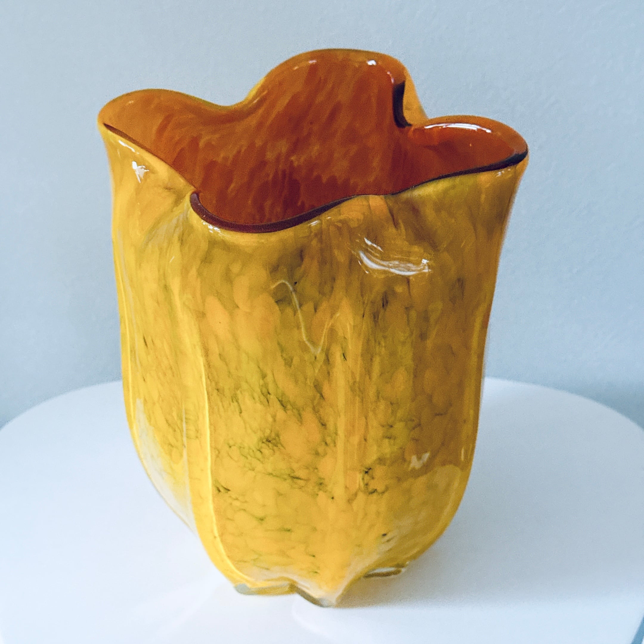 外側が黄色、内側がアンバーのガラス製ヴィンテージフラワーベースです。1点ものになります。