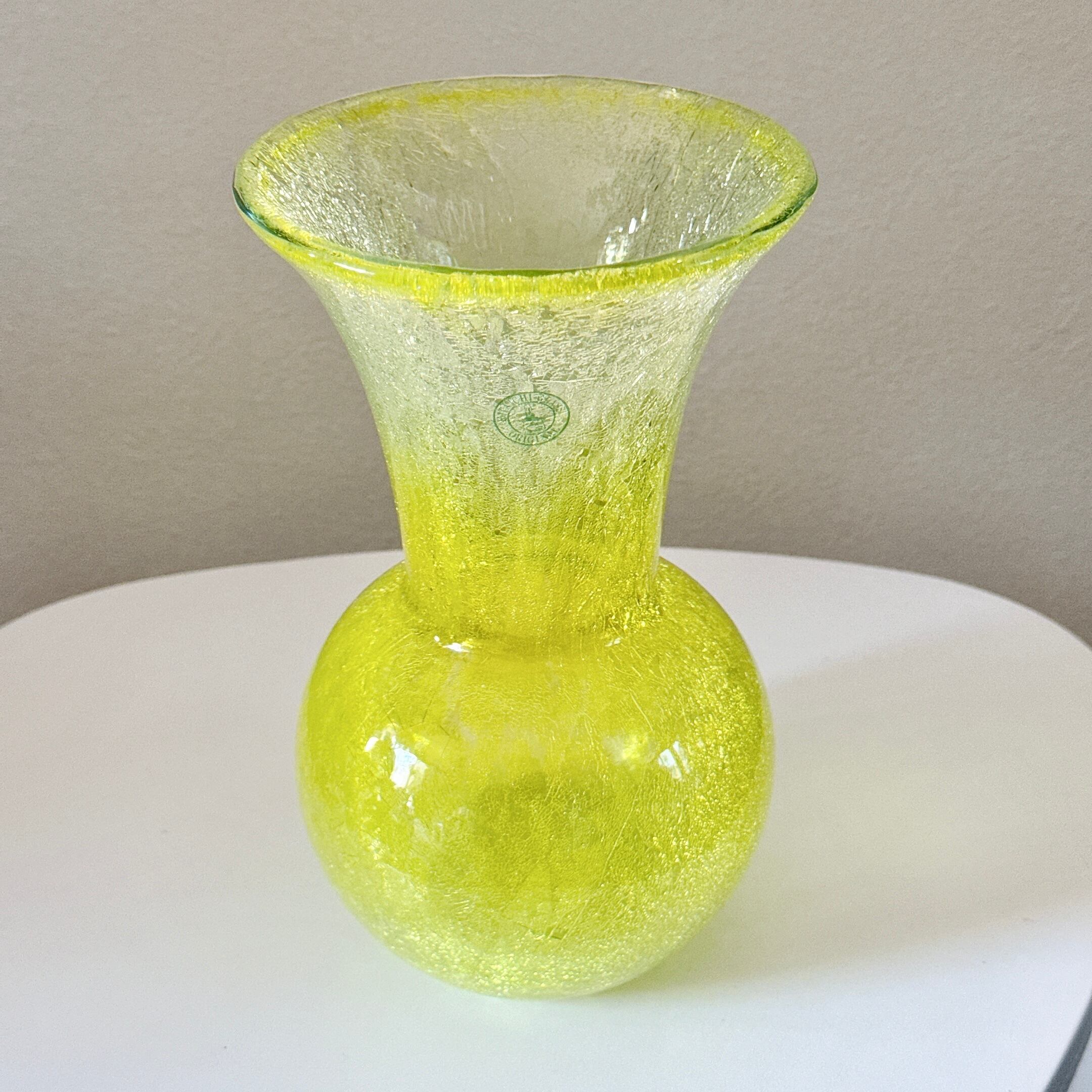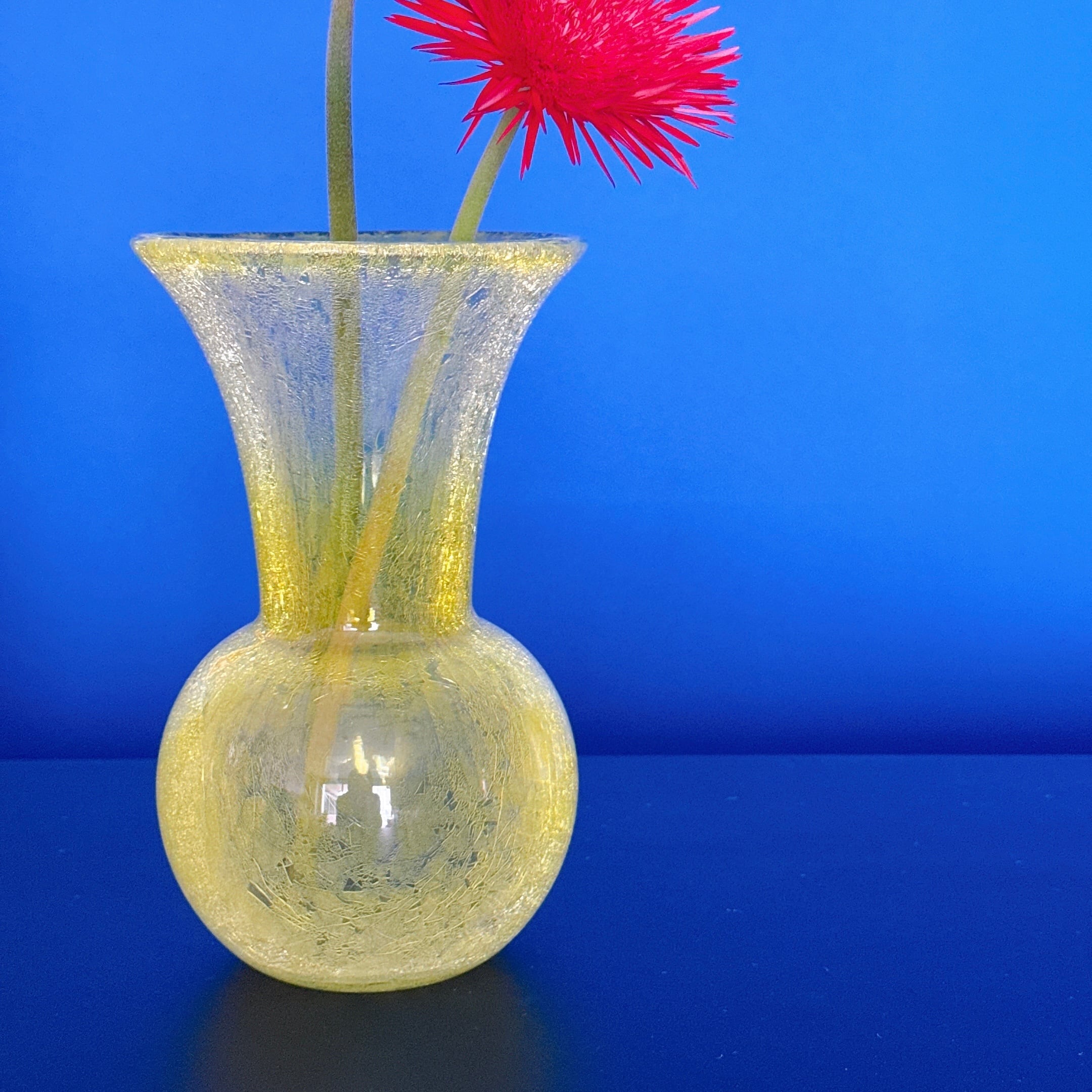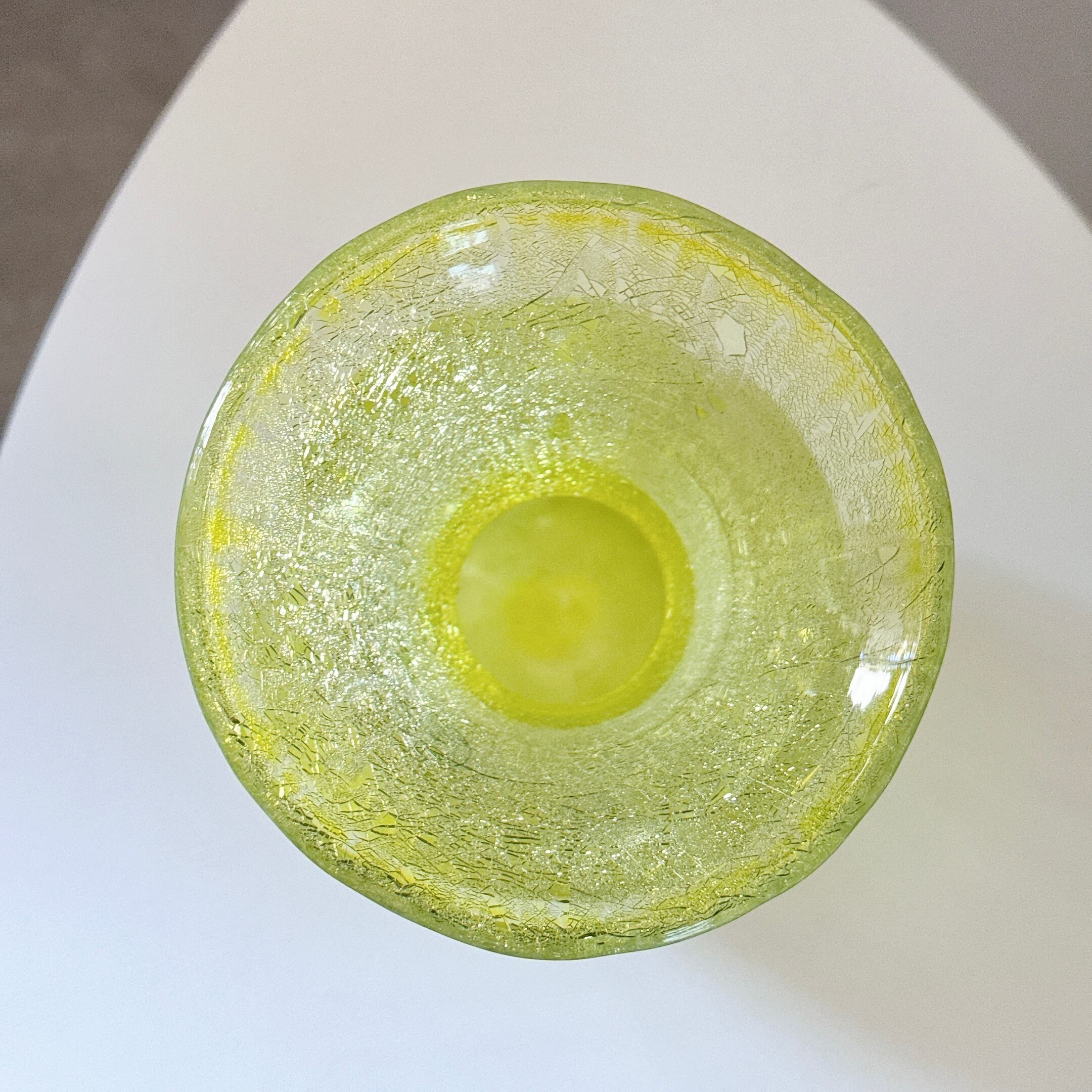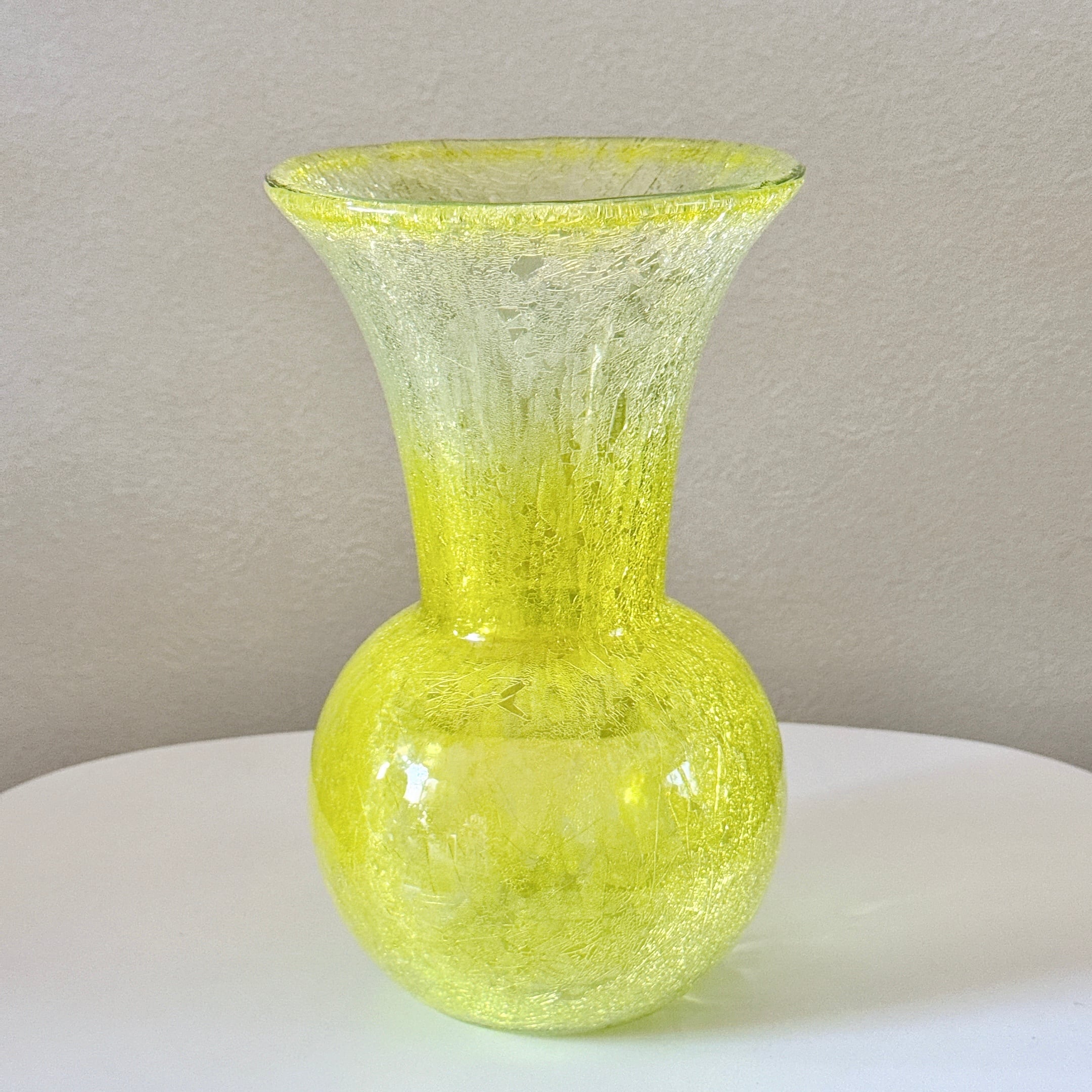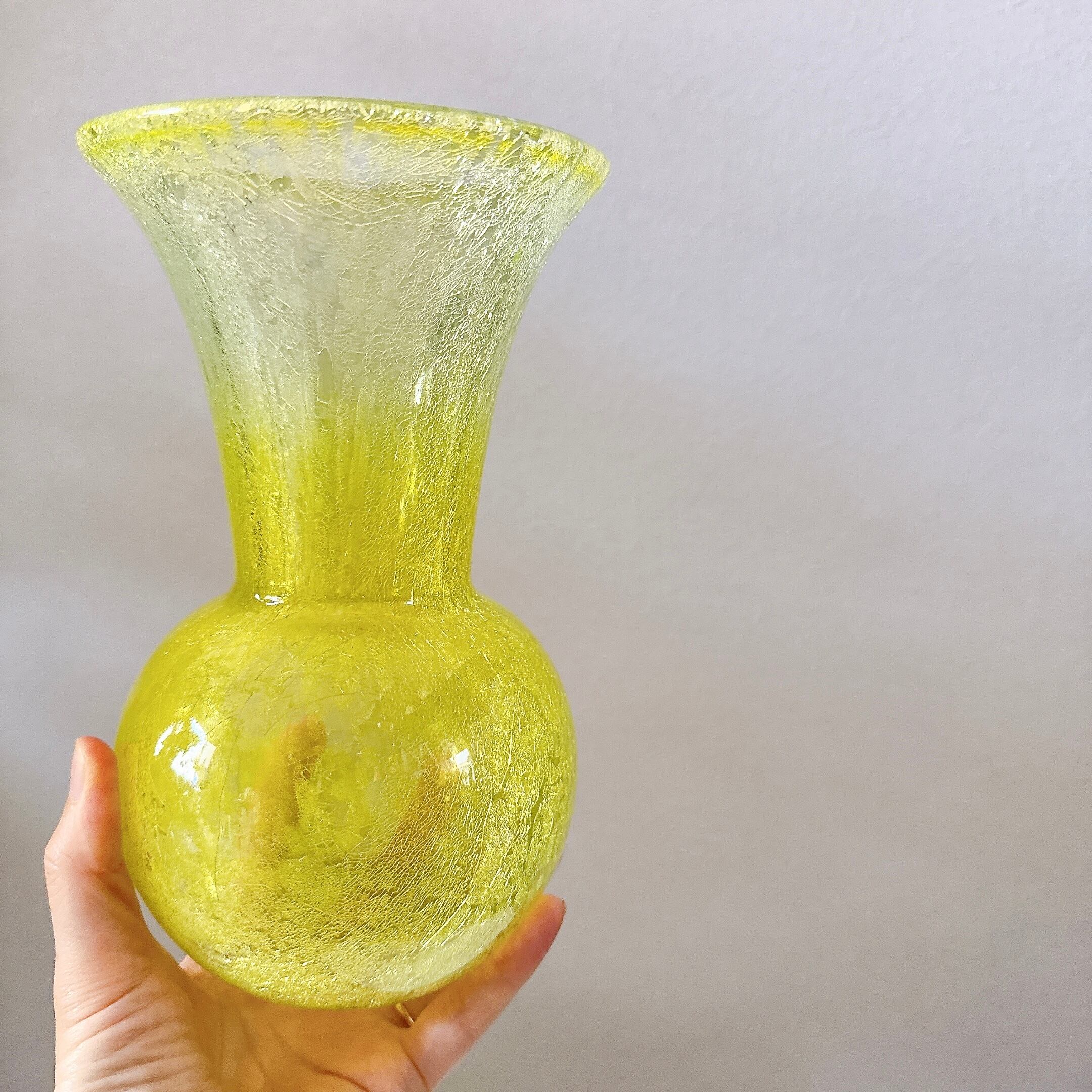 鮮やかなイエローが可愛い、北一硝子のヴィンテージフラワーベースです。1点ものになります。クラックガラスなので、ひび割れ模様はデザインです。