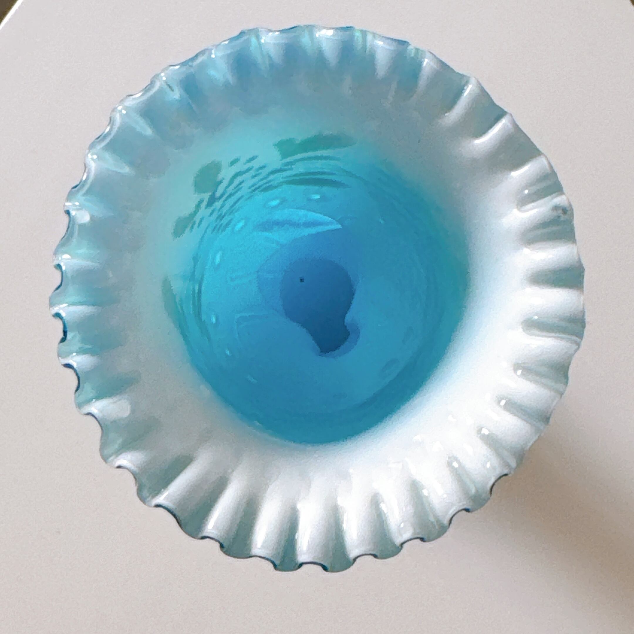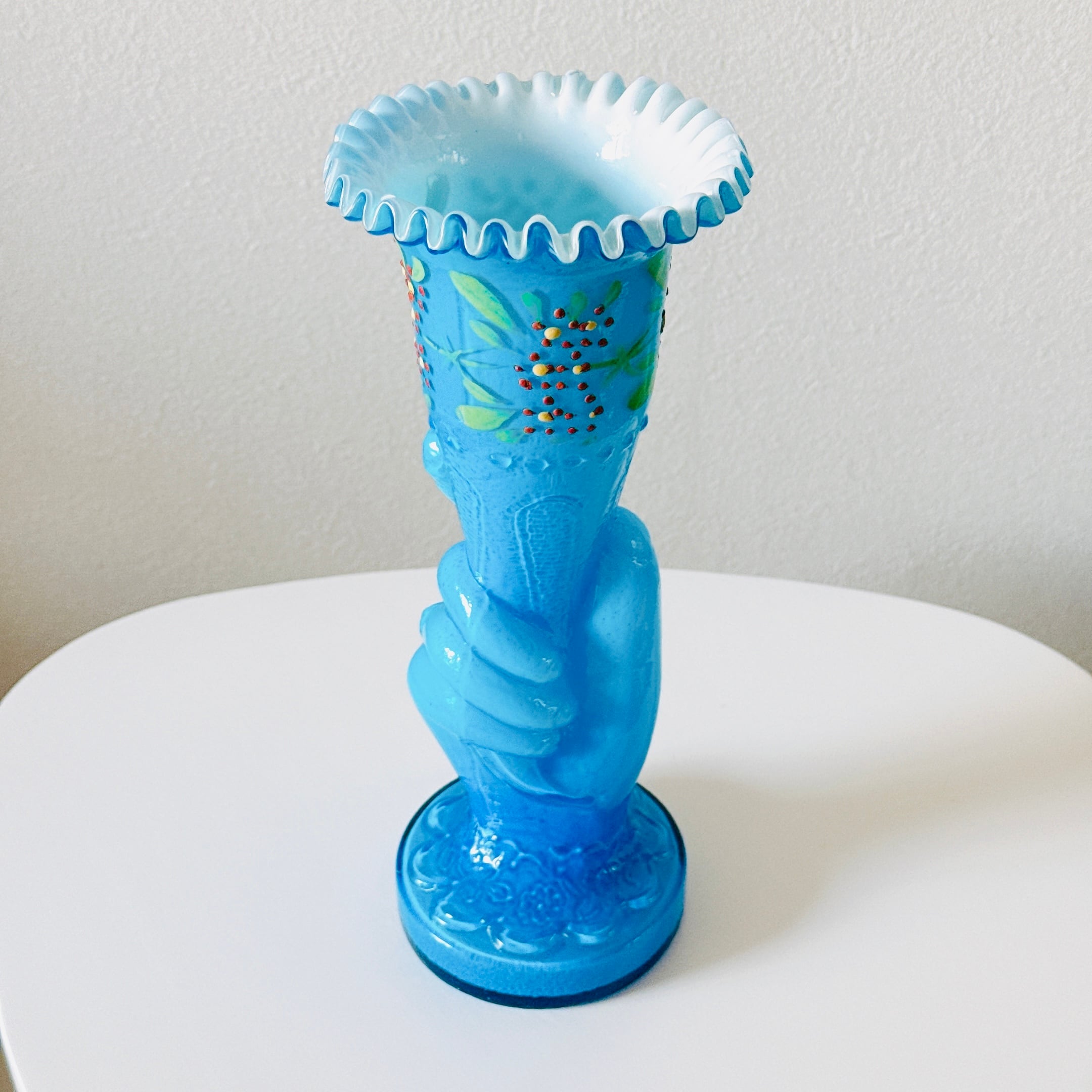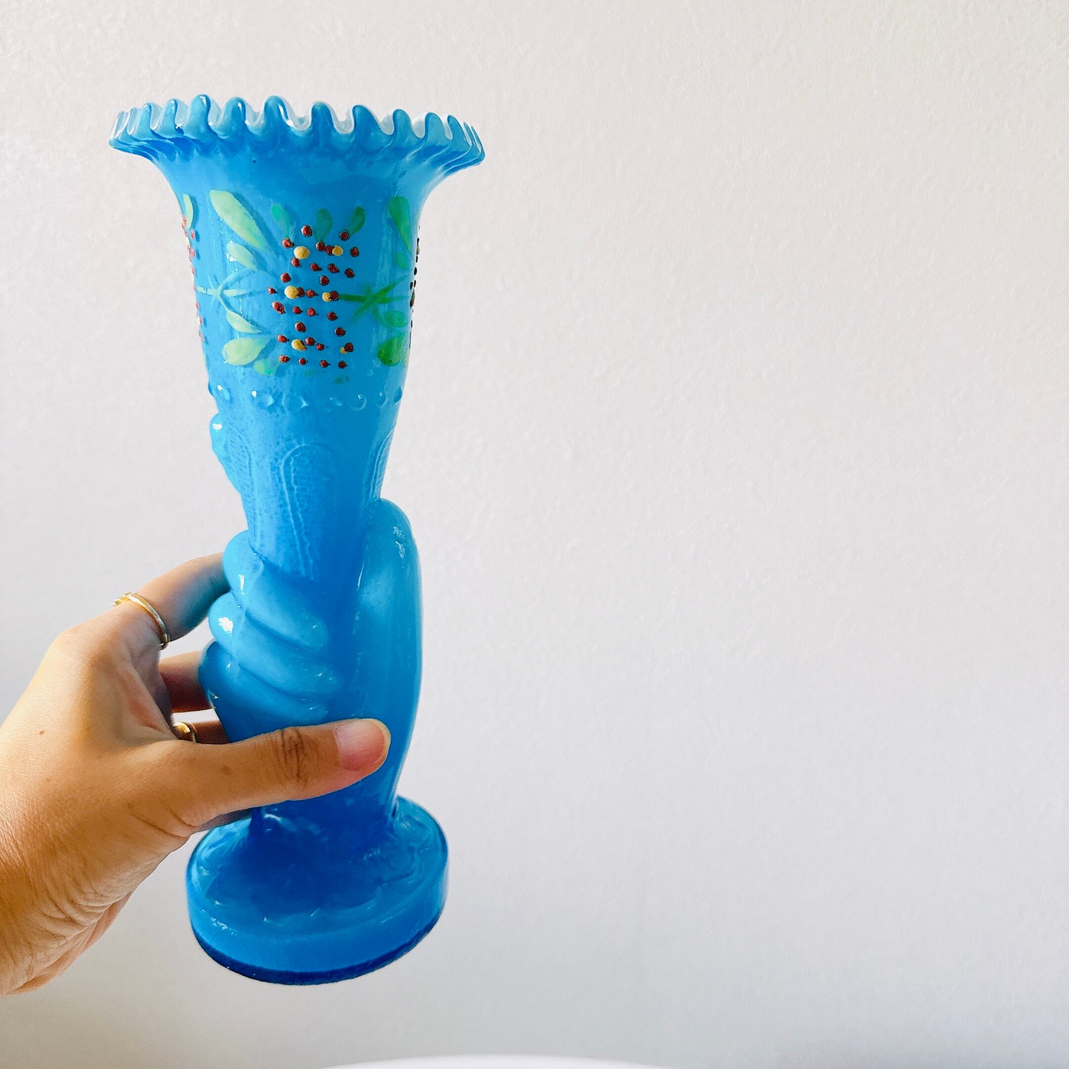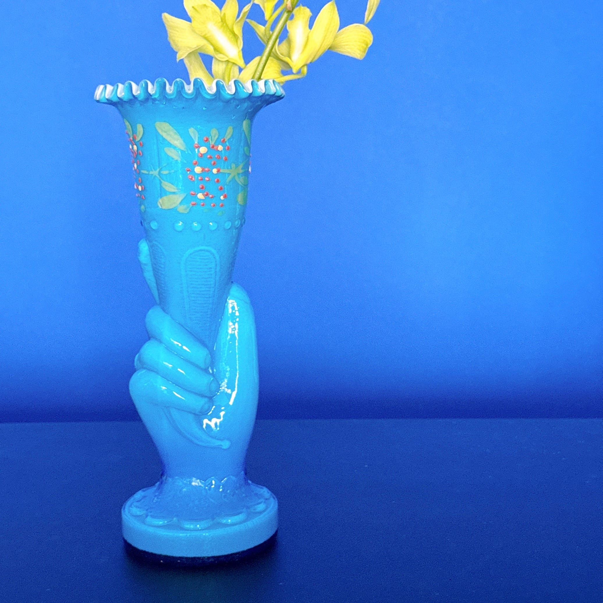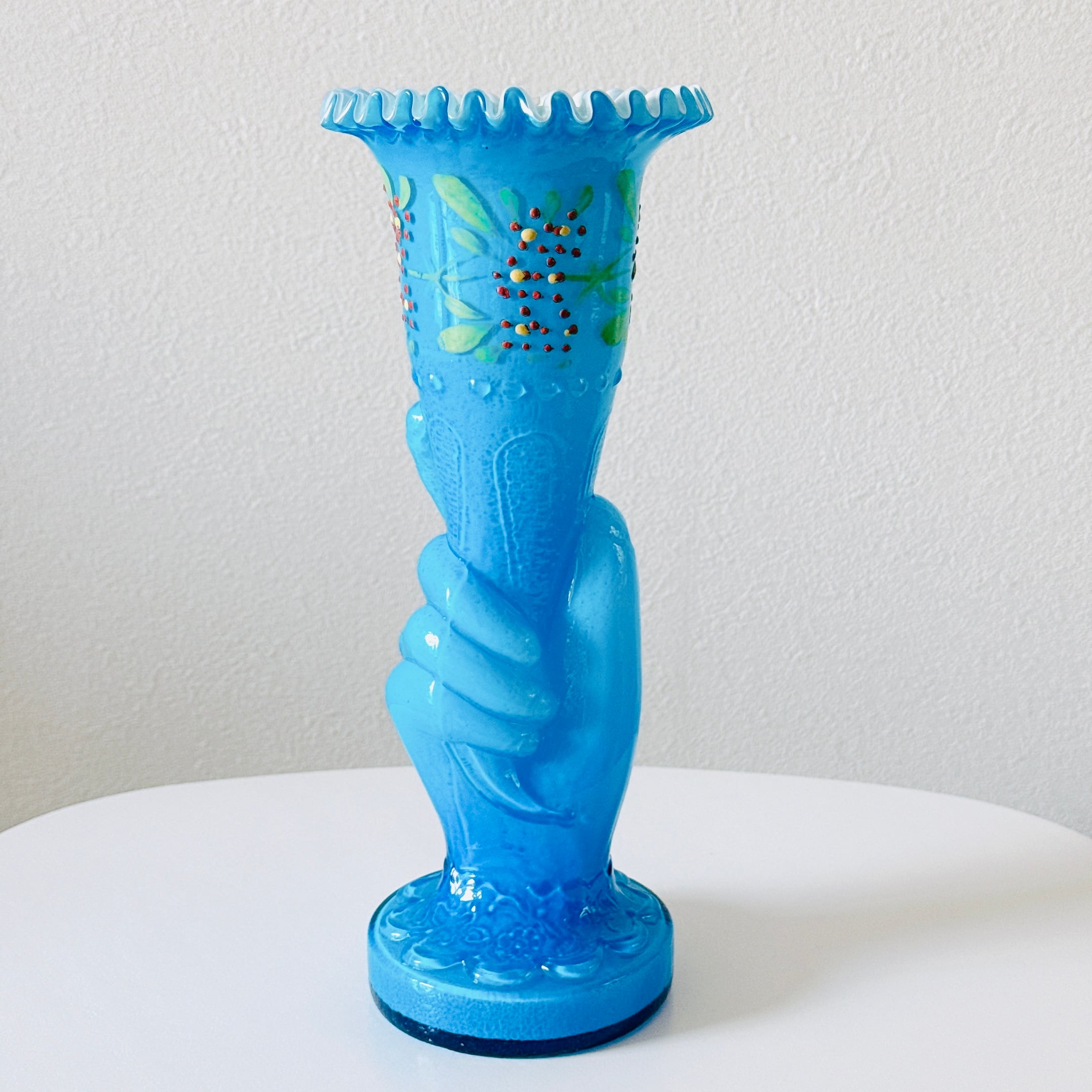 人気のハンドモチーフのヴィンテージ花瓶です。手書きの絵付けとフリルが美しい、一点ものになります。