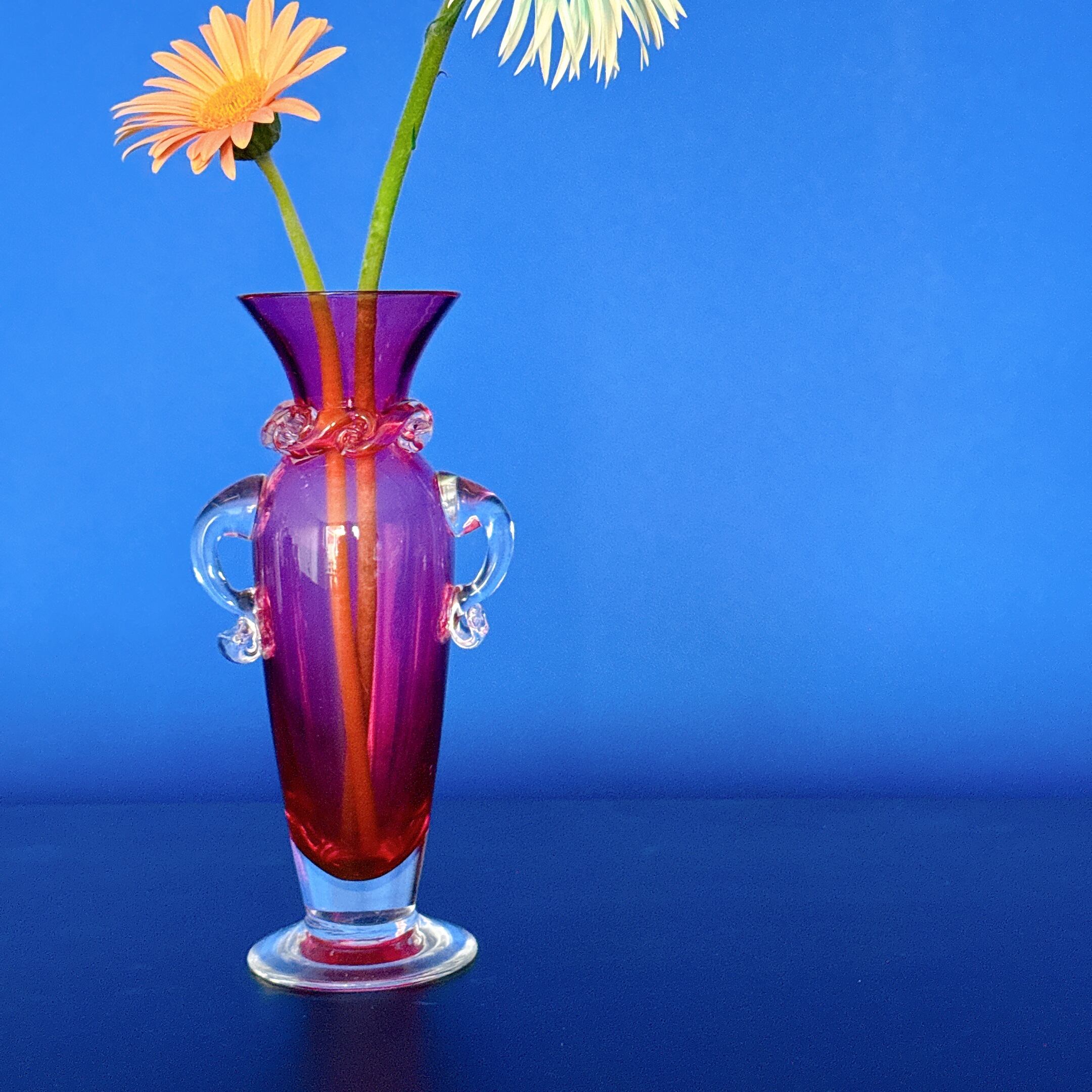 左右の取手が可愛い、北一硝子のヴィンテージフラワーベースです。1点ものになります。