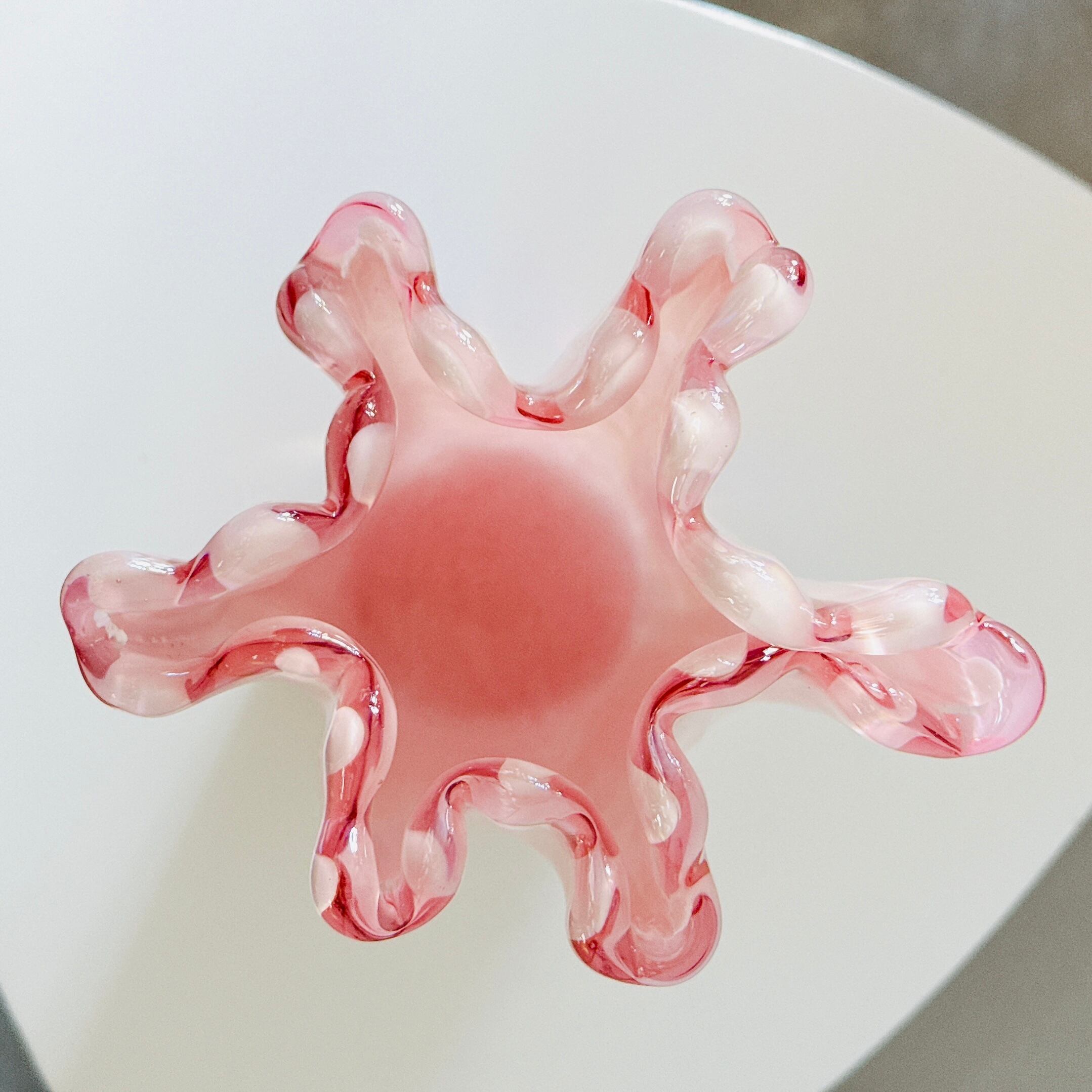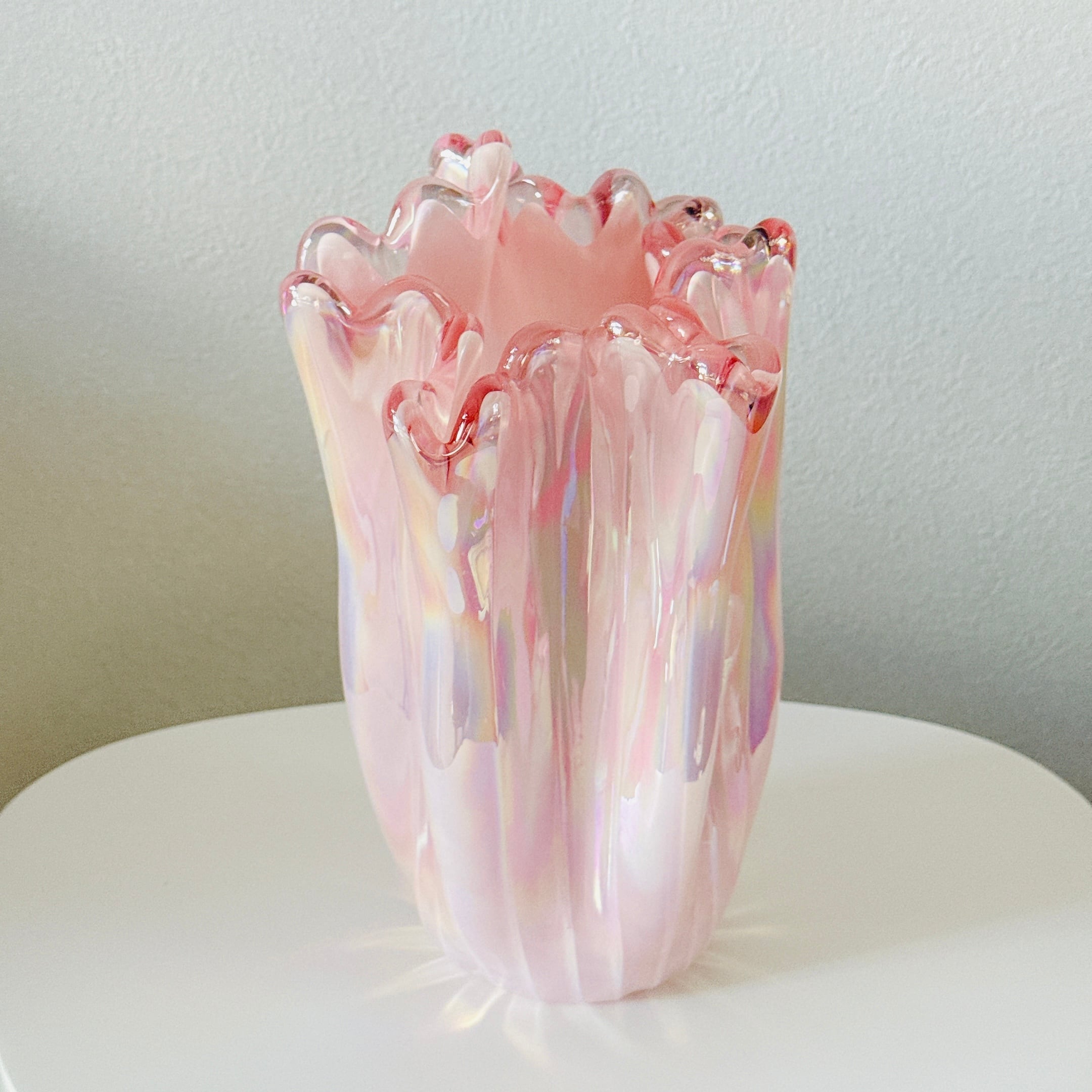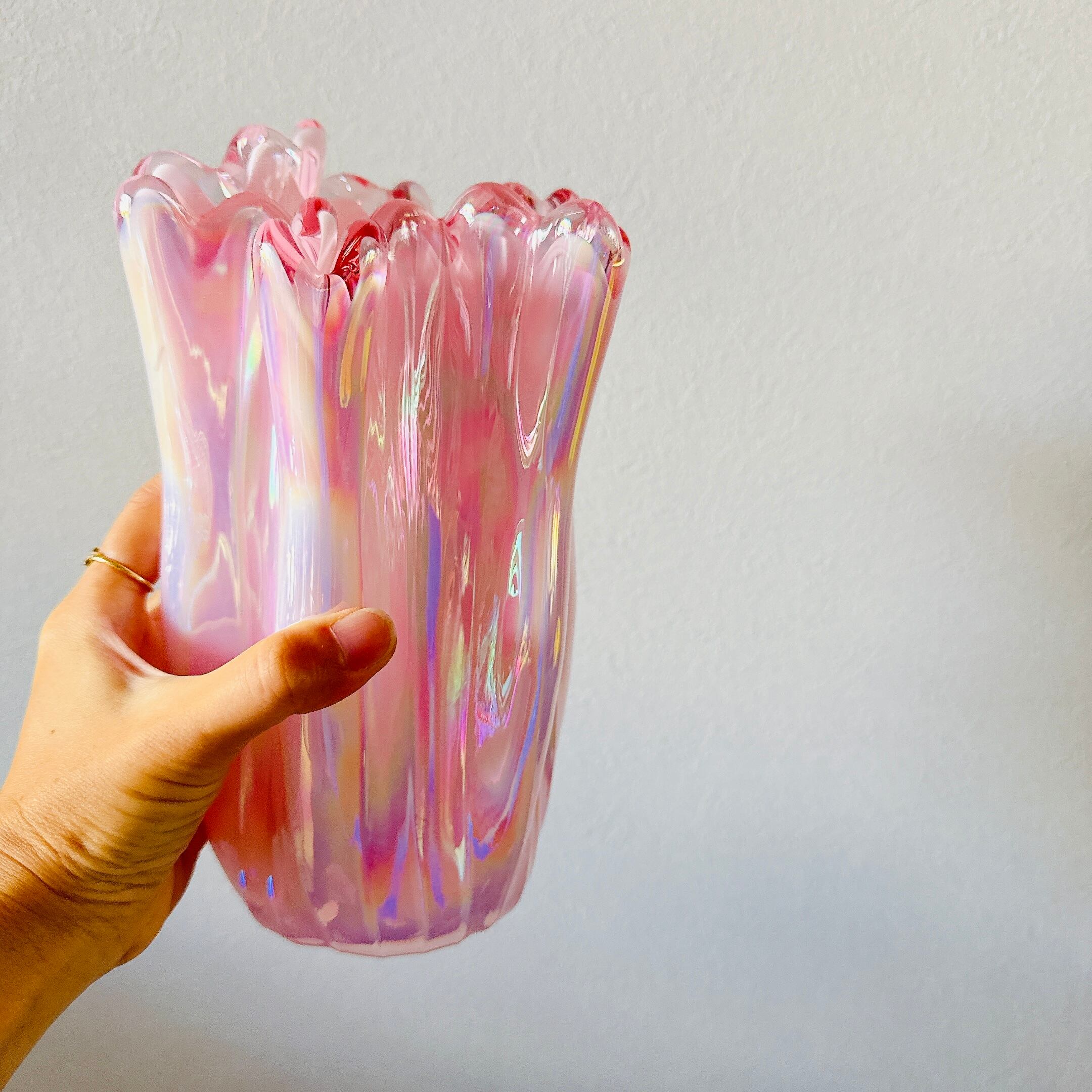 ピンクオーロラカラーとフリルが可愛い、昭和レトロなヴィンテージフラワーベースです。1点ものになります。