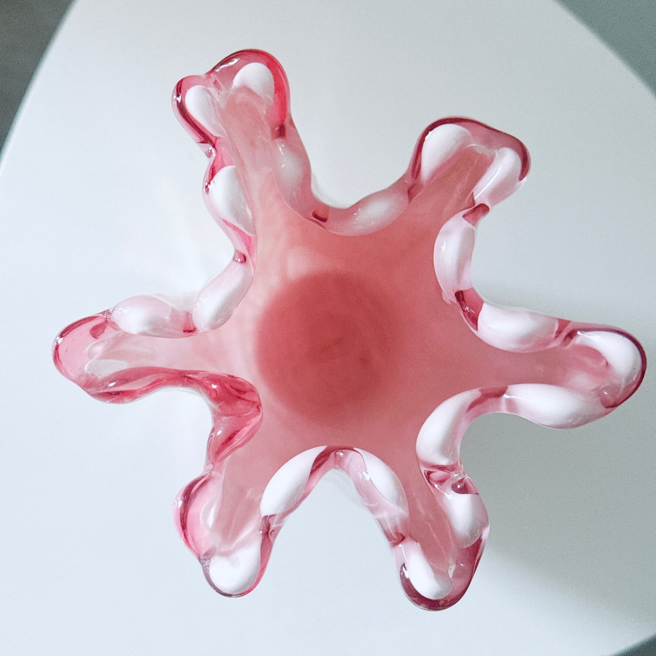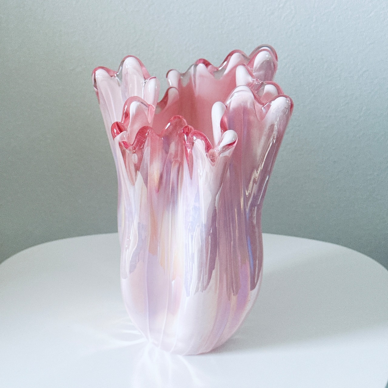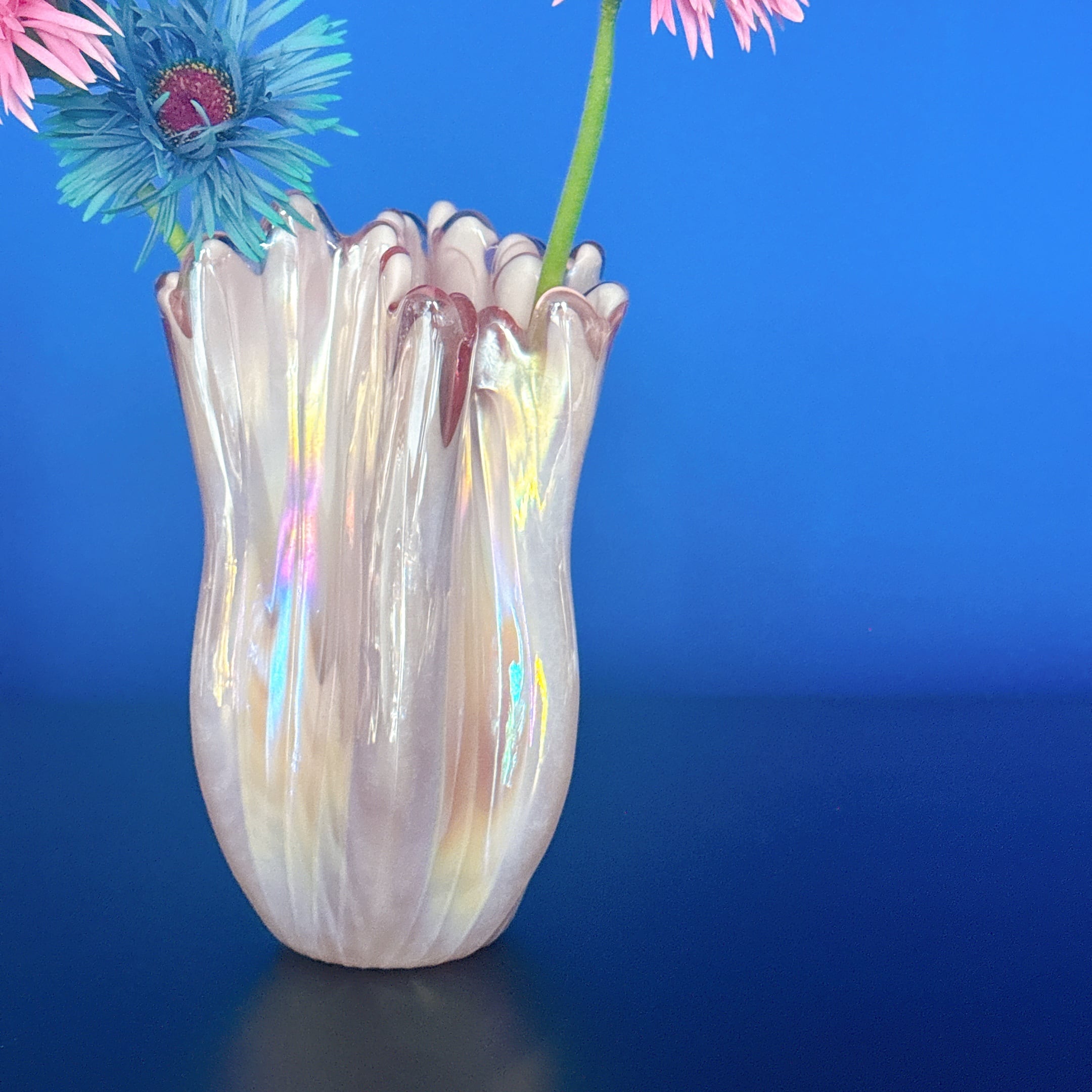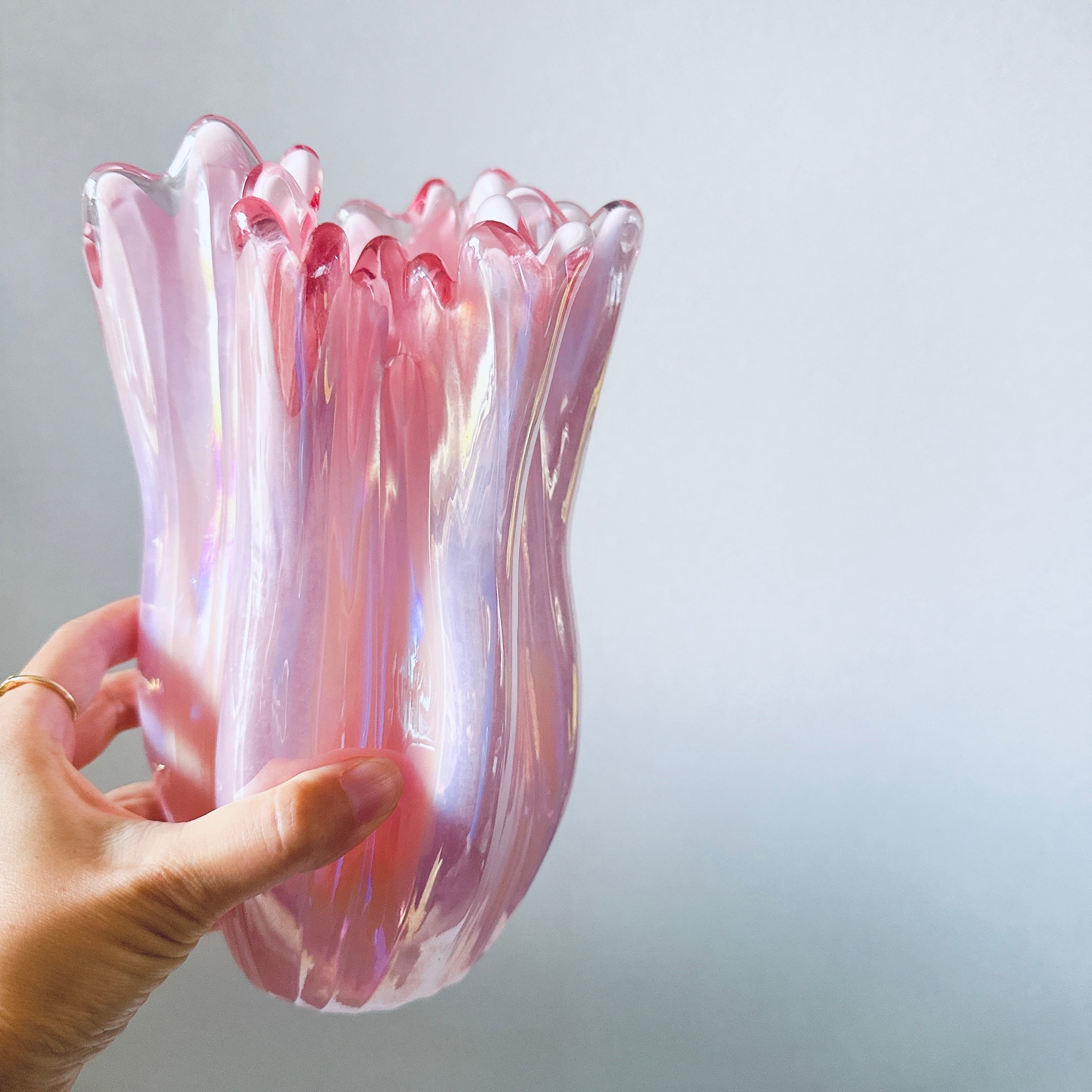 ピンクのオーロラカラーとフリルが可愛い、昭和のレトロポップなヴィンテージフラワーベースです。1点ものになります。