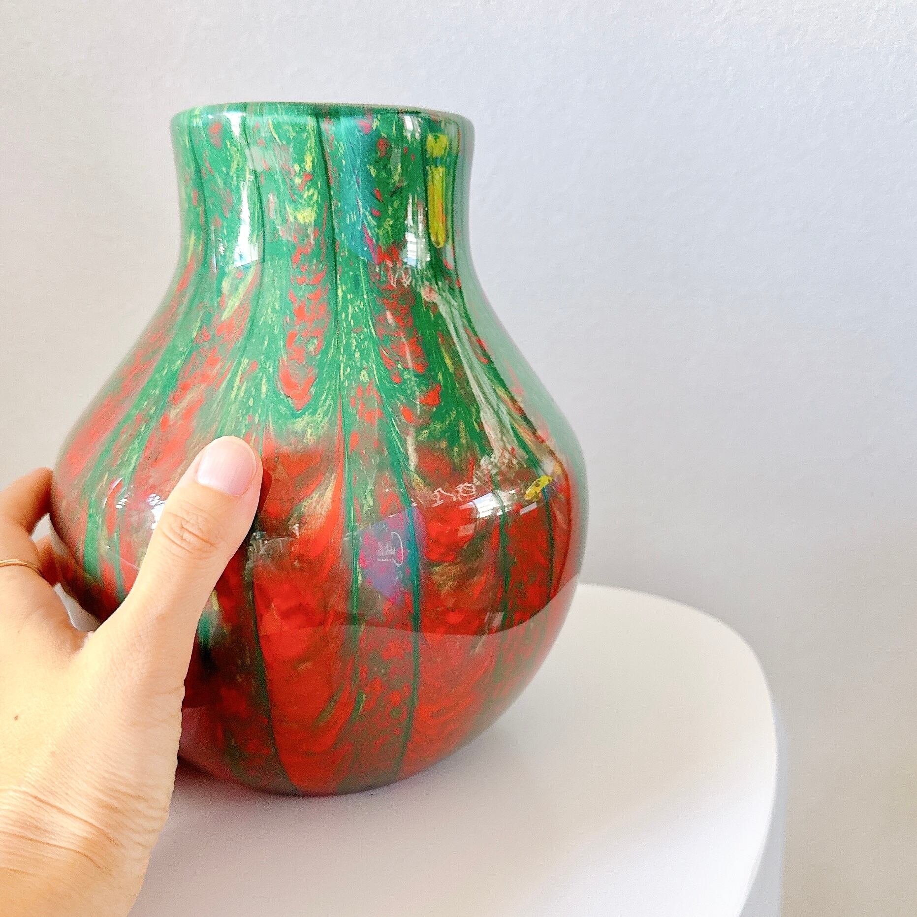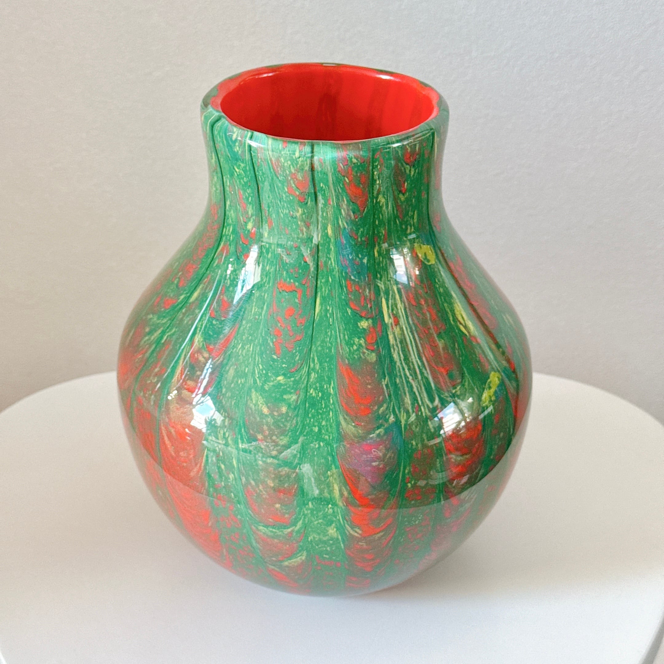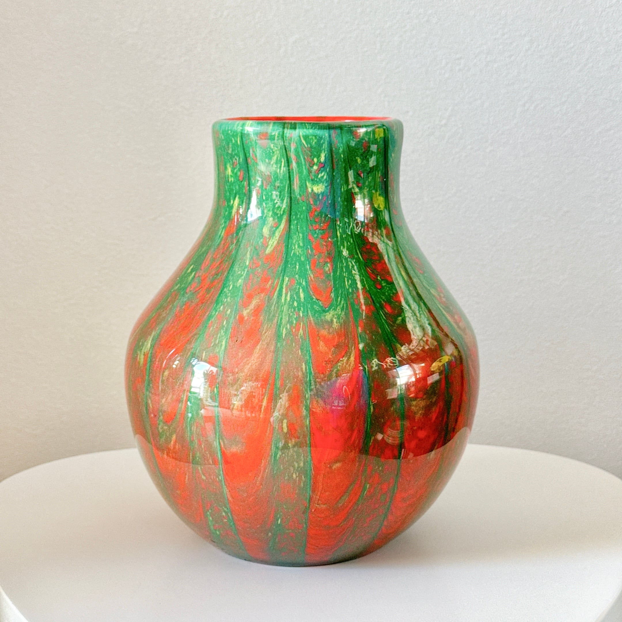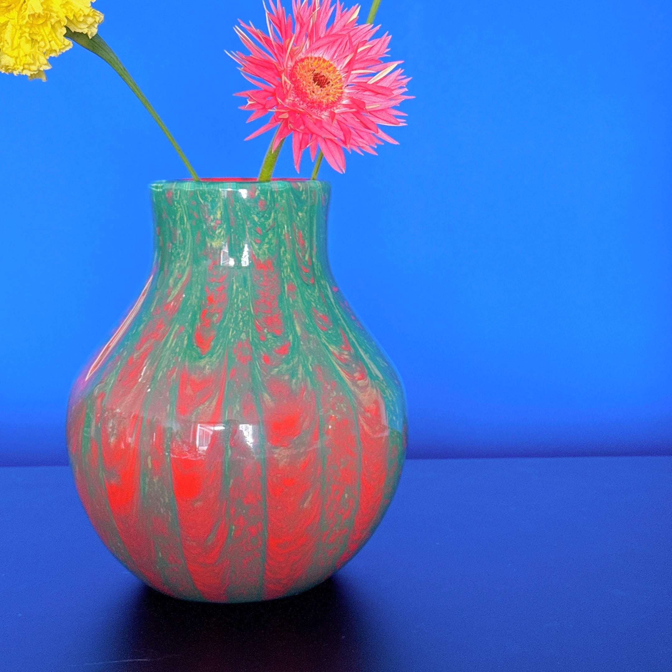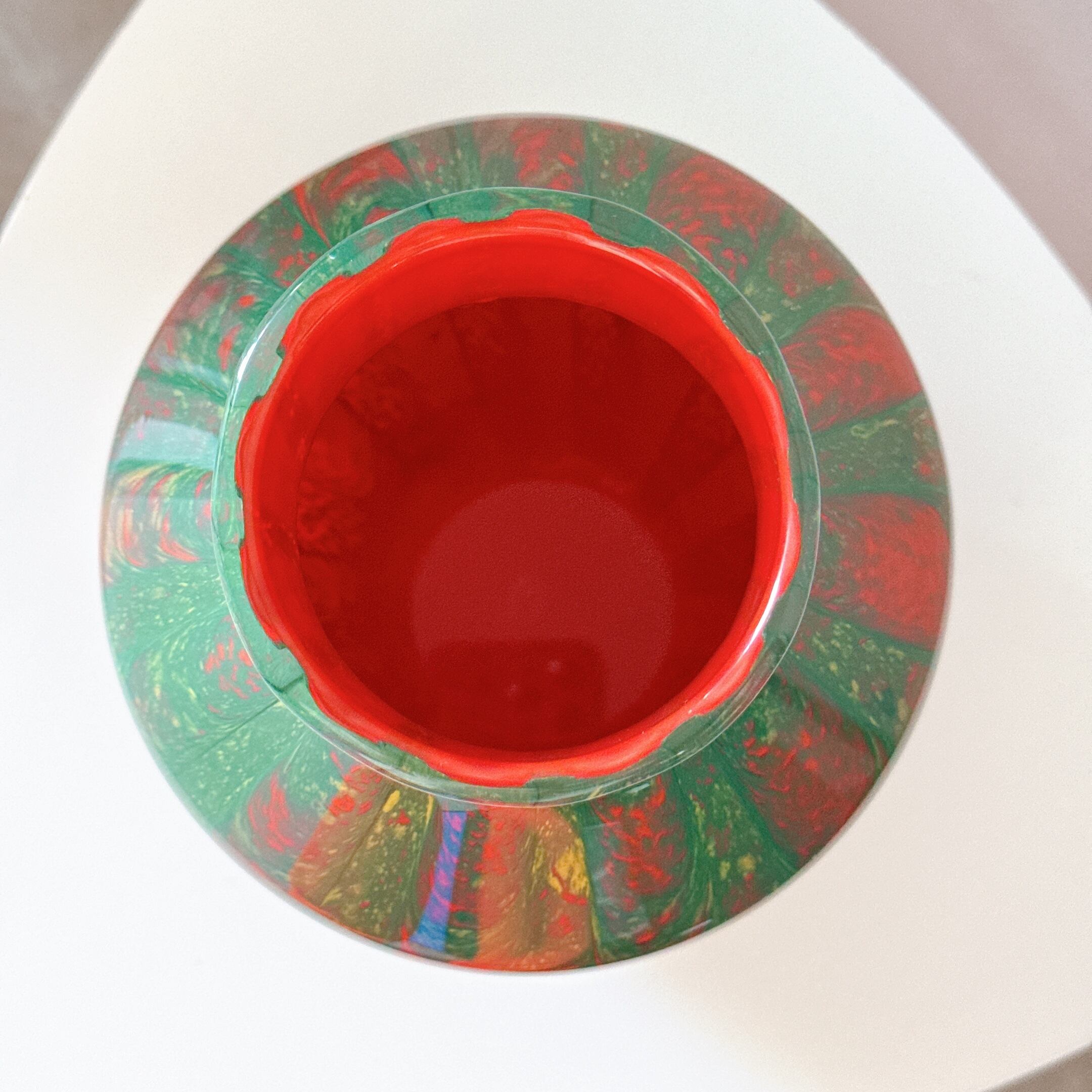 蛍光の赤とグリーンのマーブル模様が可愛い、昭和のレトロポップなヴィンテージフラワーベースです。1点ものになります。