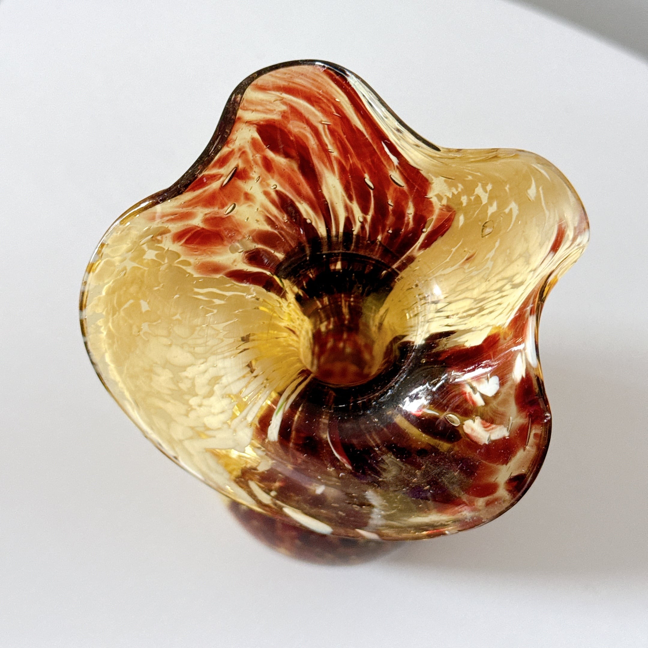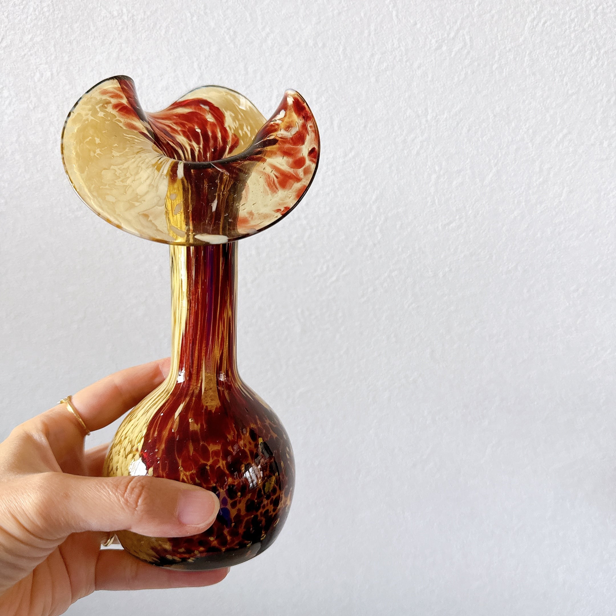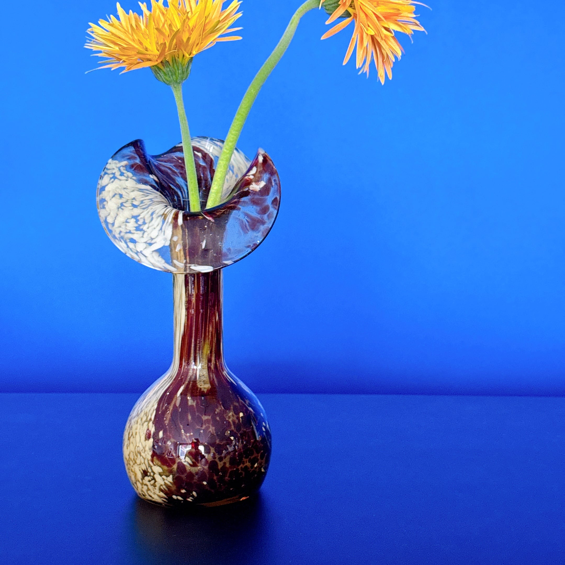 前傾のフリルの口が美しい、イタリア製ガラスのヴィンテージフラワーベースです。1点ものになります。