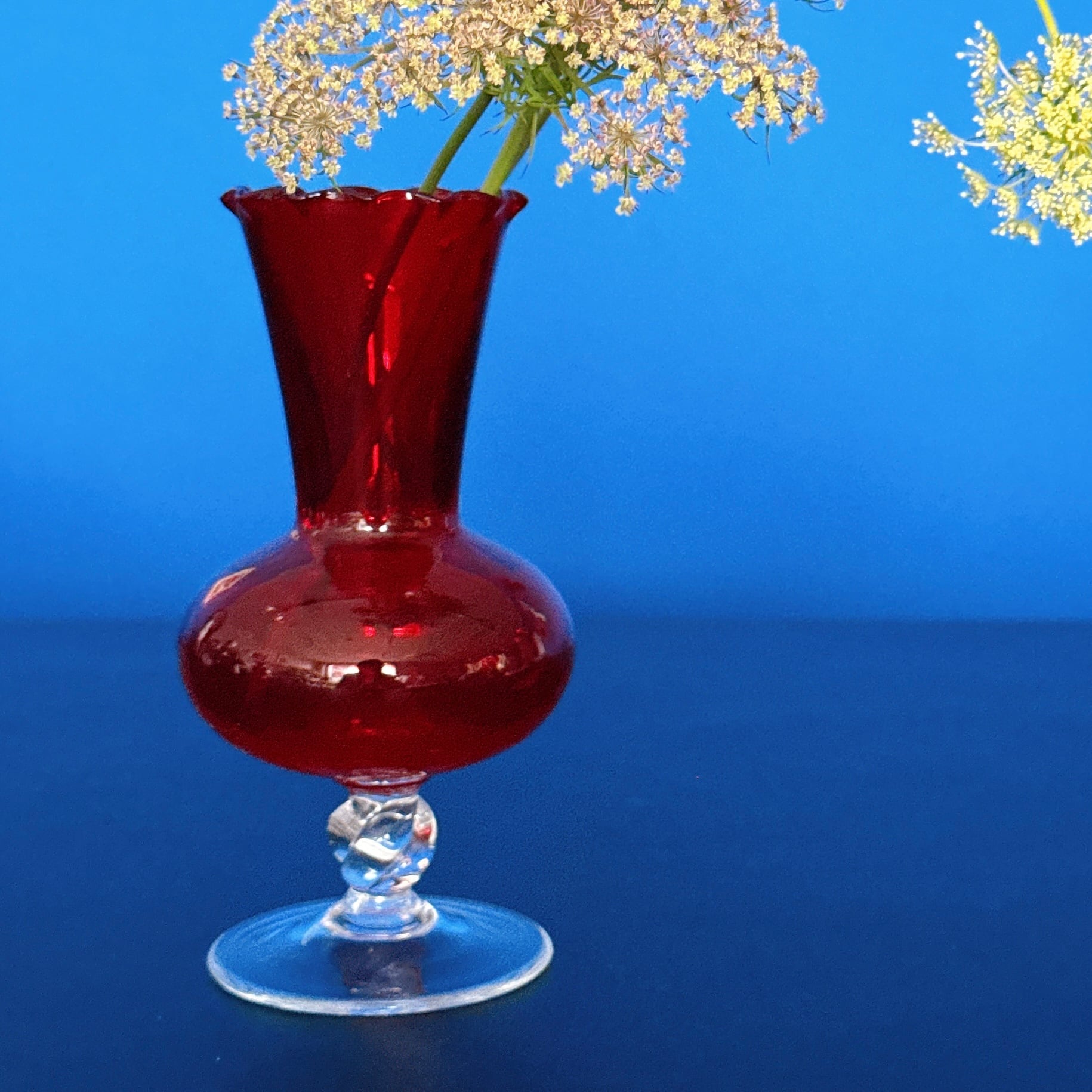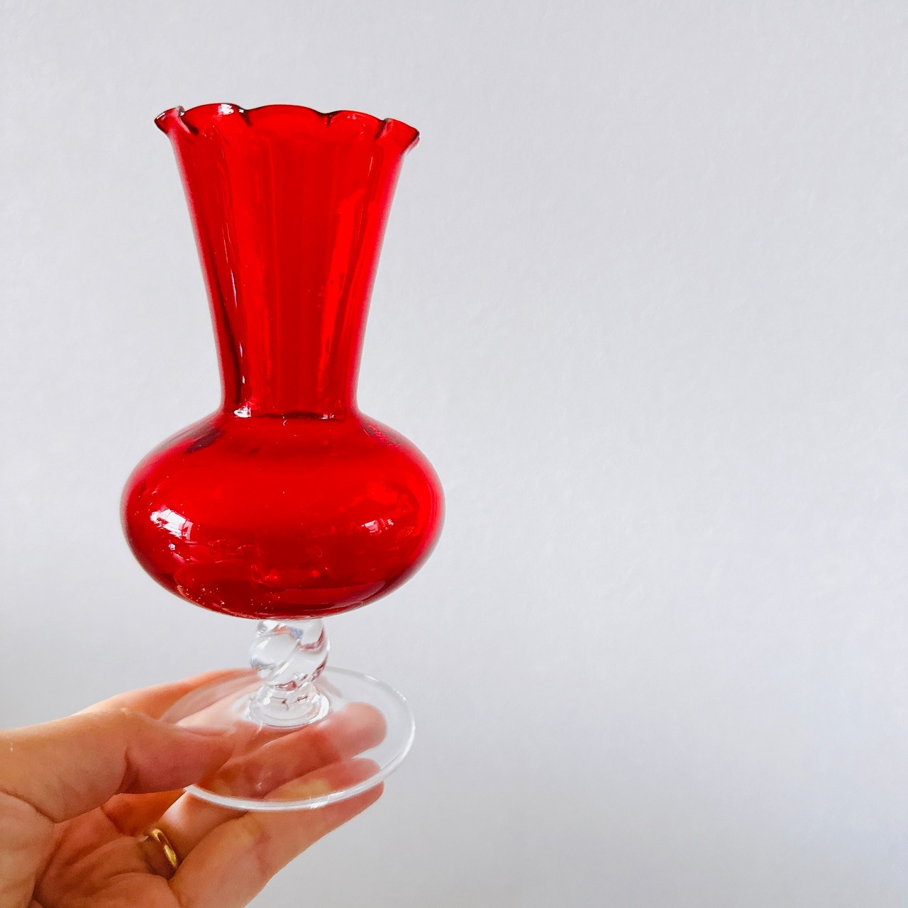 真っ赤な色とアンティーク調の形が美しい、フランス製ガラスのヴィンテージフラワーベースです。1点ものになります。
