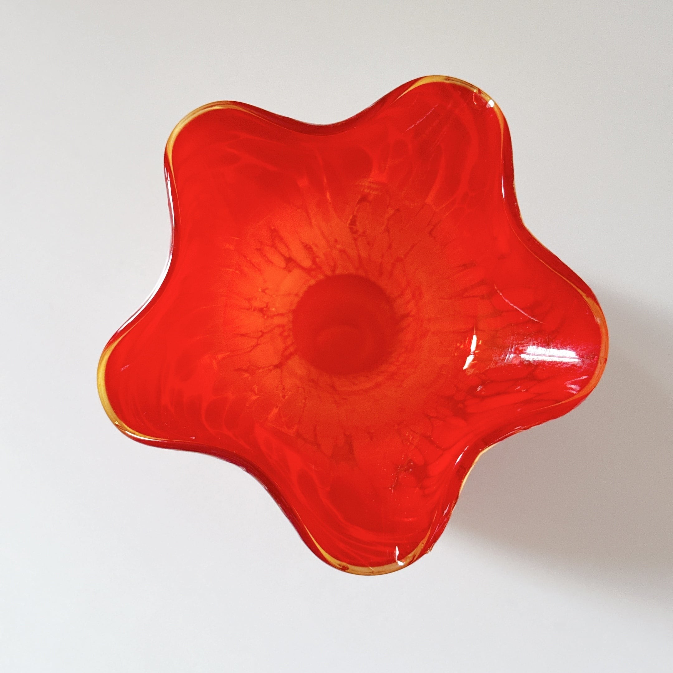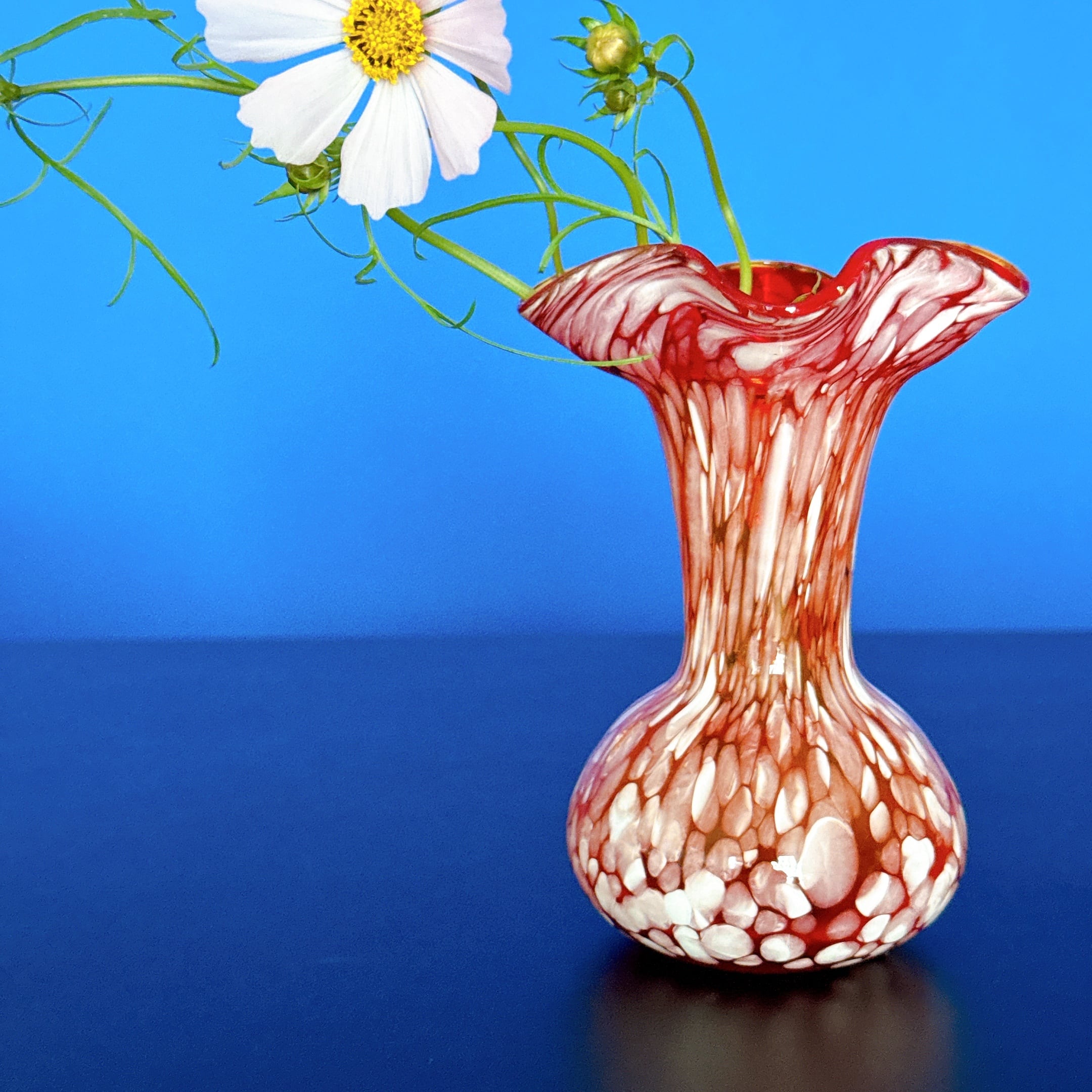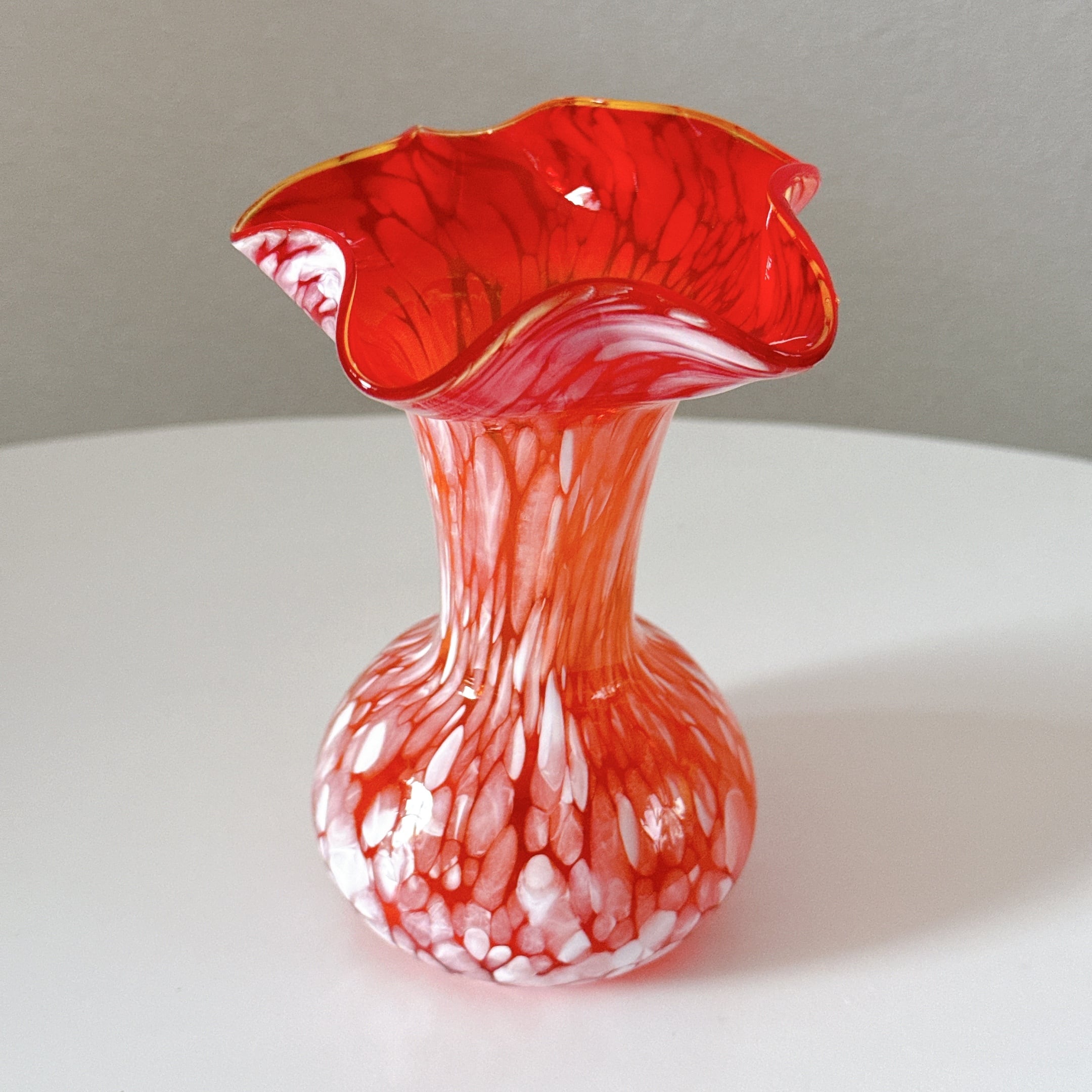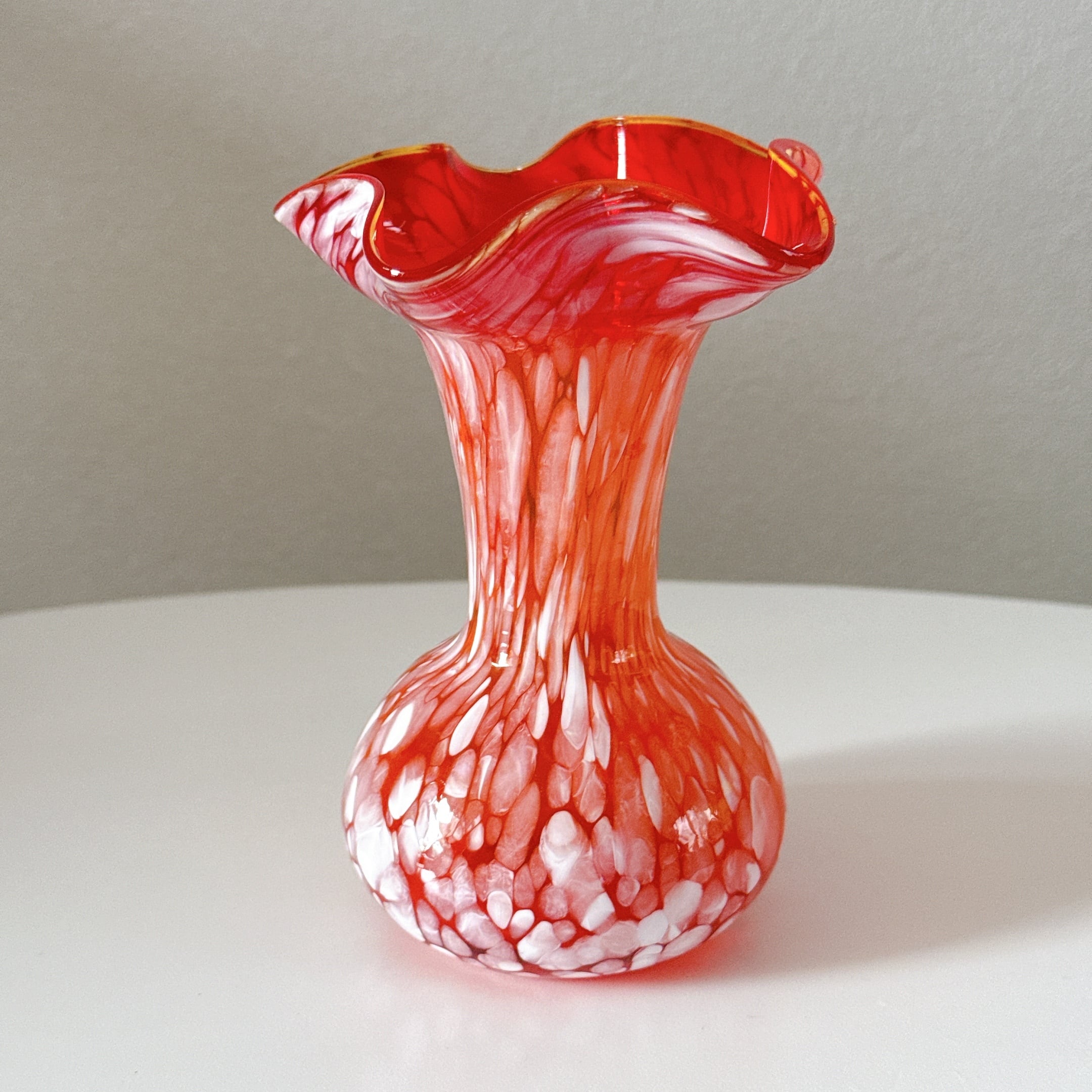 マーブル模様とフリルが可愛い、小さめのガラス製ヴィンテージフラワーベースです。1点ものになります。