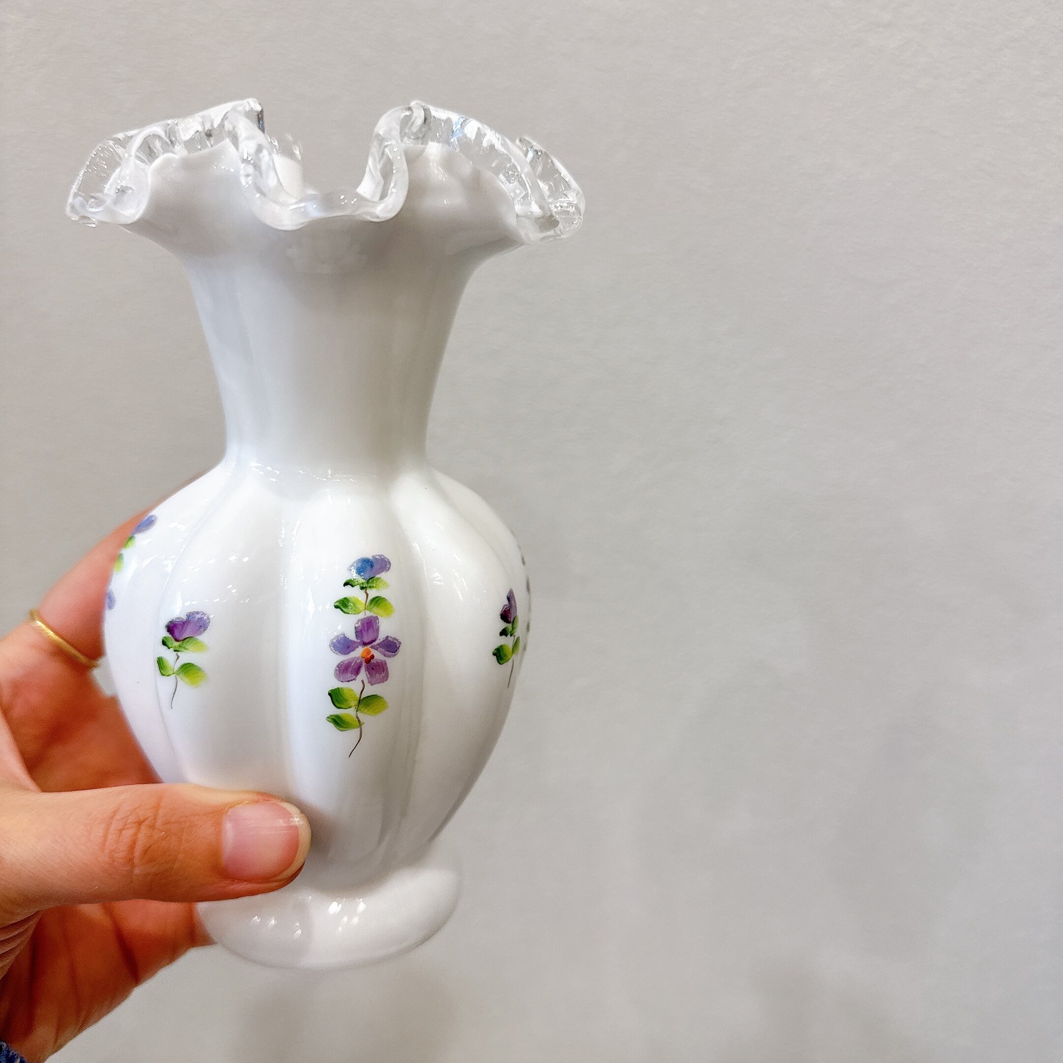 アメリカのフェントン・アート・グラス社のシルバークレスト、ハンドペイントですみれが描かれています。