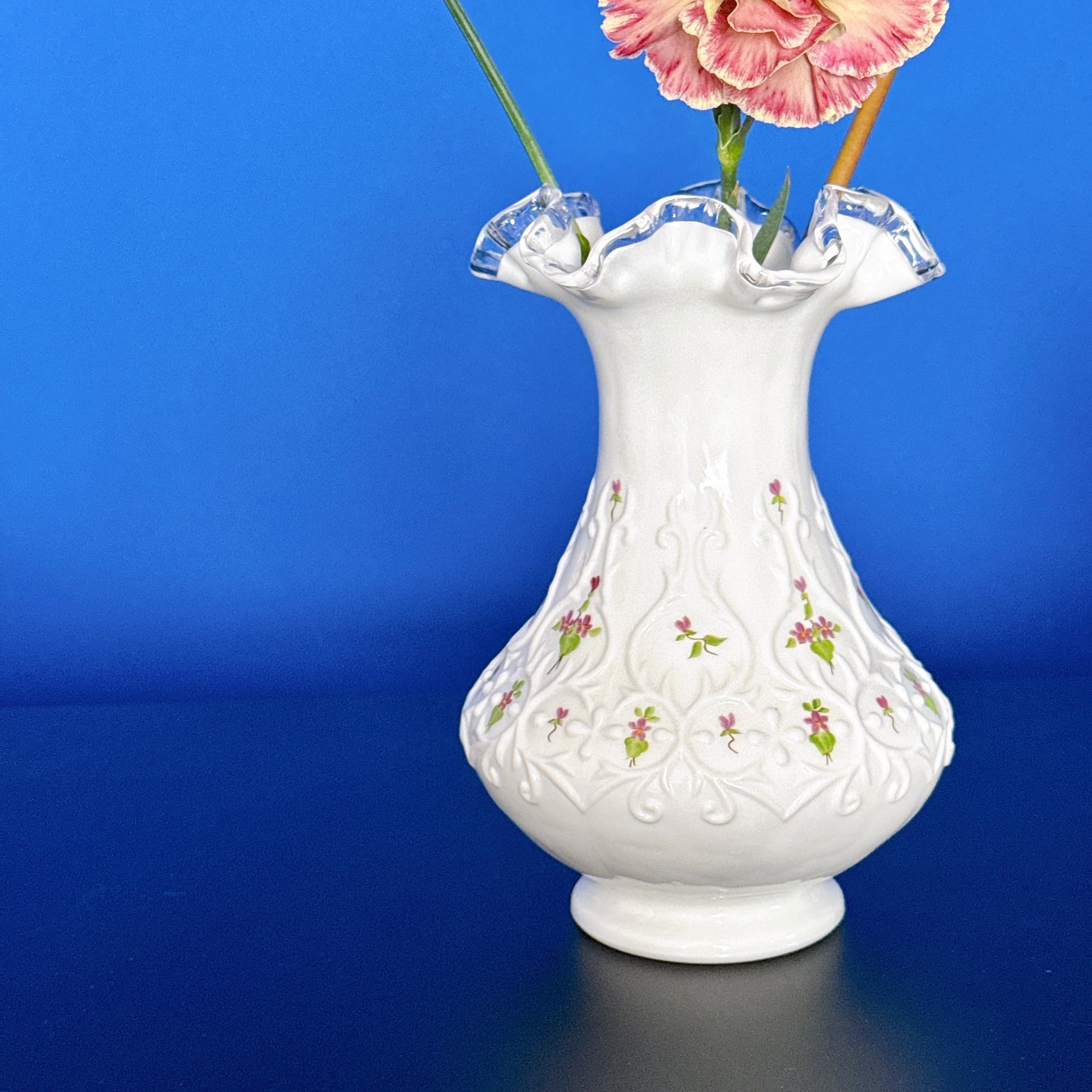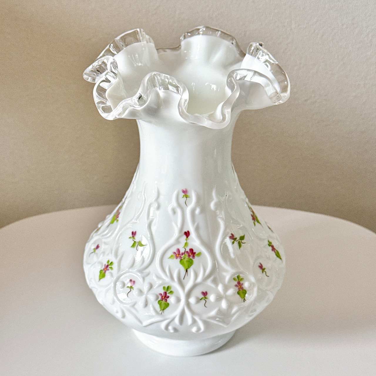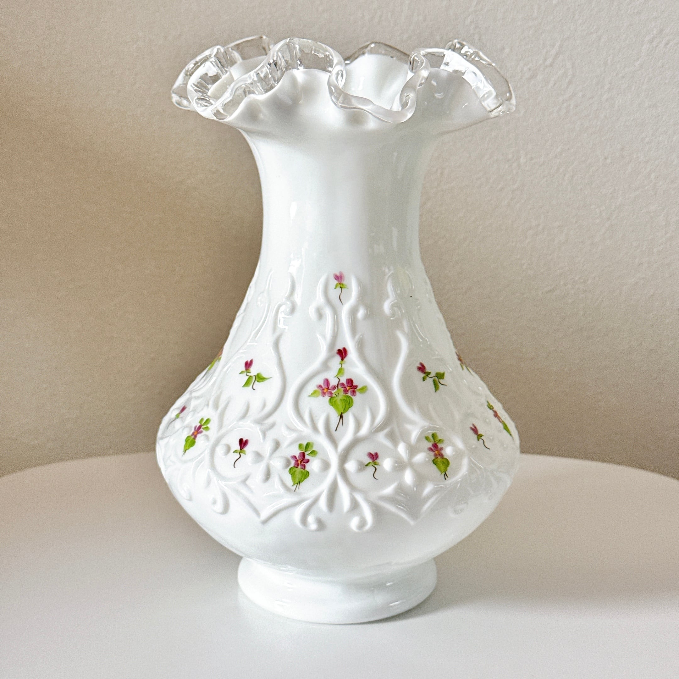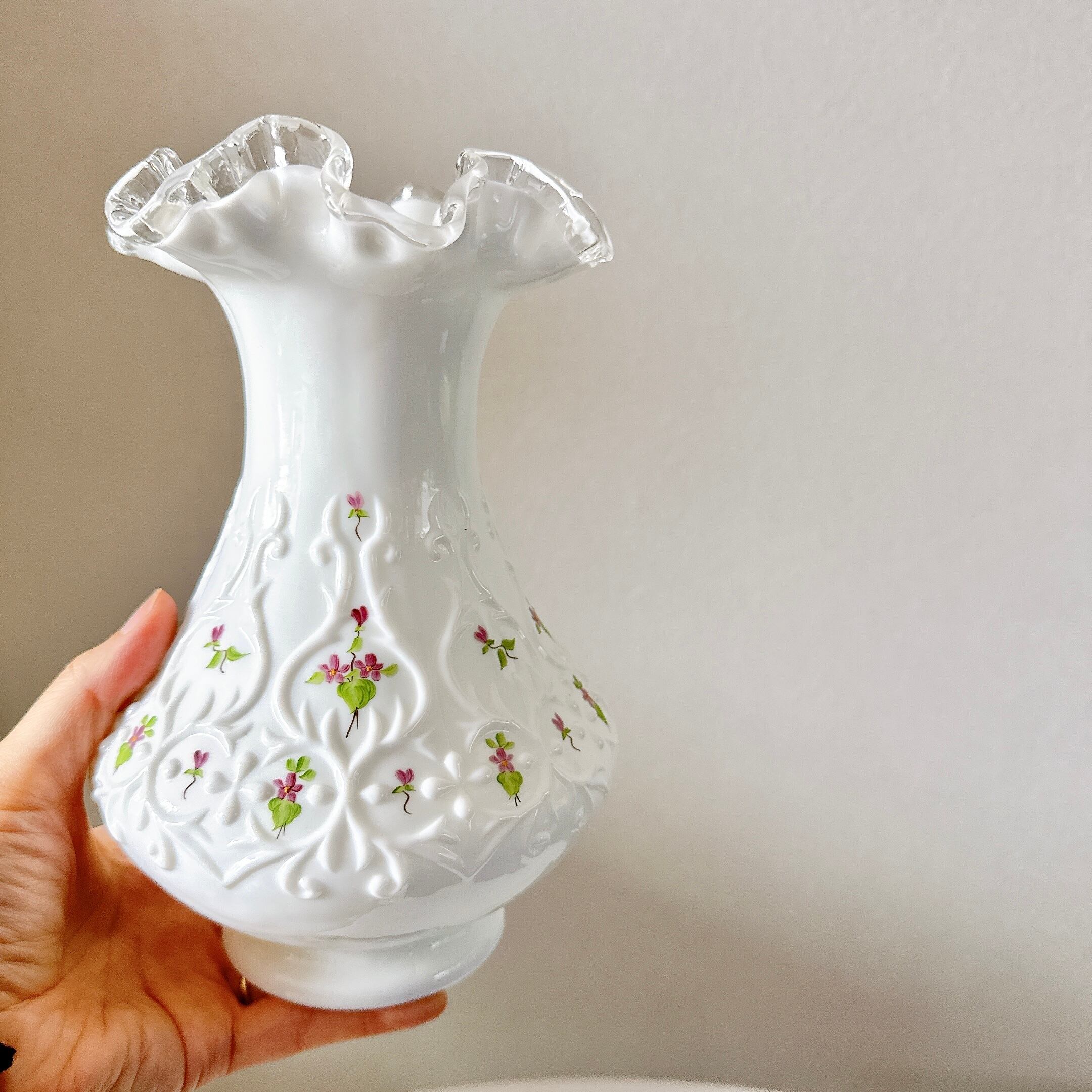 アメリカのフェントン・アート・グラス社のシルバークレスト、ハンドペイントですみれが描かれています。
