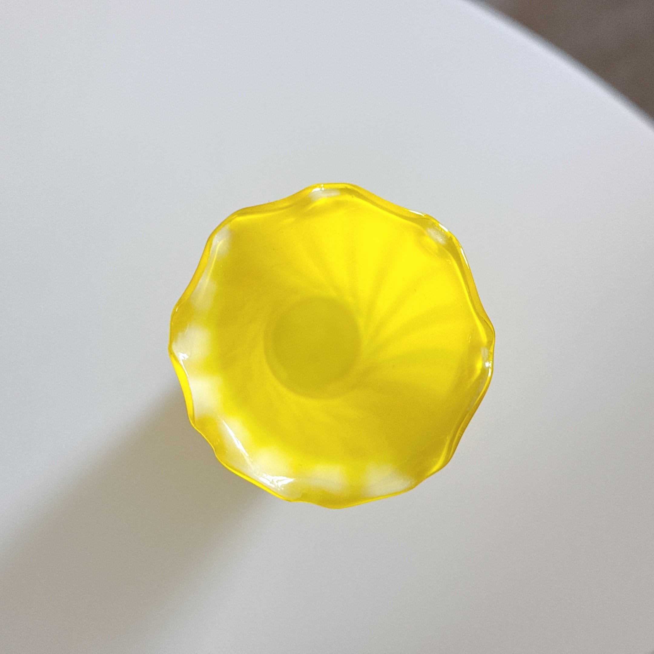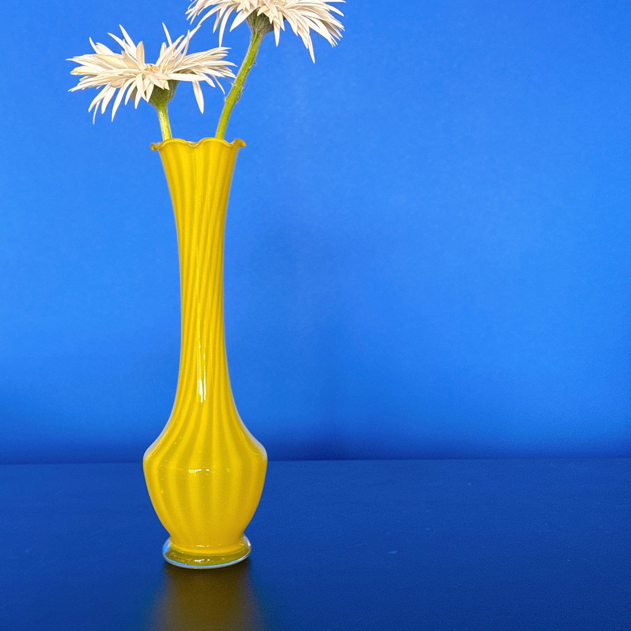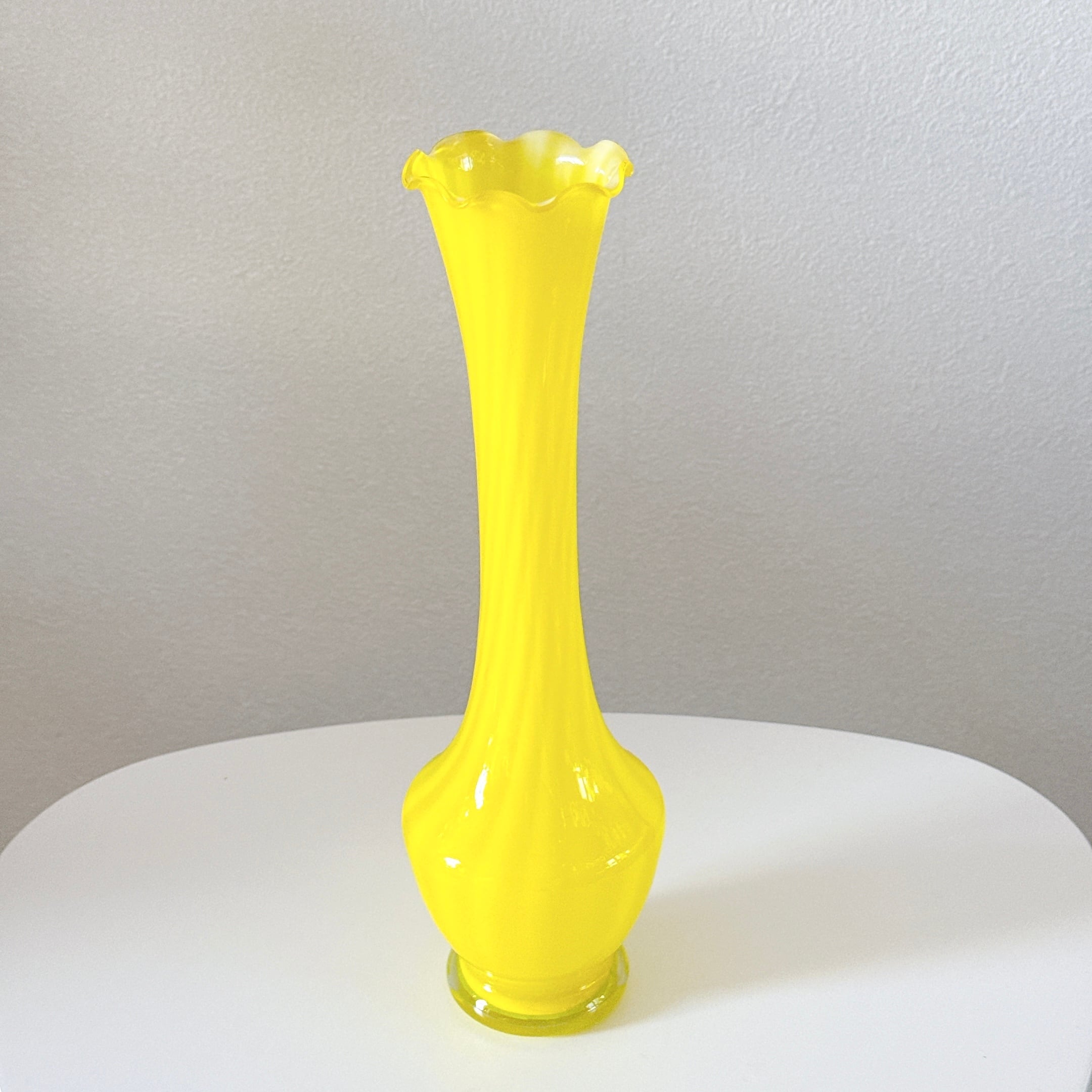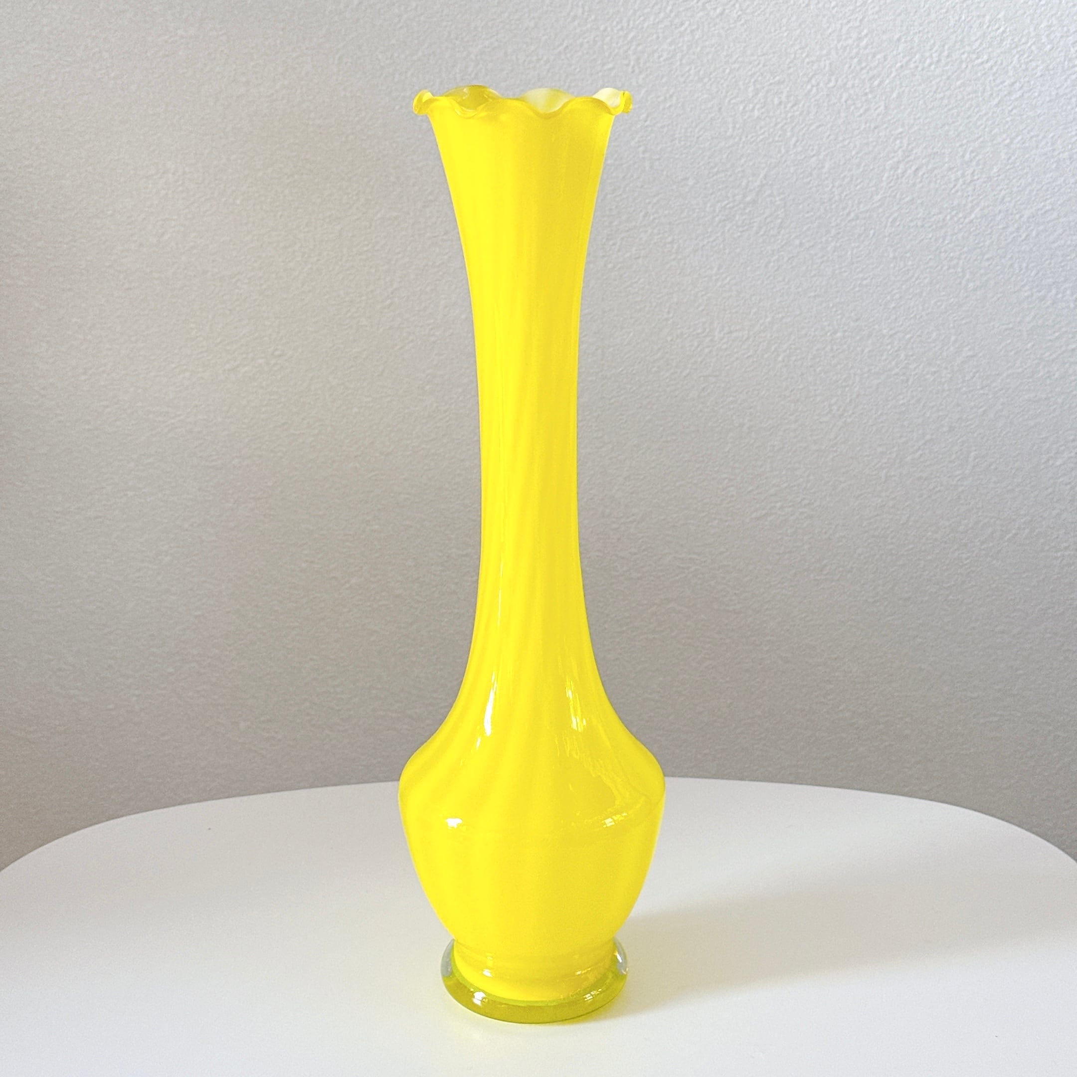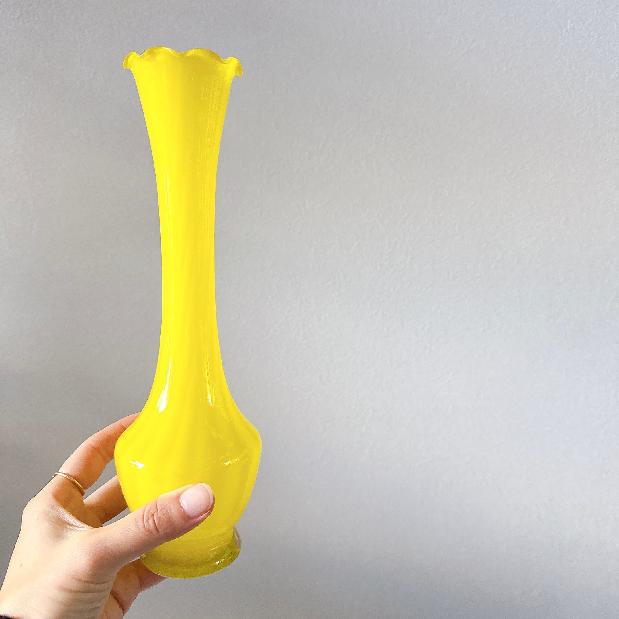 鮮やかイエローとフリルが可愛い、ガラス製のヴィンテージフラワーベースです。1点ものになります。