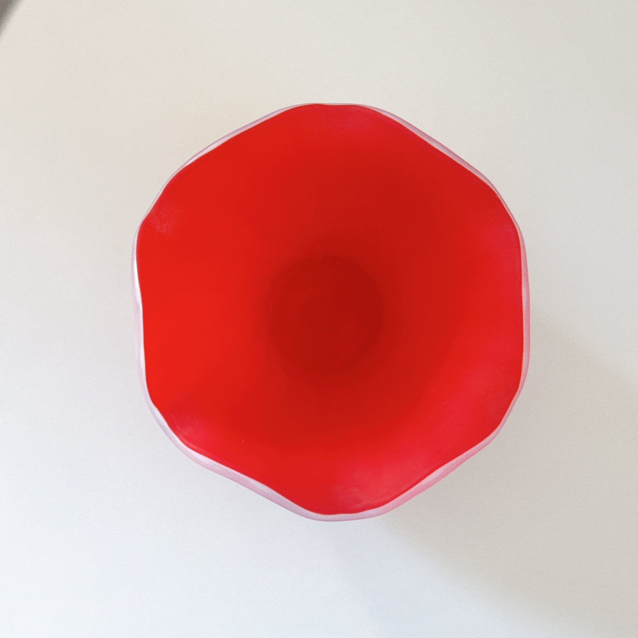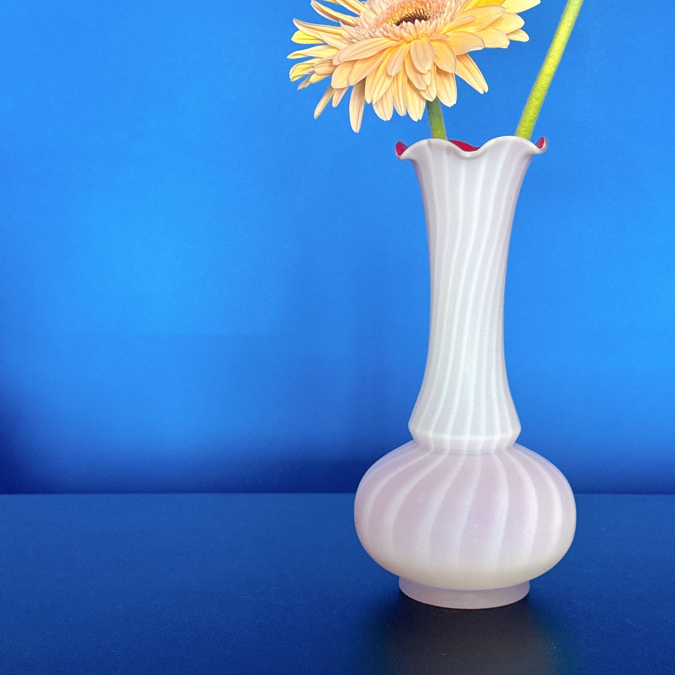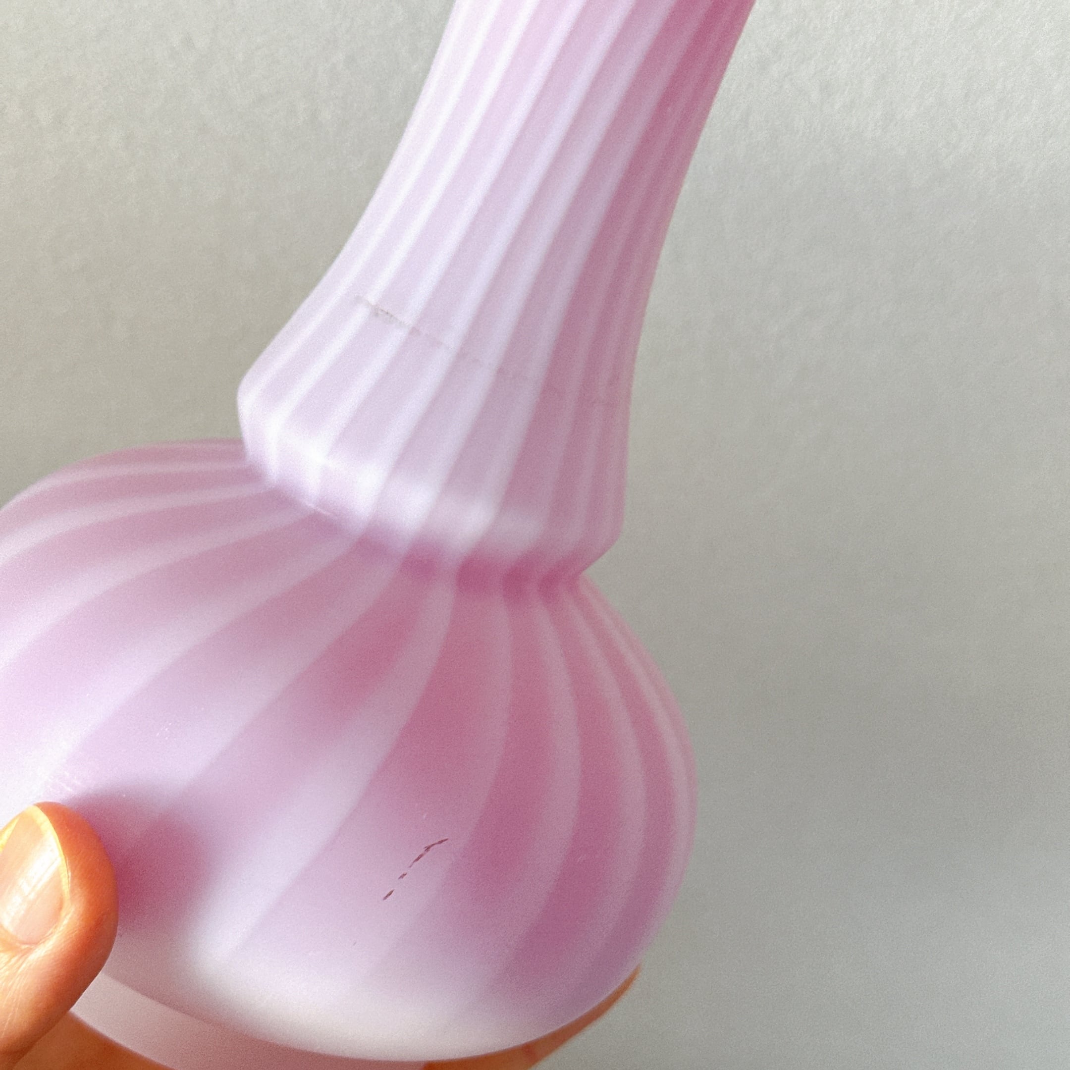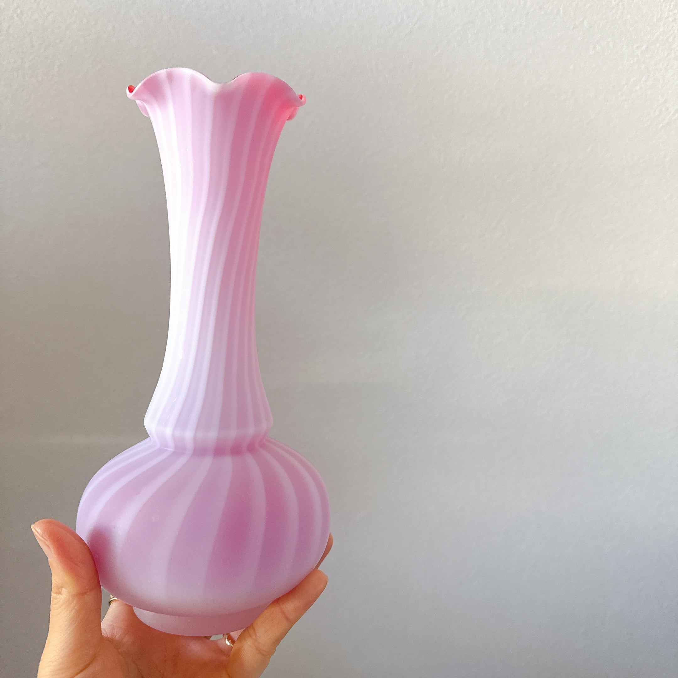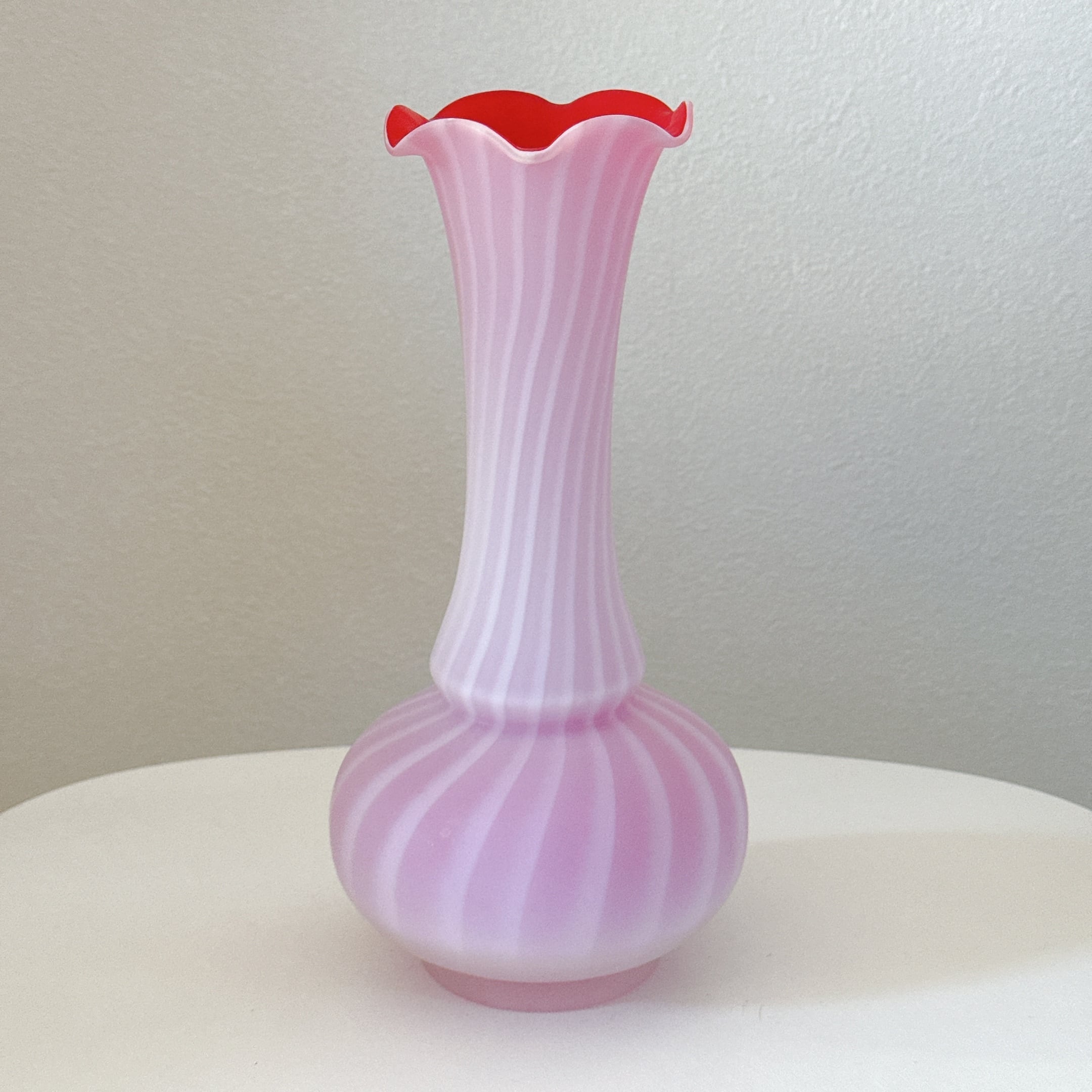 フリルと螺旋模様が可愛い、すりガラスのヴィンテージフラワーベースです。1点ものになります。