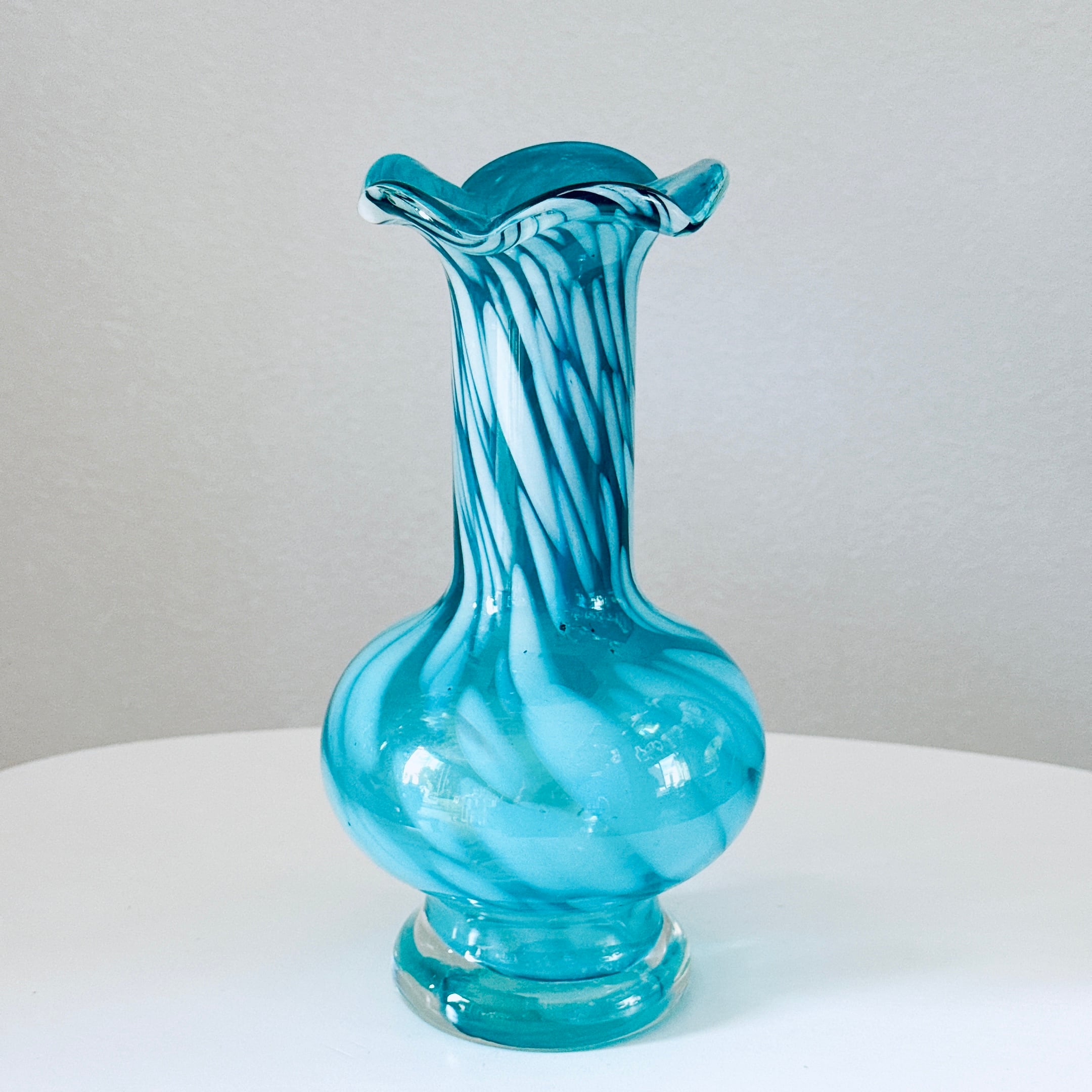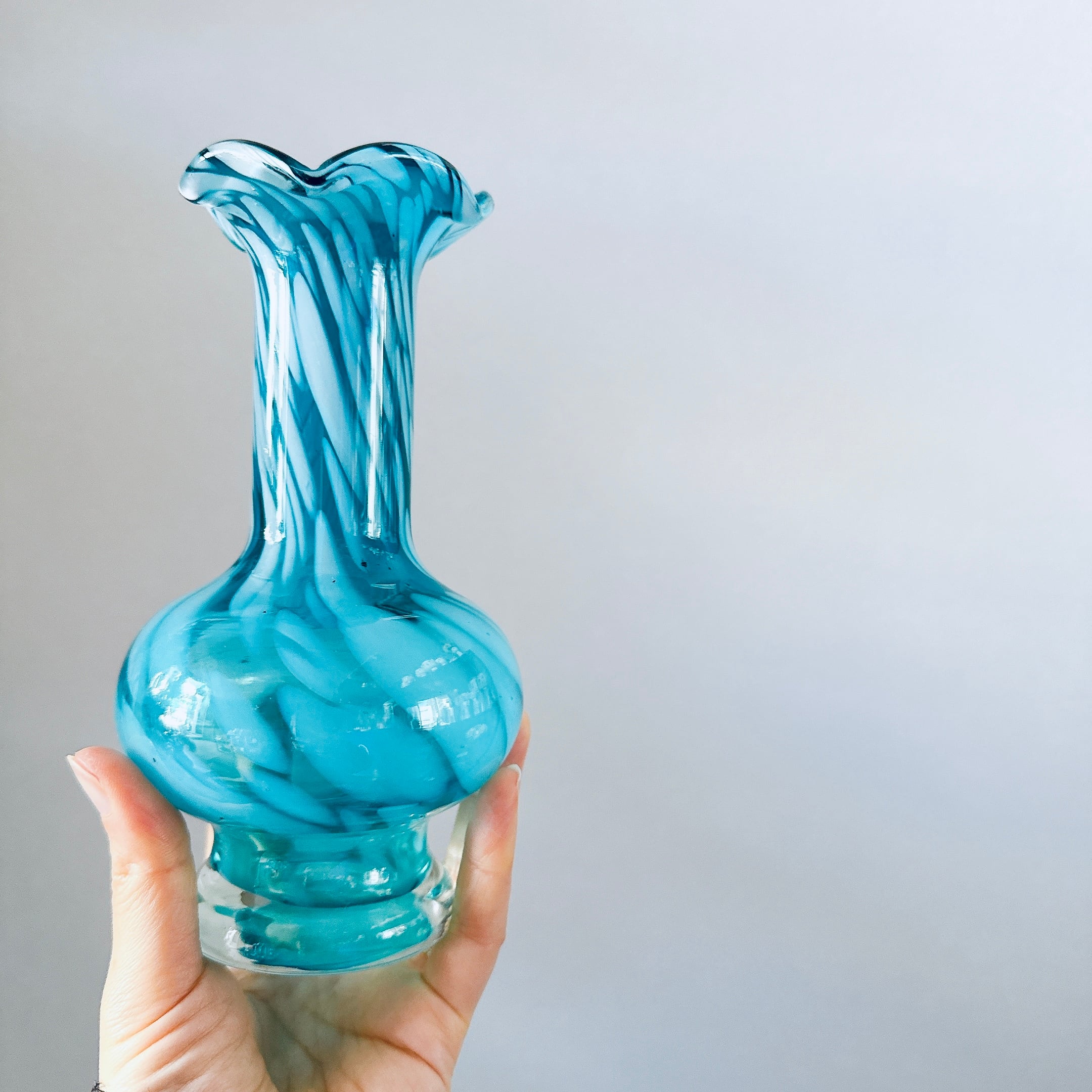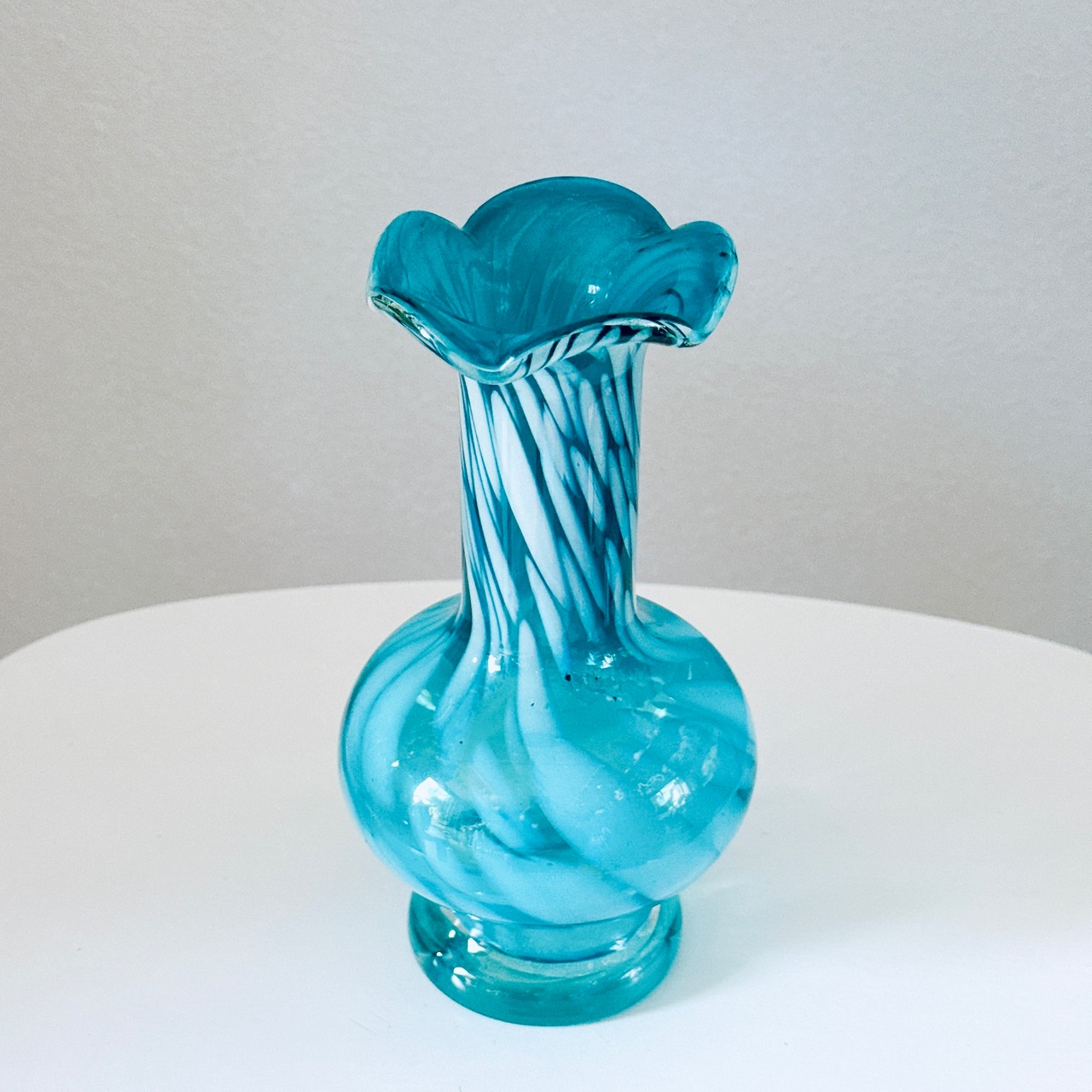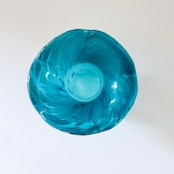 ターコイズブルーが美しい、ガラス製のヴィンテージフラワーベースです。1点ものになります。