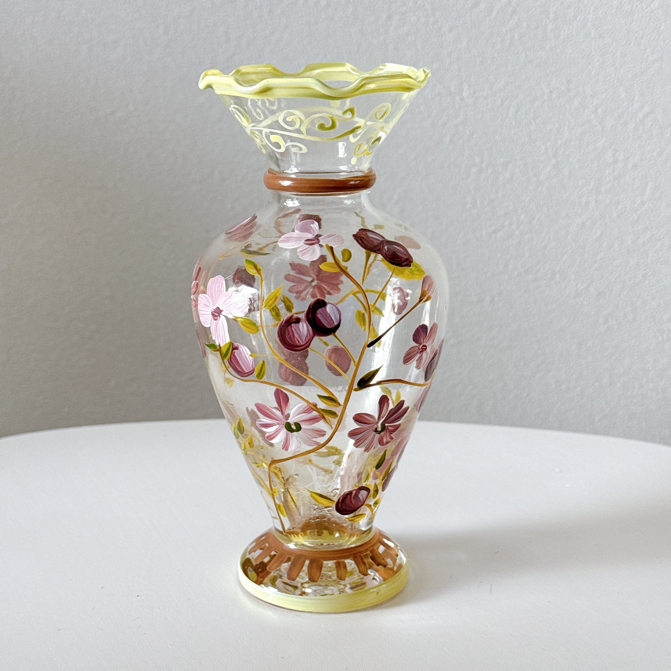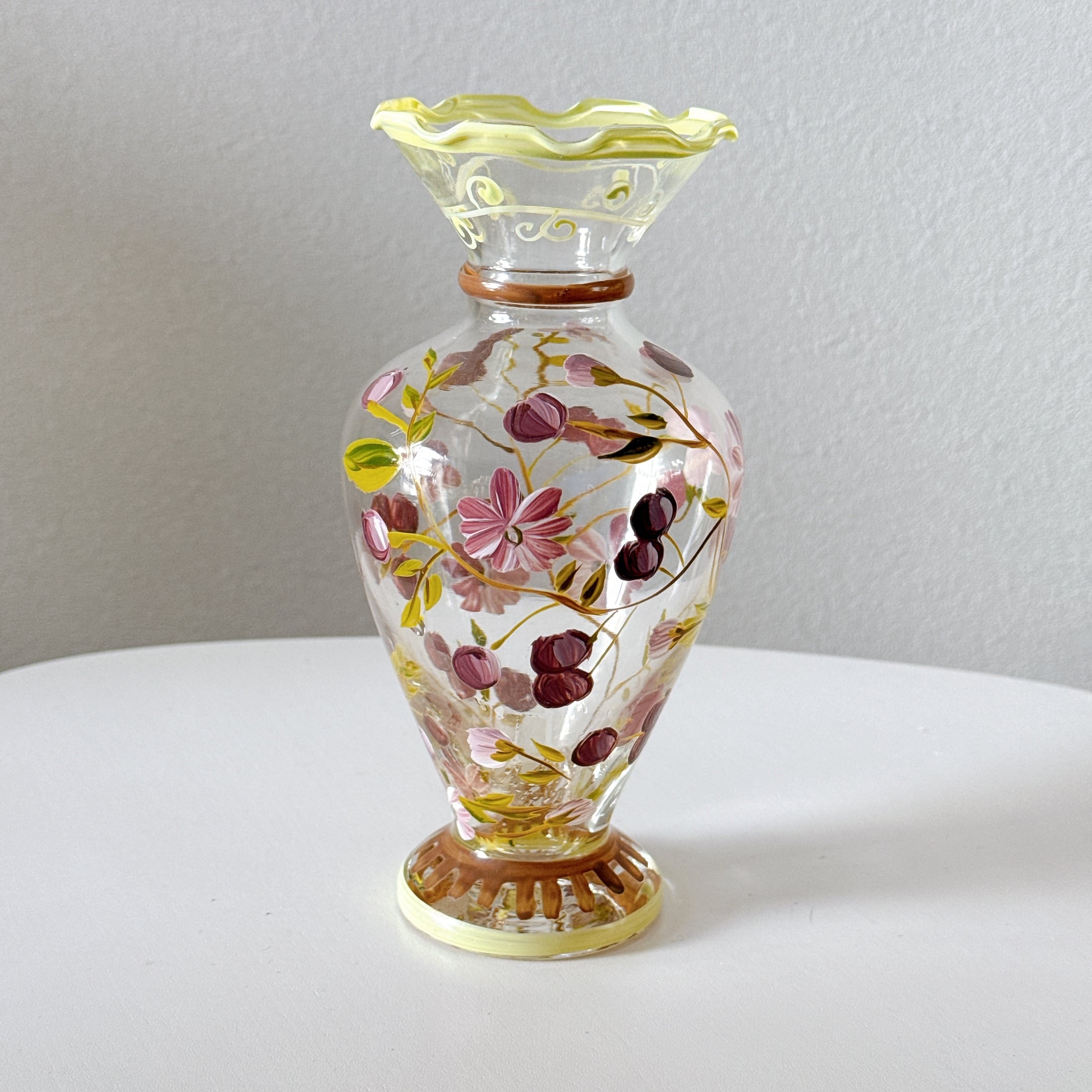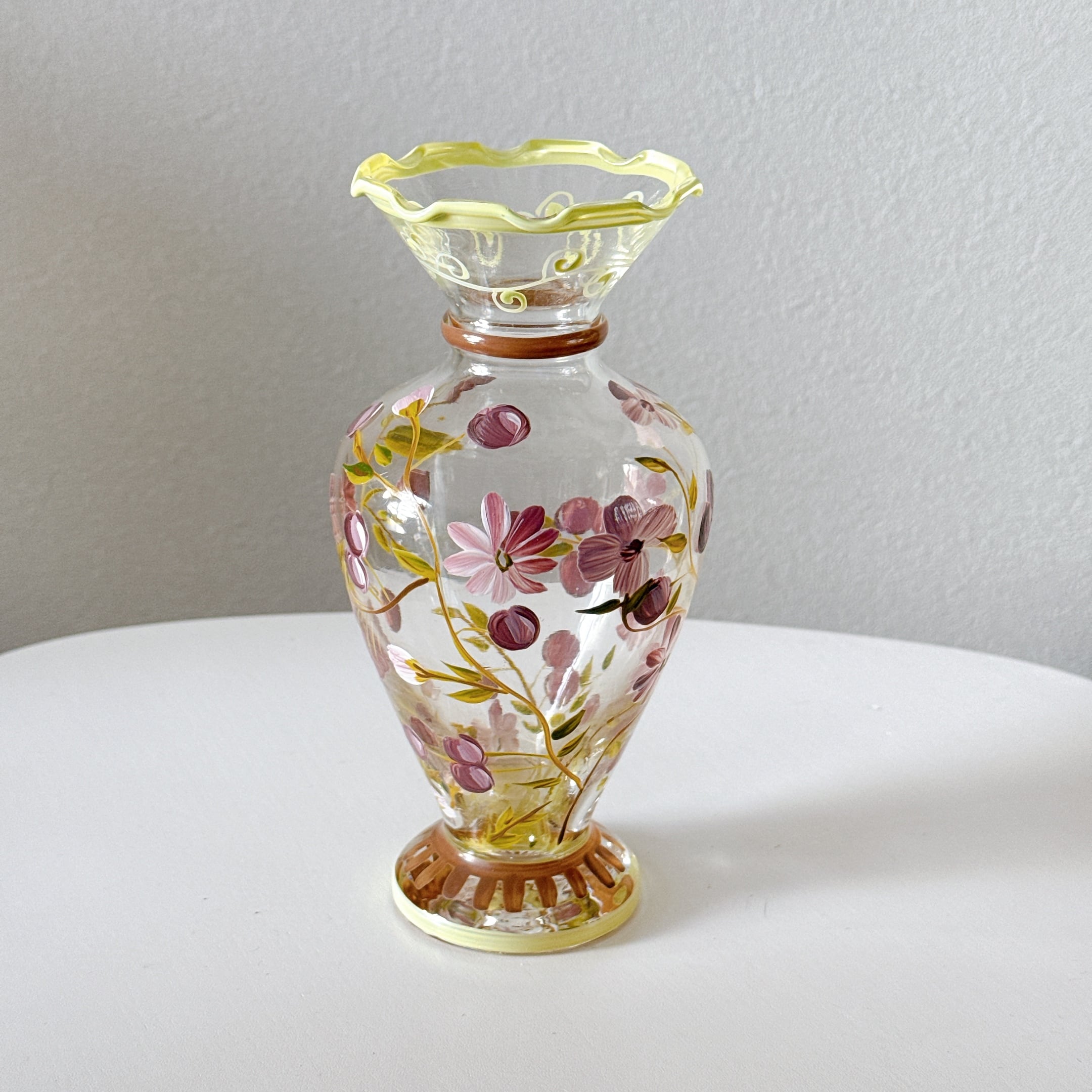 Tracy Porter Glass社のハンドペイントの花柄が可愛い、ヴィンテージフラワーベースです。1点ものになります。