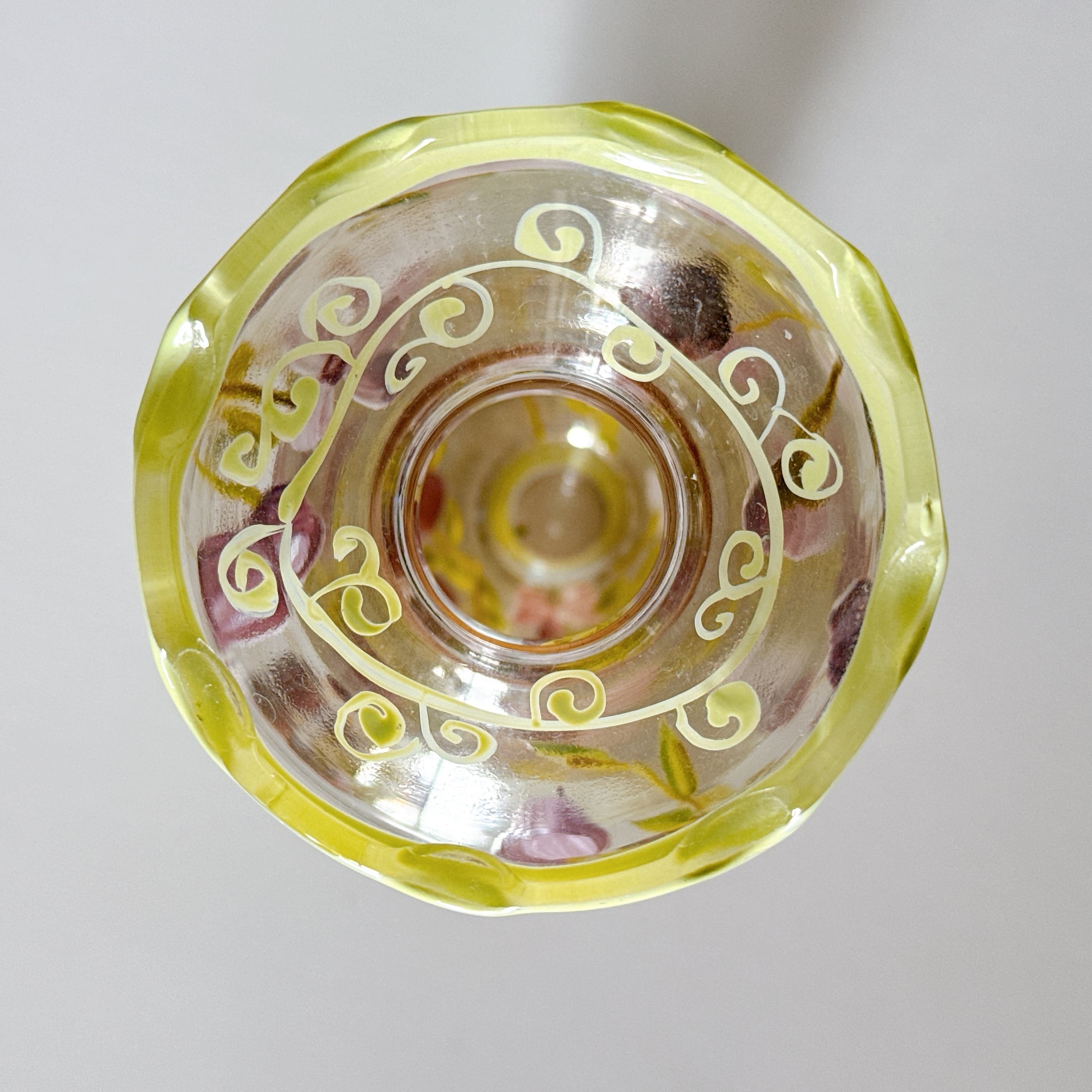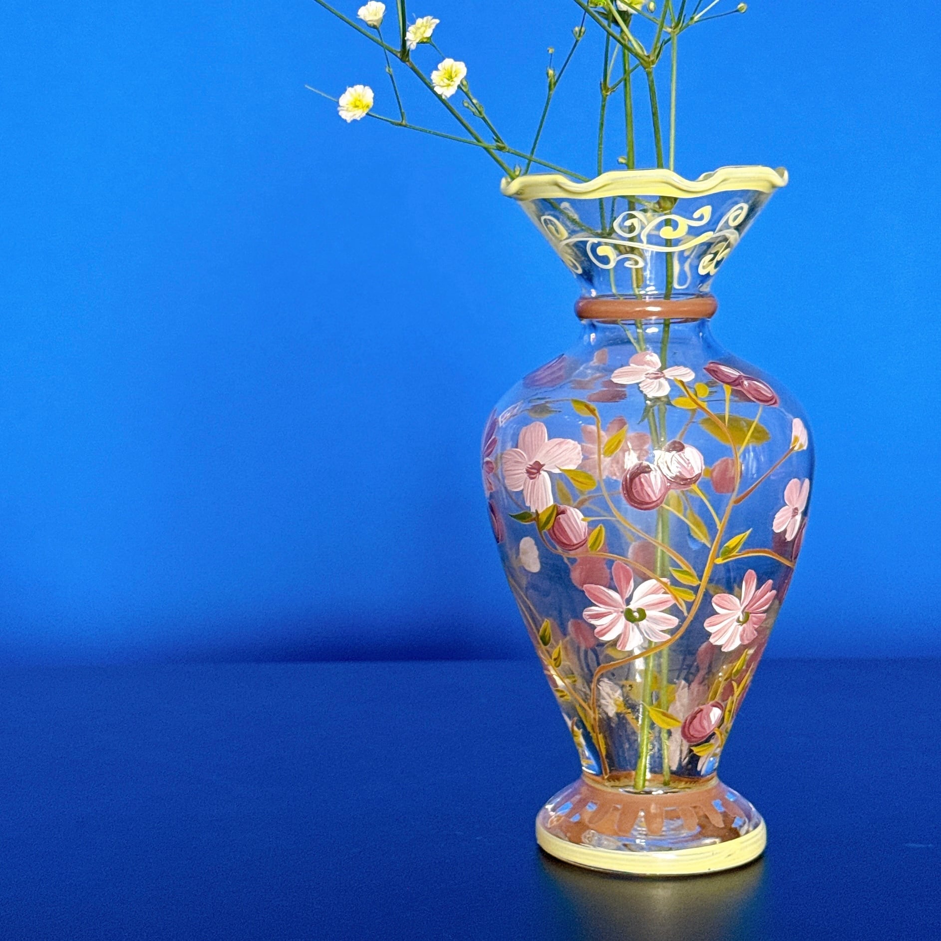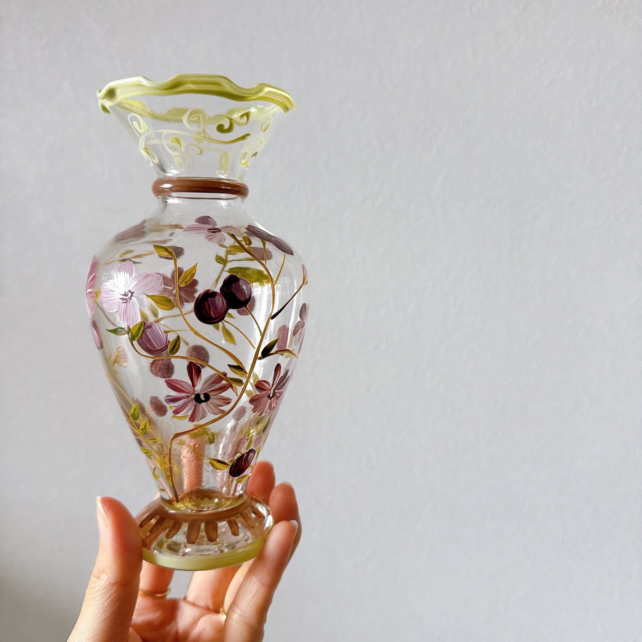 Tracy Porter Glass社のハンドペイントの花柄が可愛い、ヴィンテージフラワーベースです。1点ものになります。