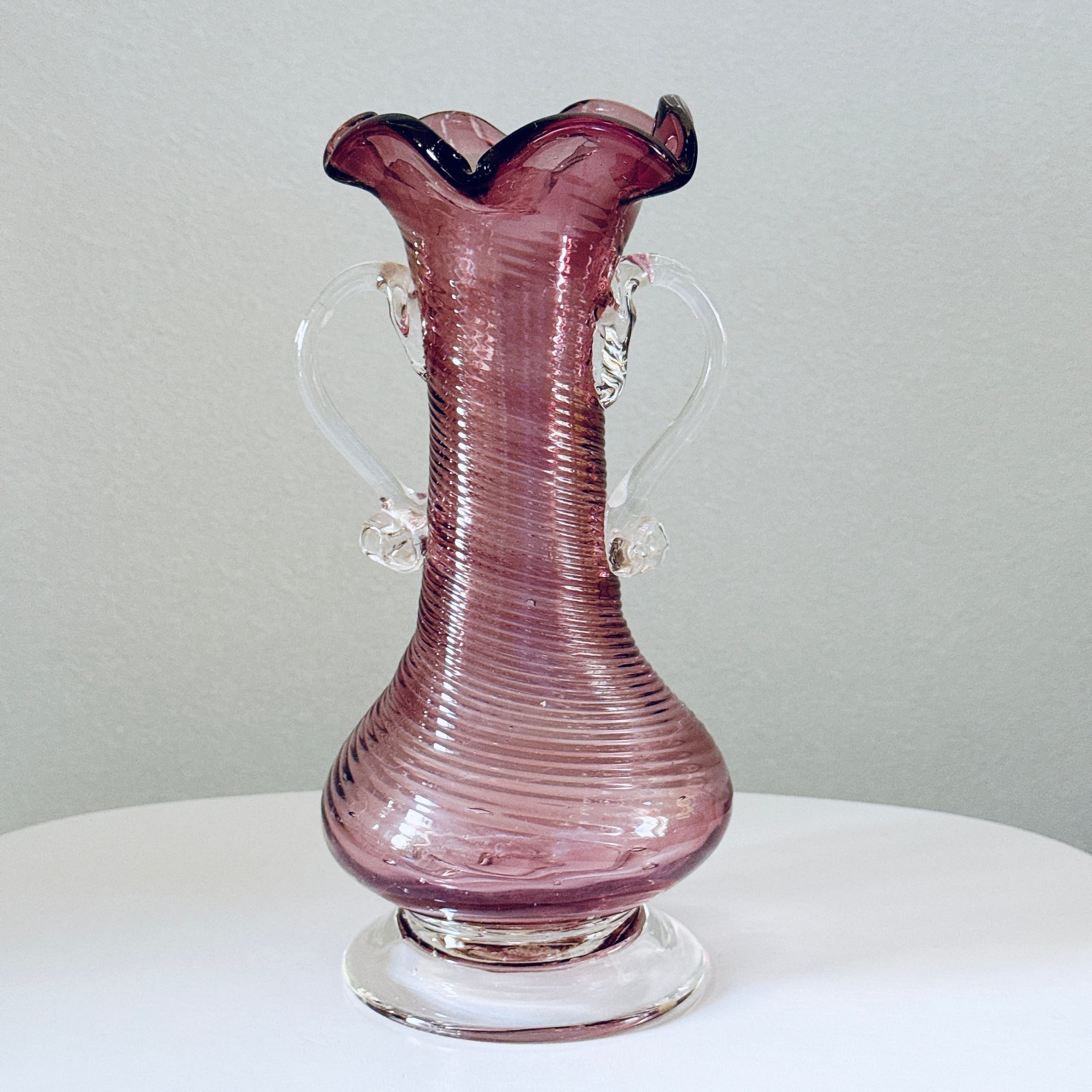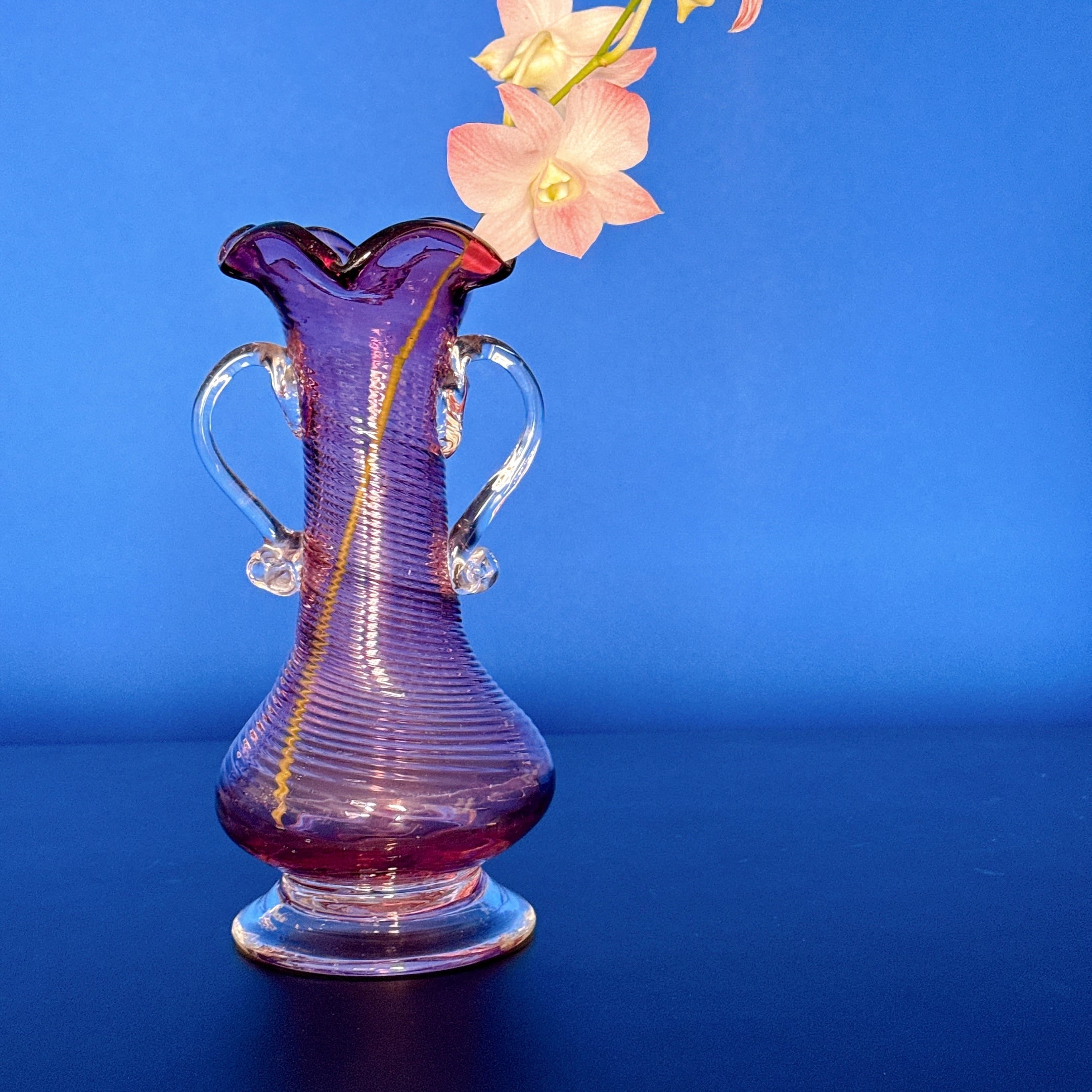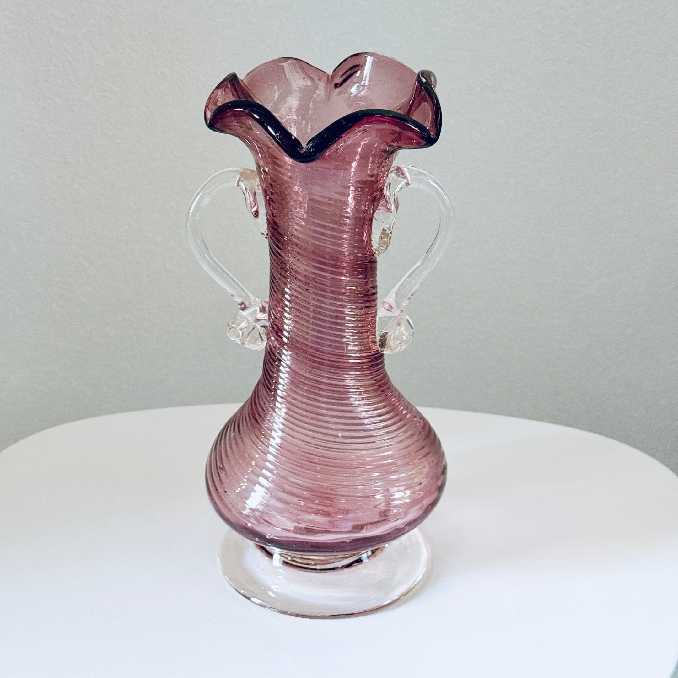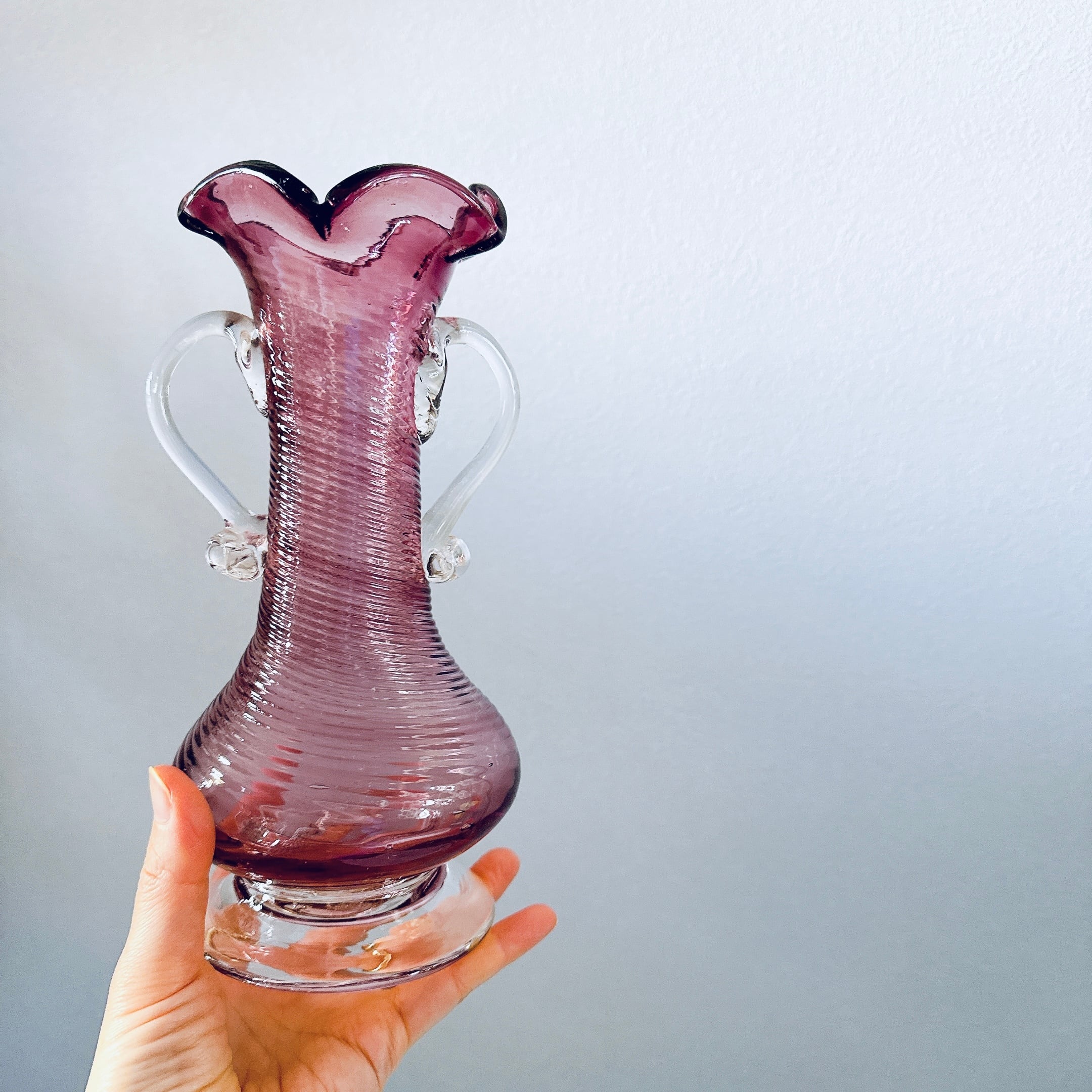 取手が可愛い、ガラス製のヴィンテージフラワーベースです。1点ものになります。