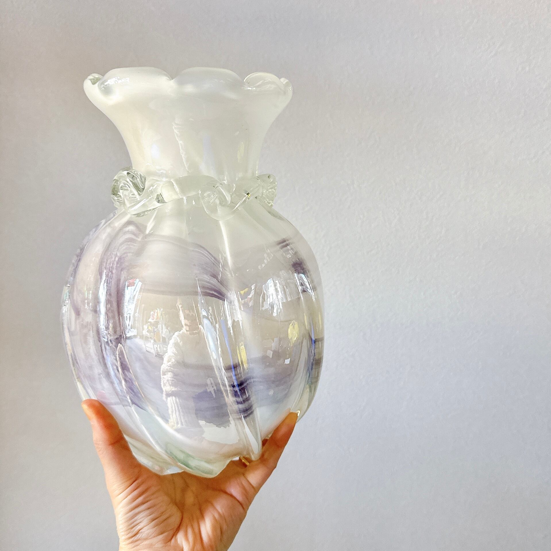 くびれのガラス細工やフリルの口が可愛い、昭和レトロな大きめのヴィンテージフラワーベースです。1点ものになります。