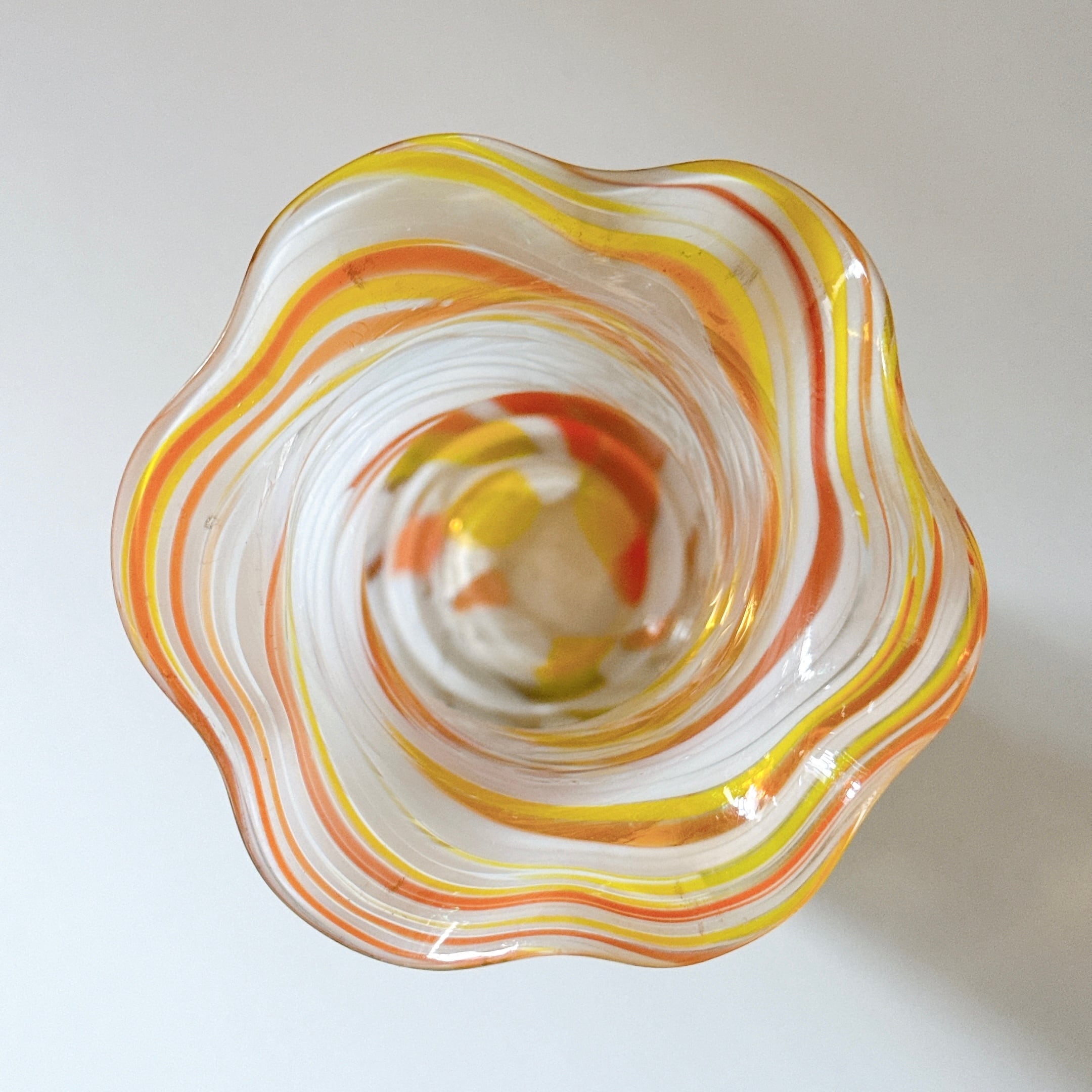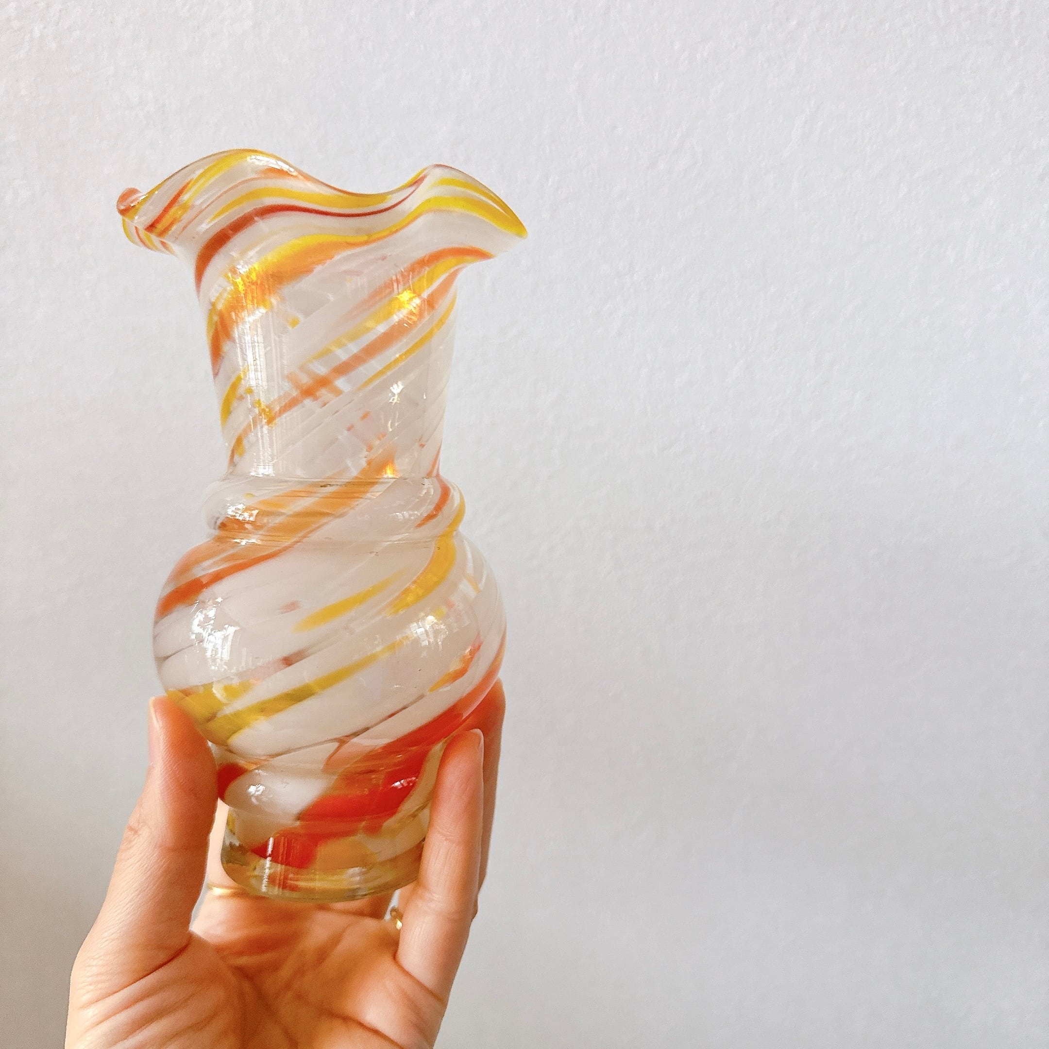 フリルとビタミンカラーが可愛い、ガラス製のヴィンテージフラワーベースです。1点ものになります。