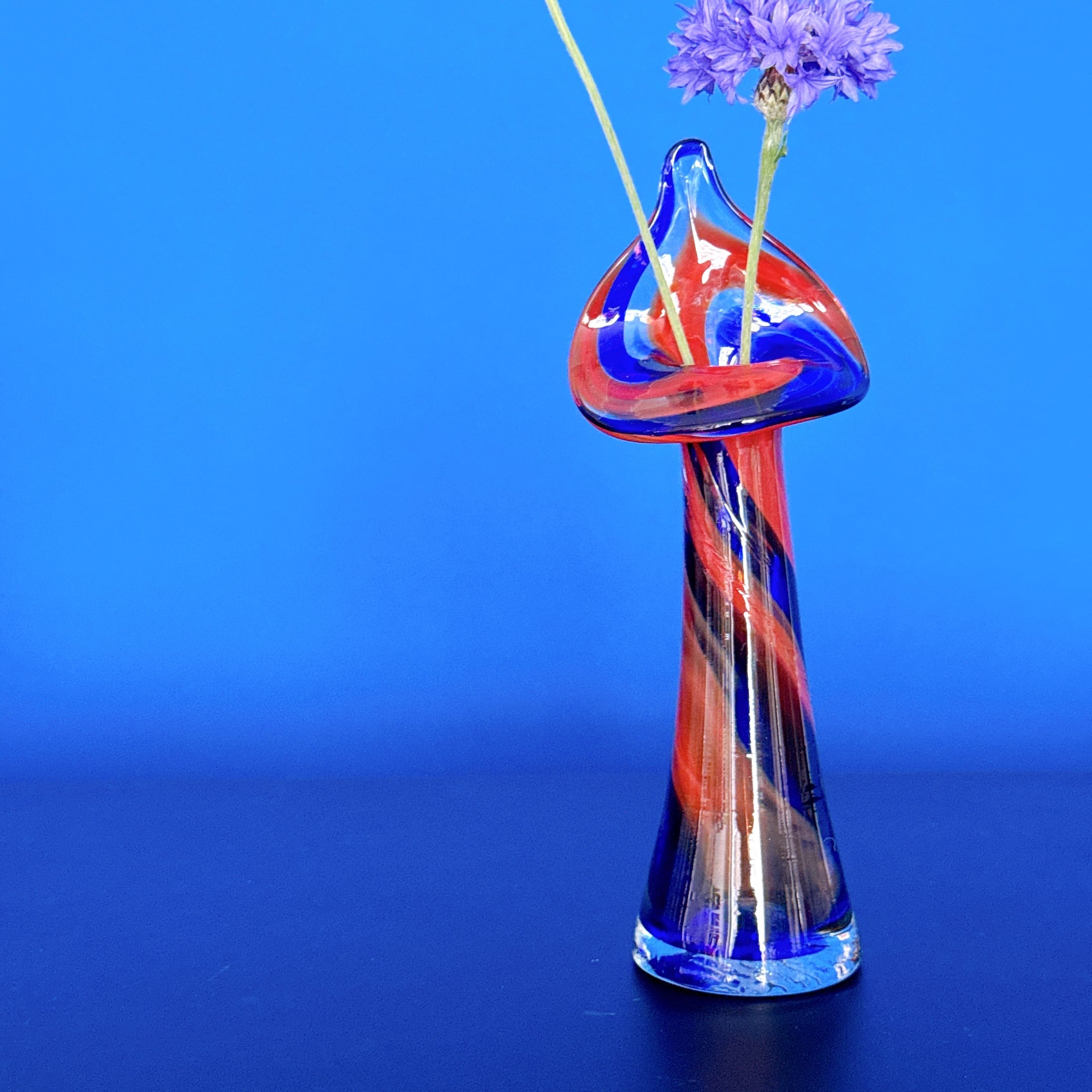 特徴的なデザインとポップな配色が面白い、ガラス製のヴィンテージフラワーベースです。1点ものになります。