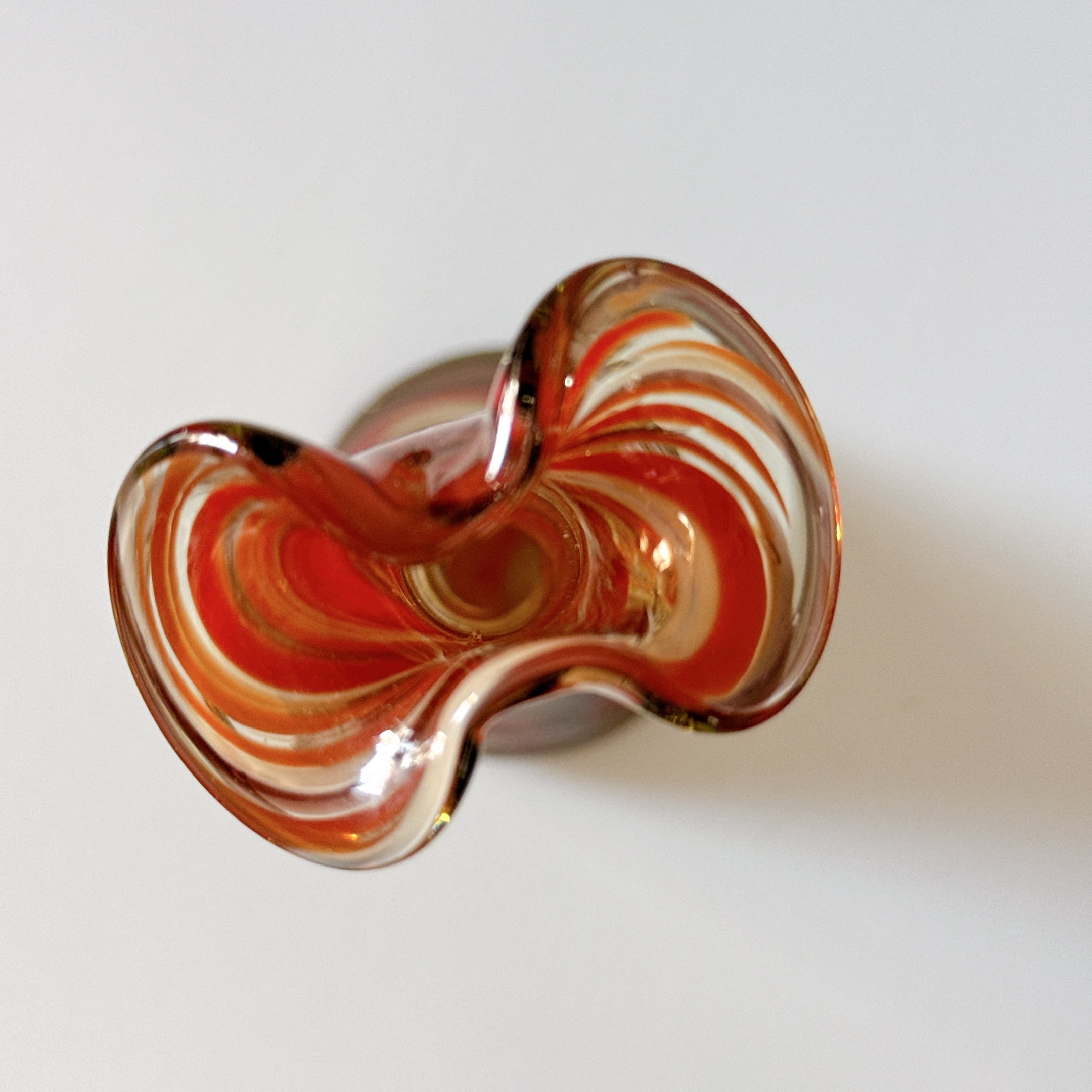 口の形が珍しい、ガラス製のヴィンテージ一輪挿しです。1点ものになります。