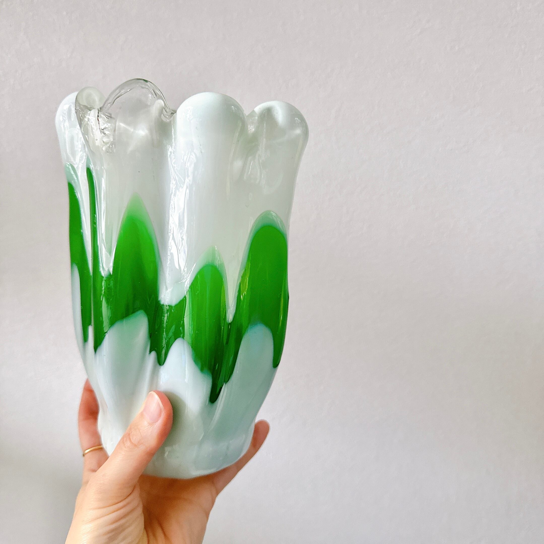 緑のラインがアクセントの昭和レトロなヴィンテージフラワーベースです。1点ものになります。