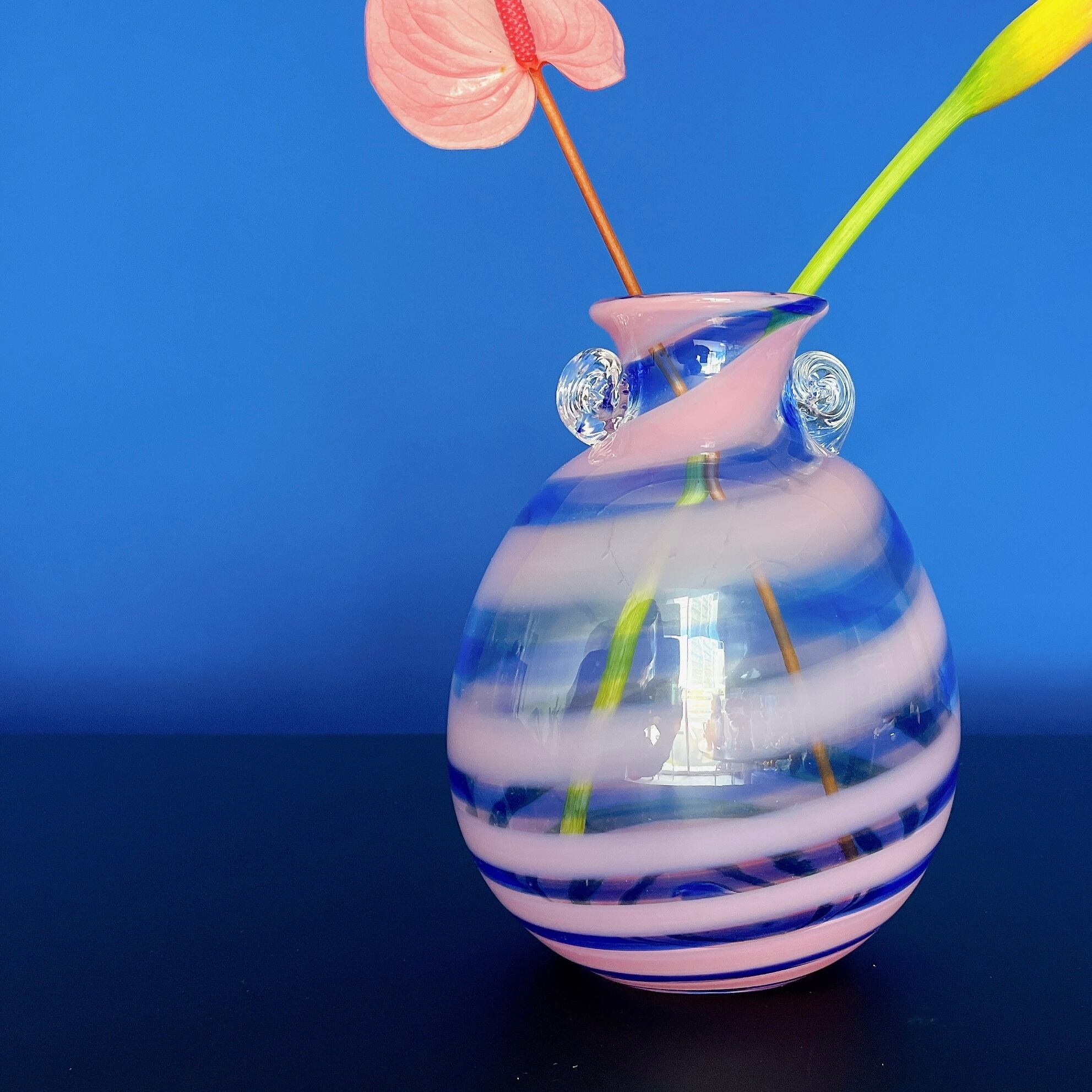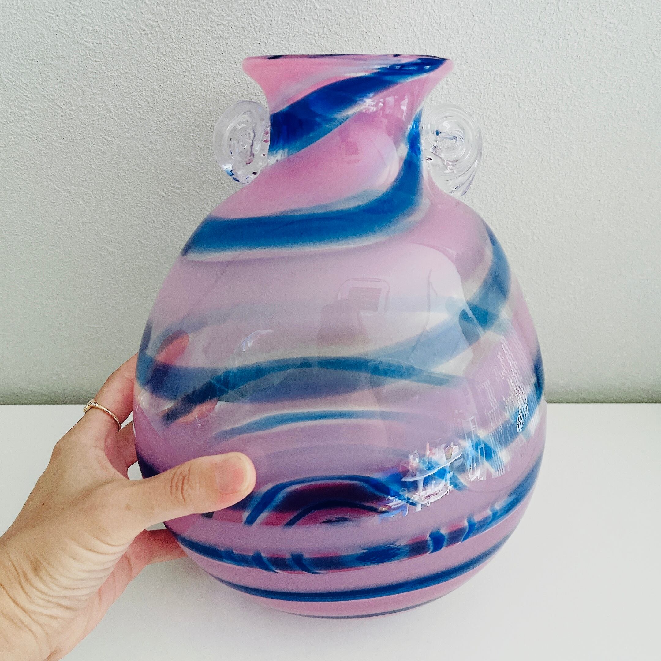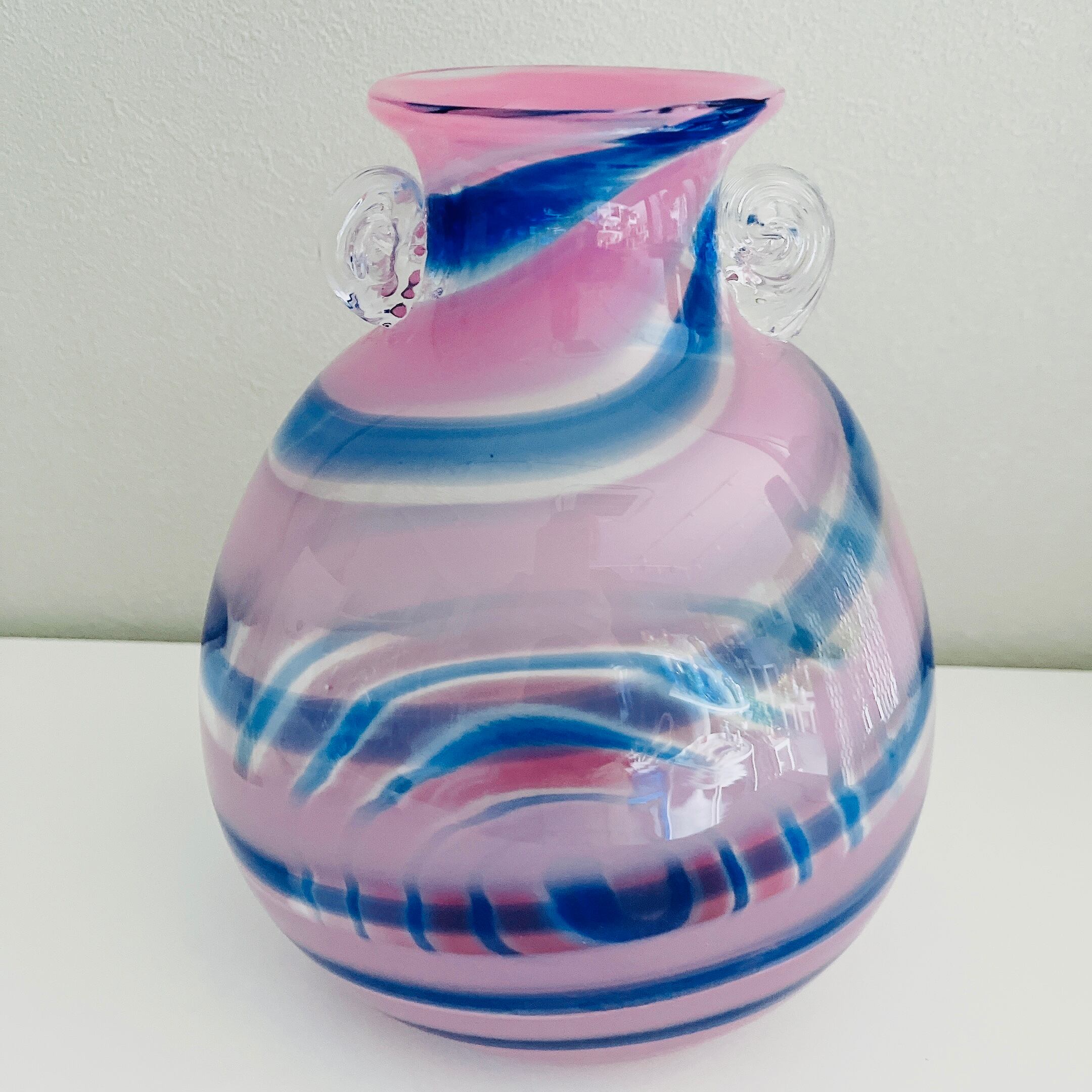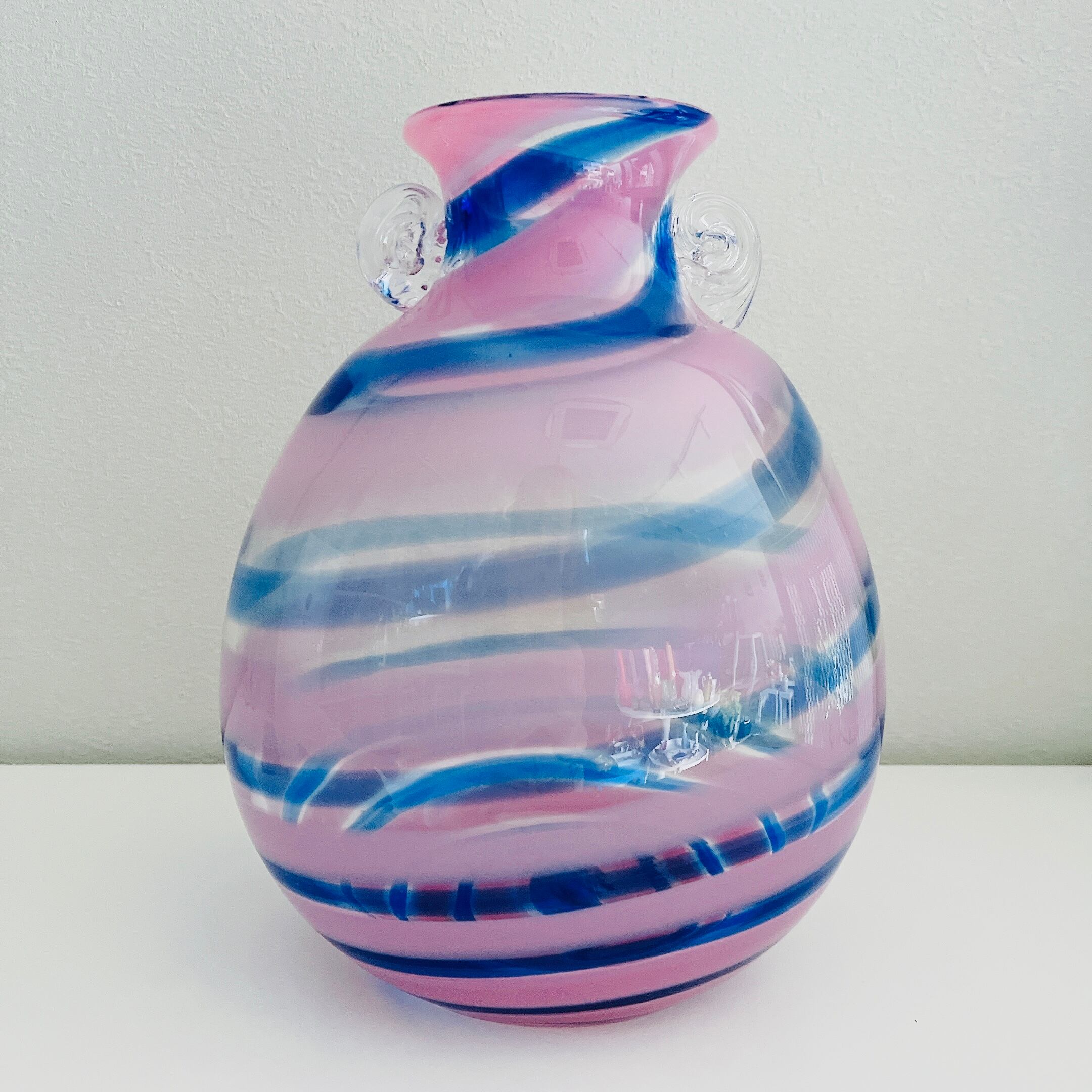 ピンクとブルーのマーブル模様が可愛い、昭和のレトロポップなヴィンテージフラワーベースです。1点ものになります。