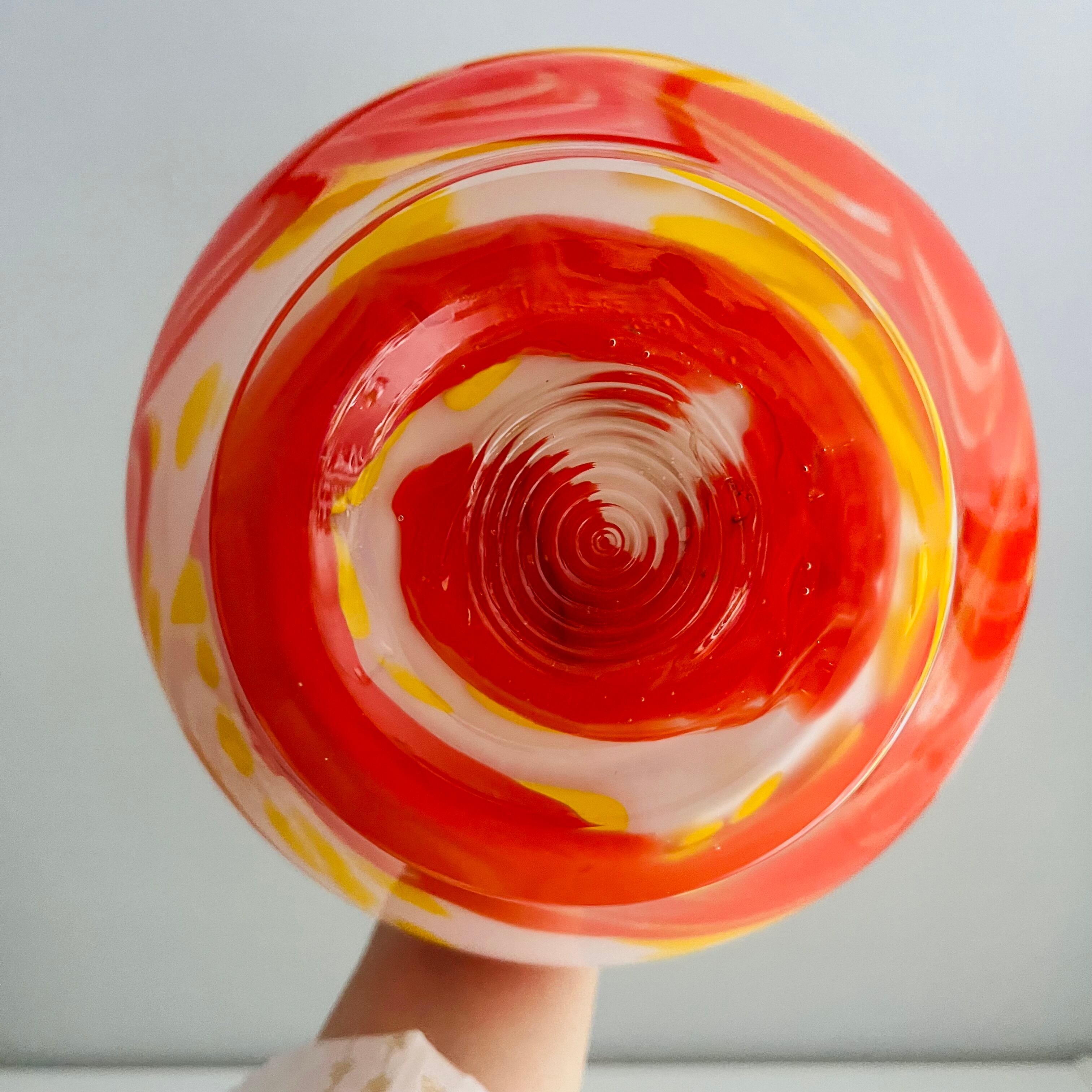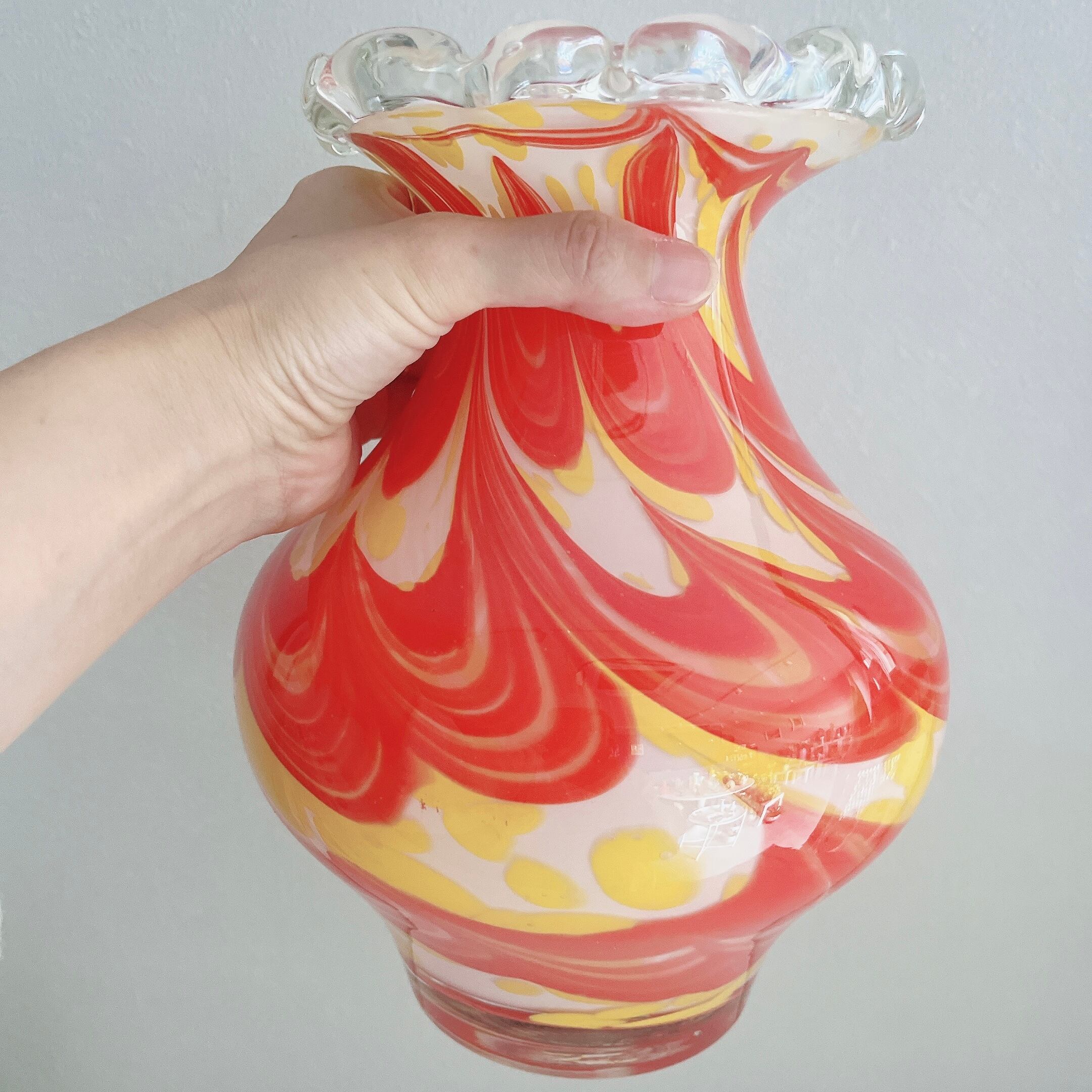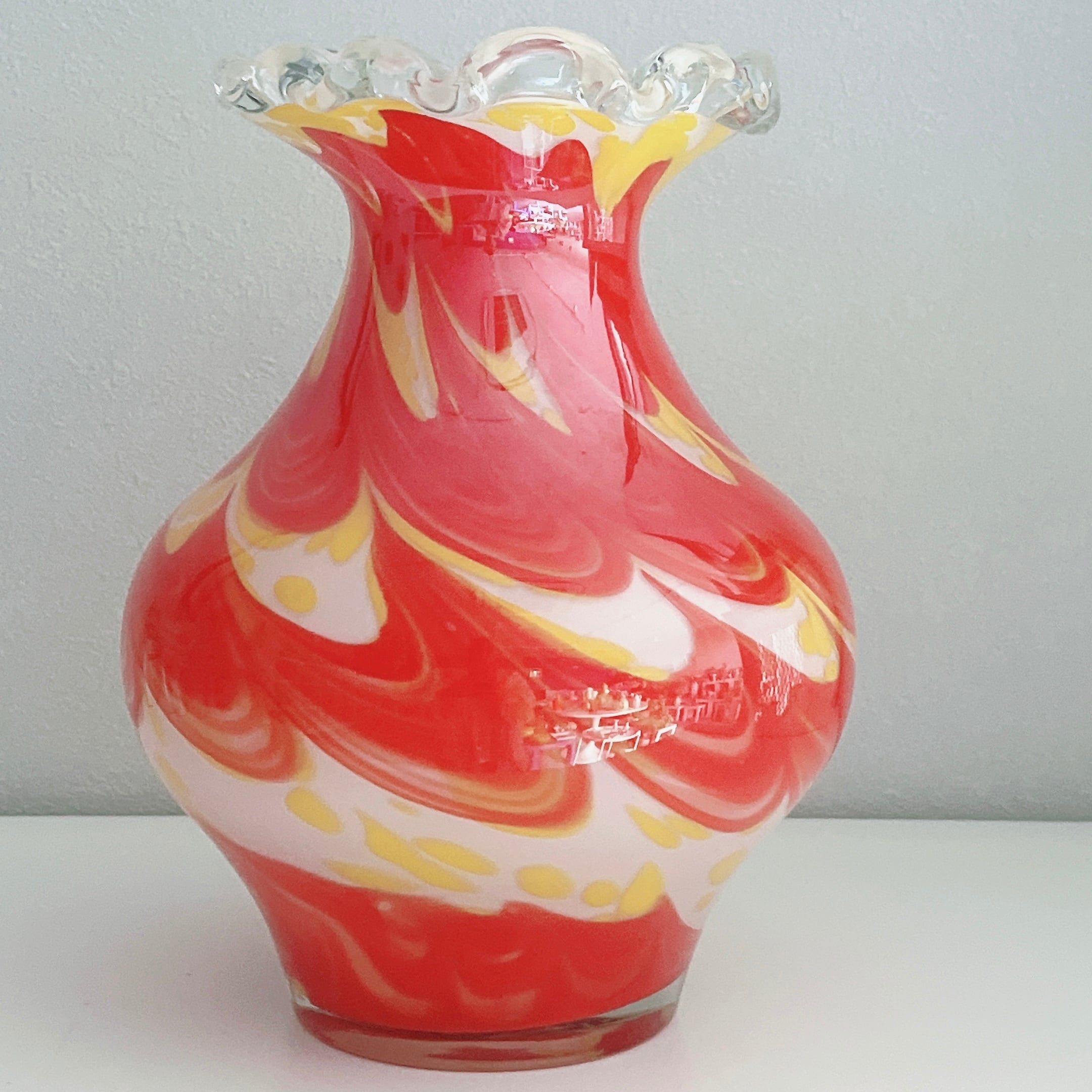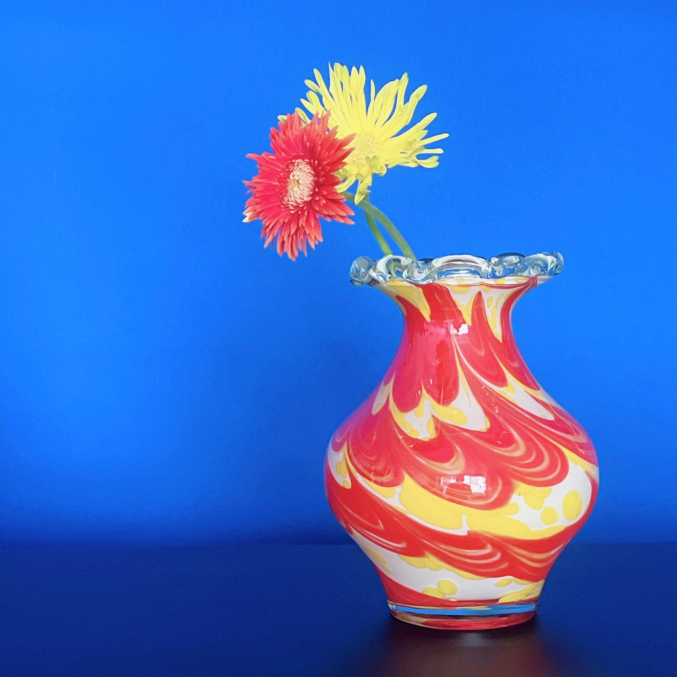 フリルの口と鮮やかなビタミンカラーが可愛い、昭和のレトロポップなヴィンテージフラワーベースです。1点ものになります。