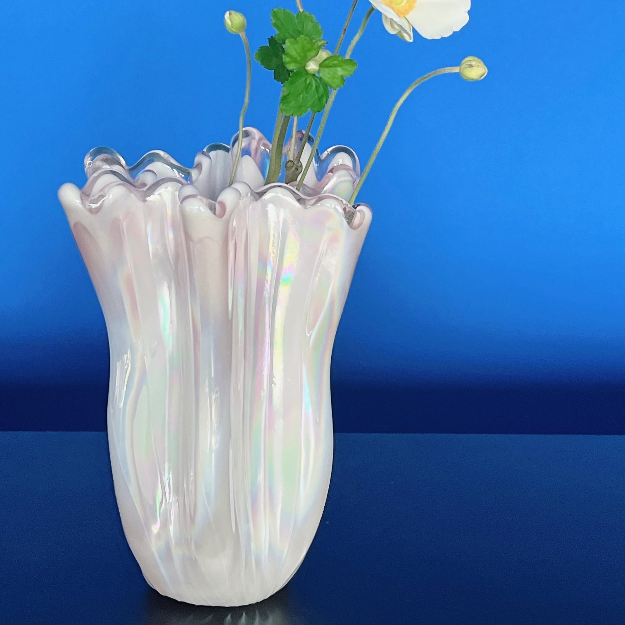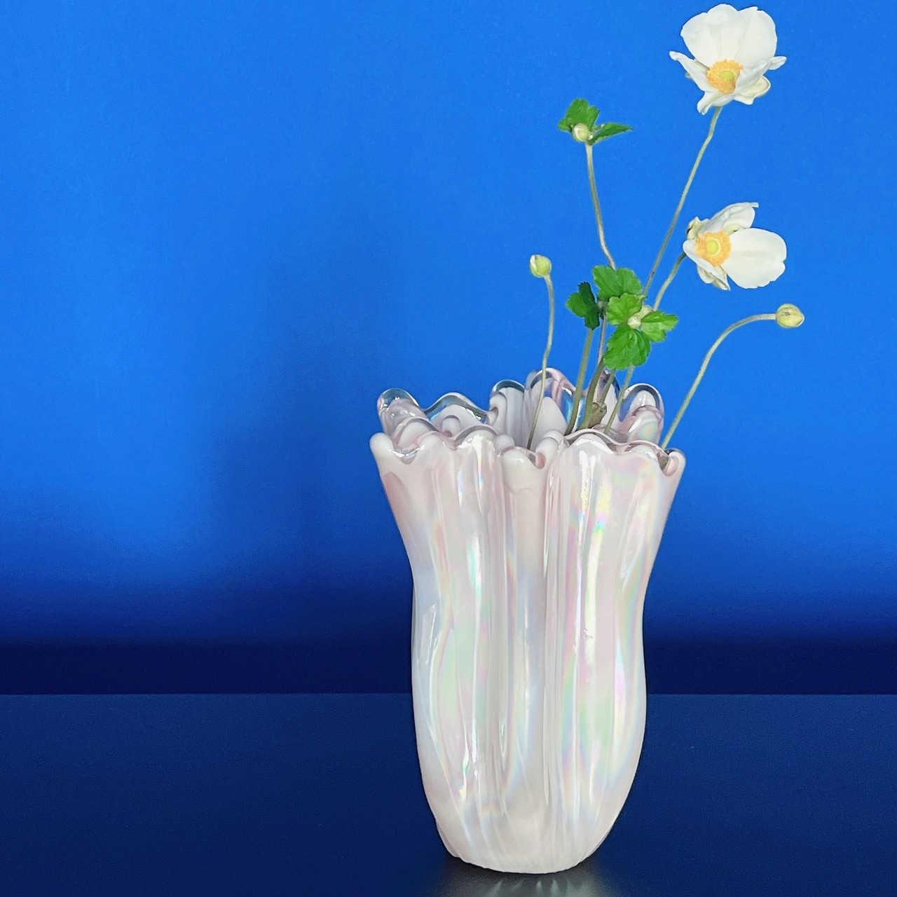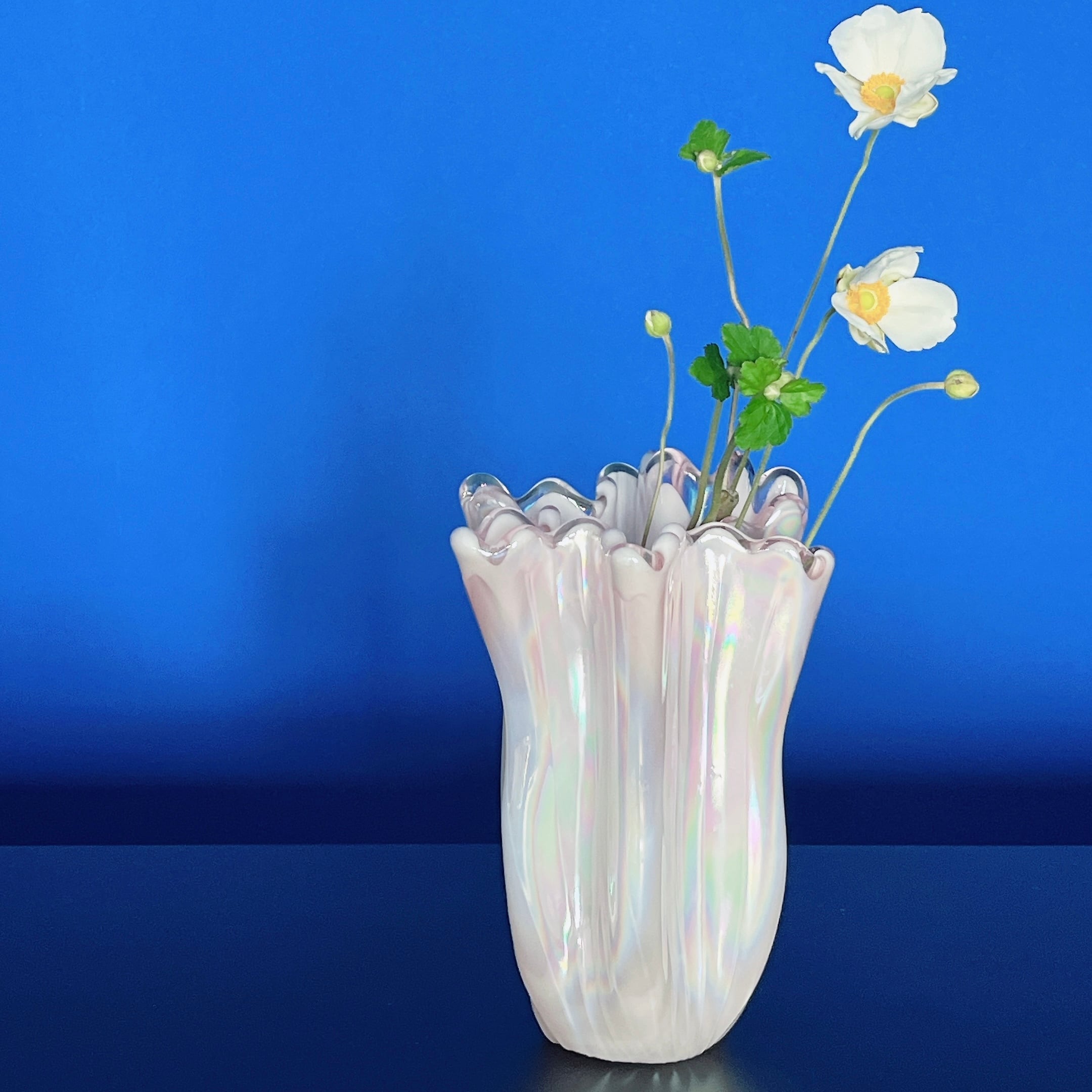フリルが可愛い、昭和のレトロポップなヴィンテージフラワーベースです。全て手作りで、ひとつひとつ形が違うため、1点ものになります。