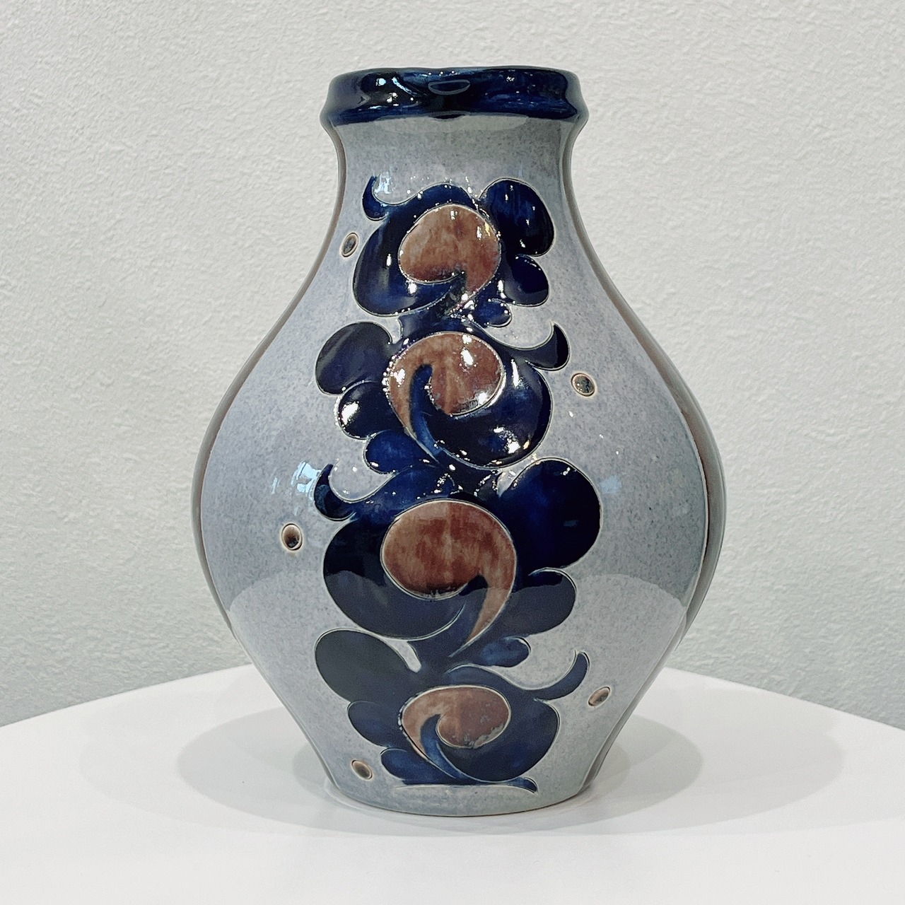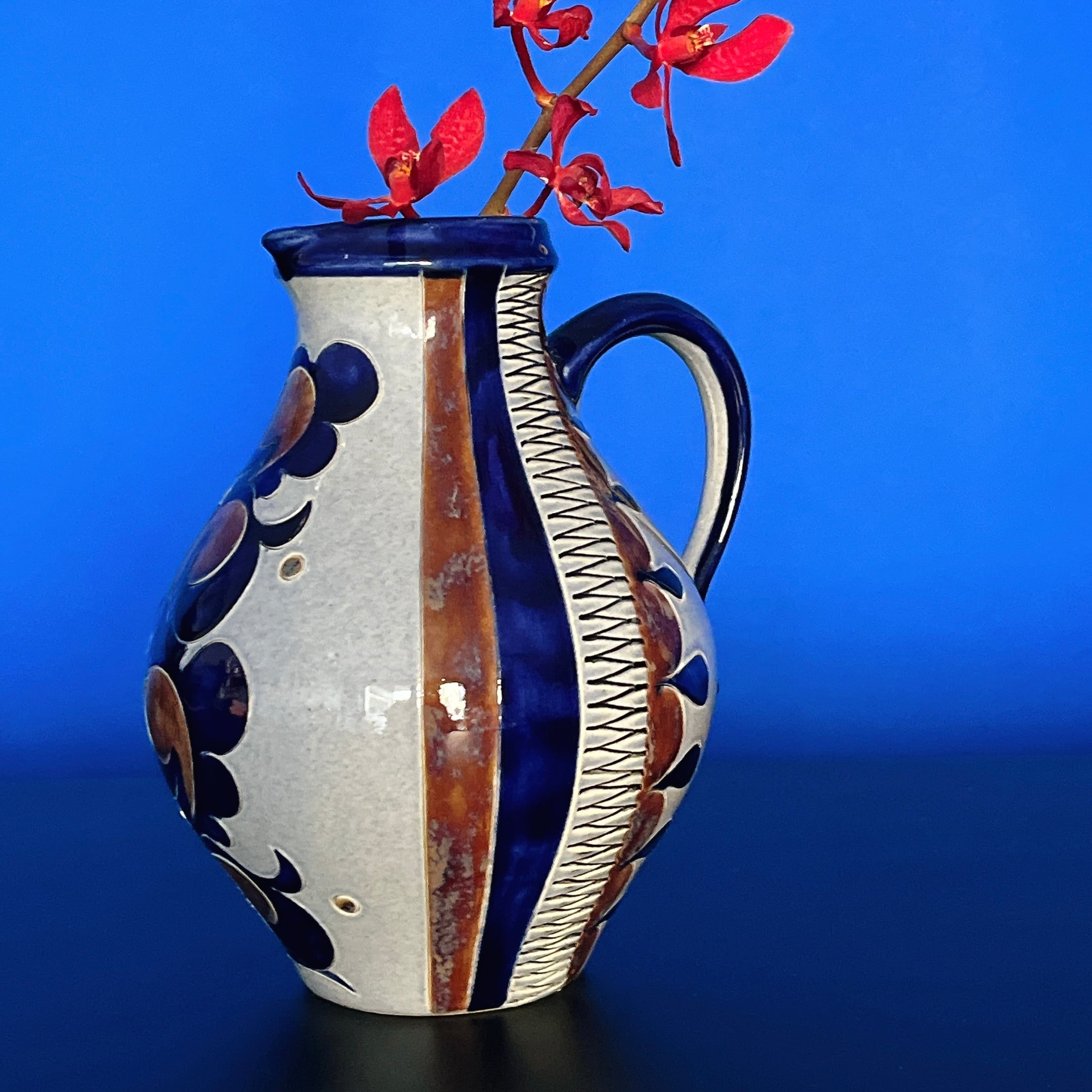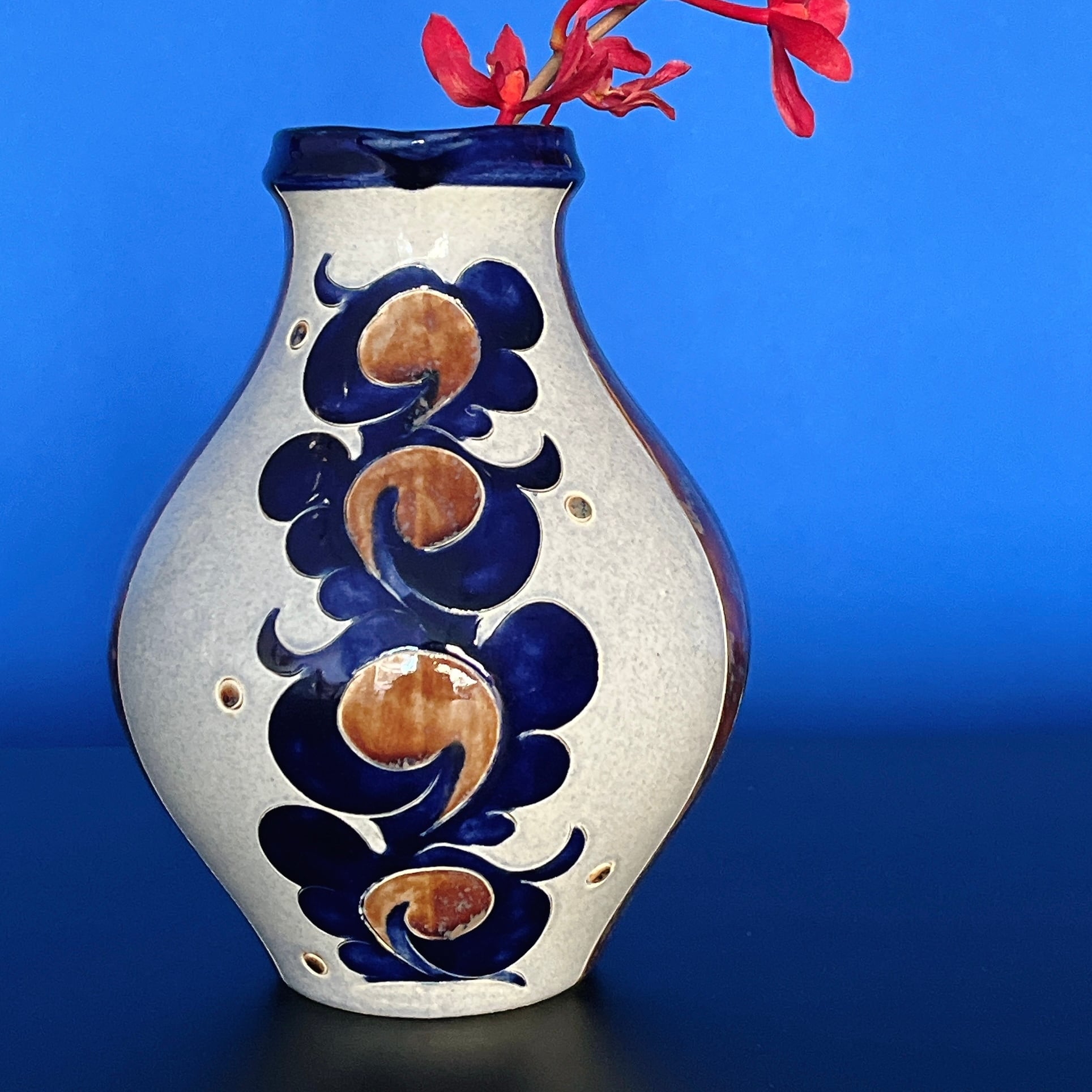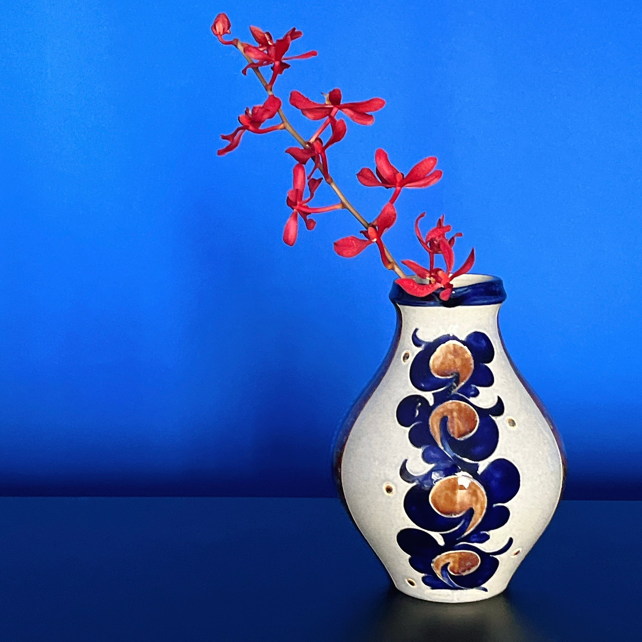 はっきりどこの国のものかわからないのですが、ヨーロッパらしい絵付けが可愛い、陶器のヴィンテージフラワーベースです。1点ものになります。