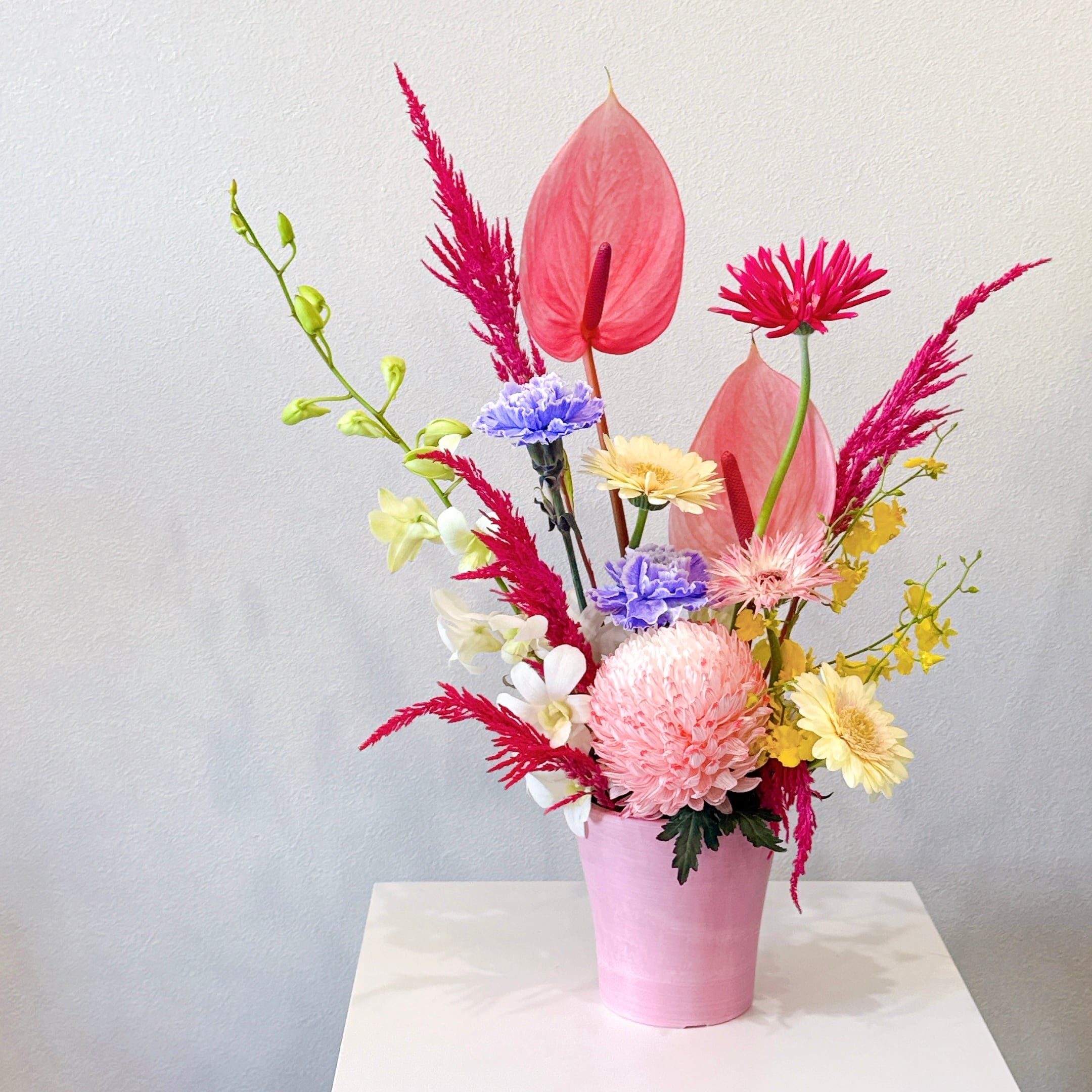 カラフルなお花を使ったアレンジメントです♪