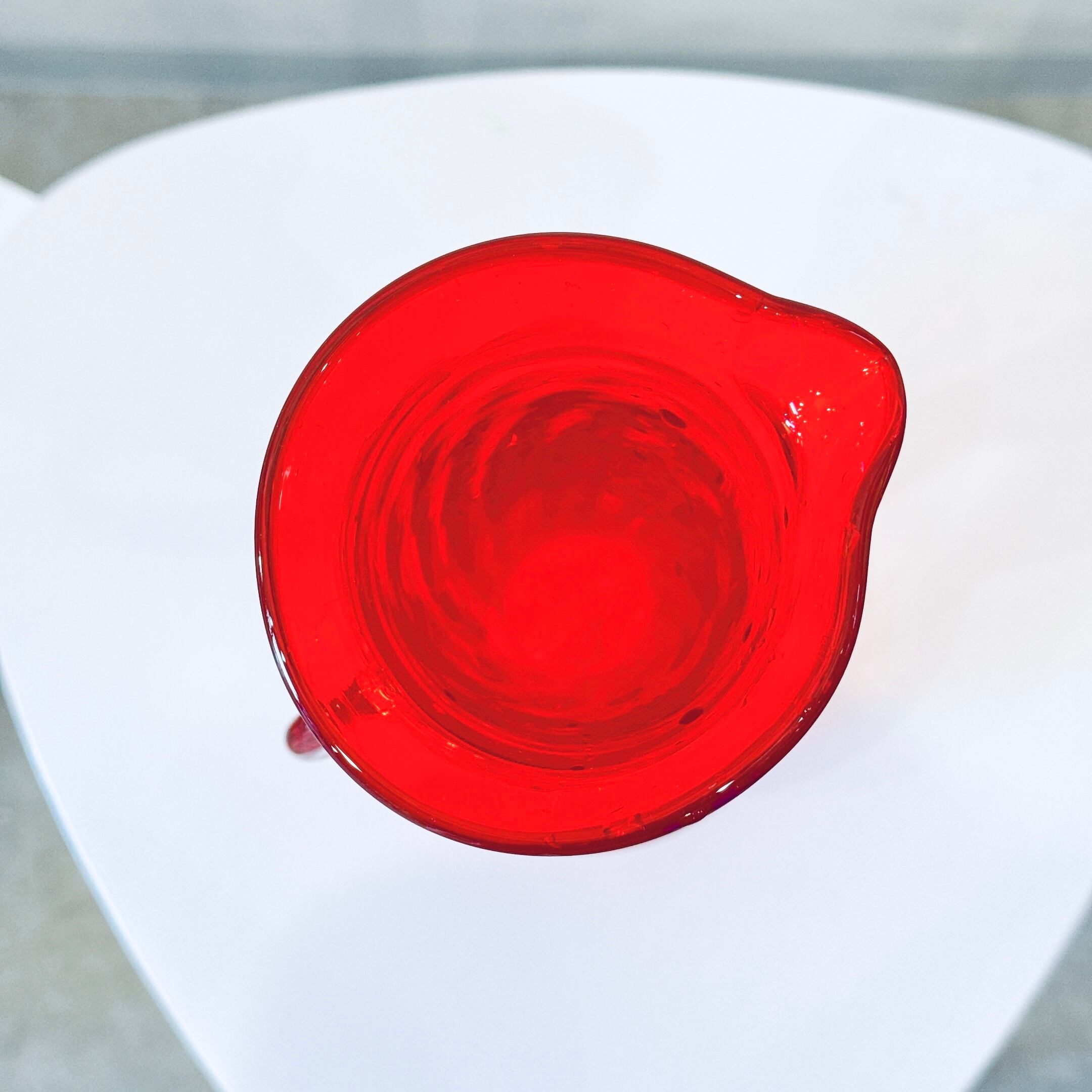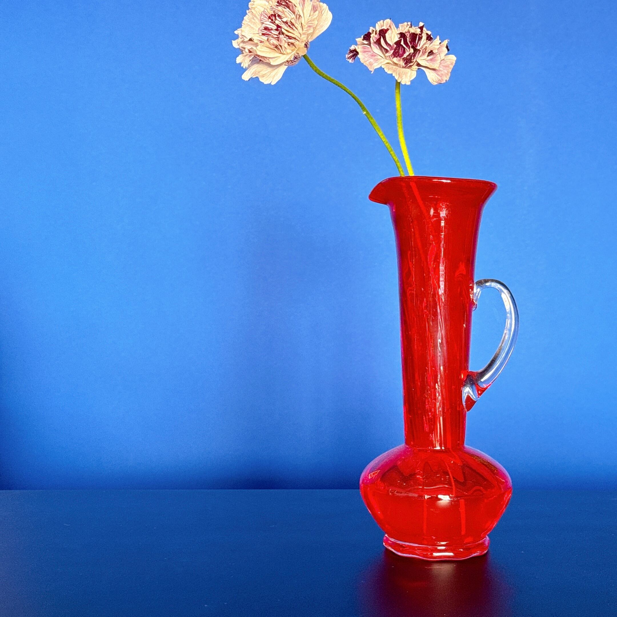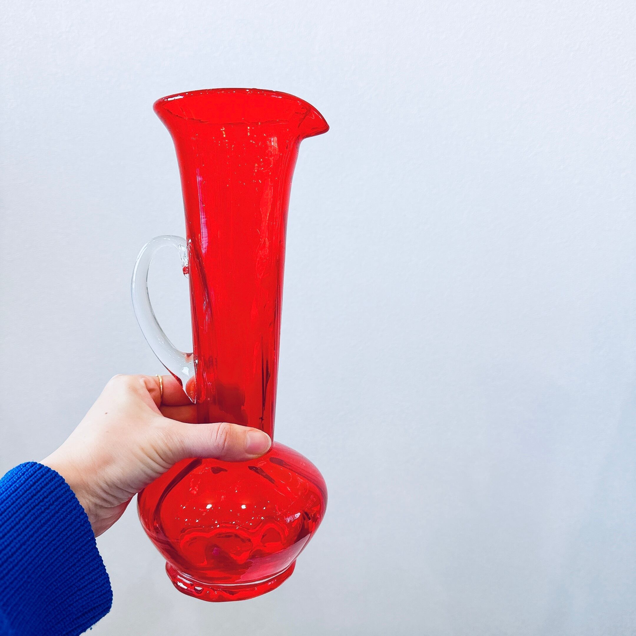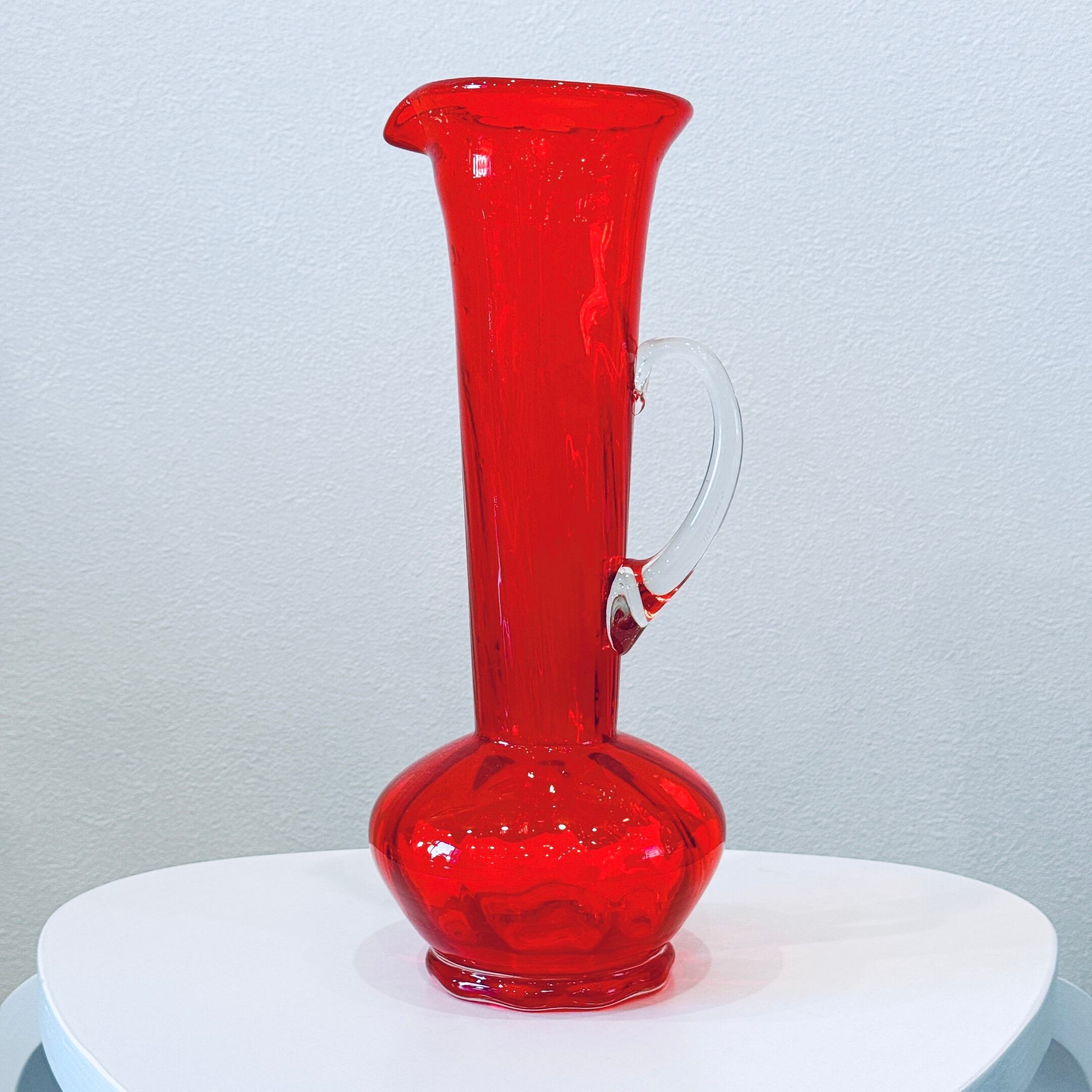 きれいな赤いボディと透明のハンドルが可愛い、昭和レトロなヴィンテージフラワーベースです。1点ものになります。