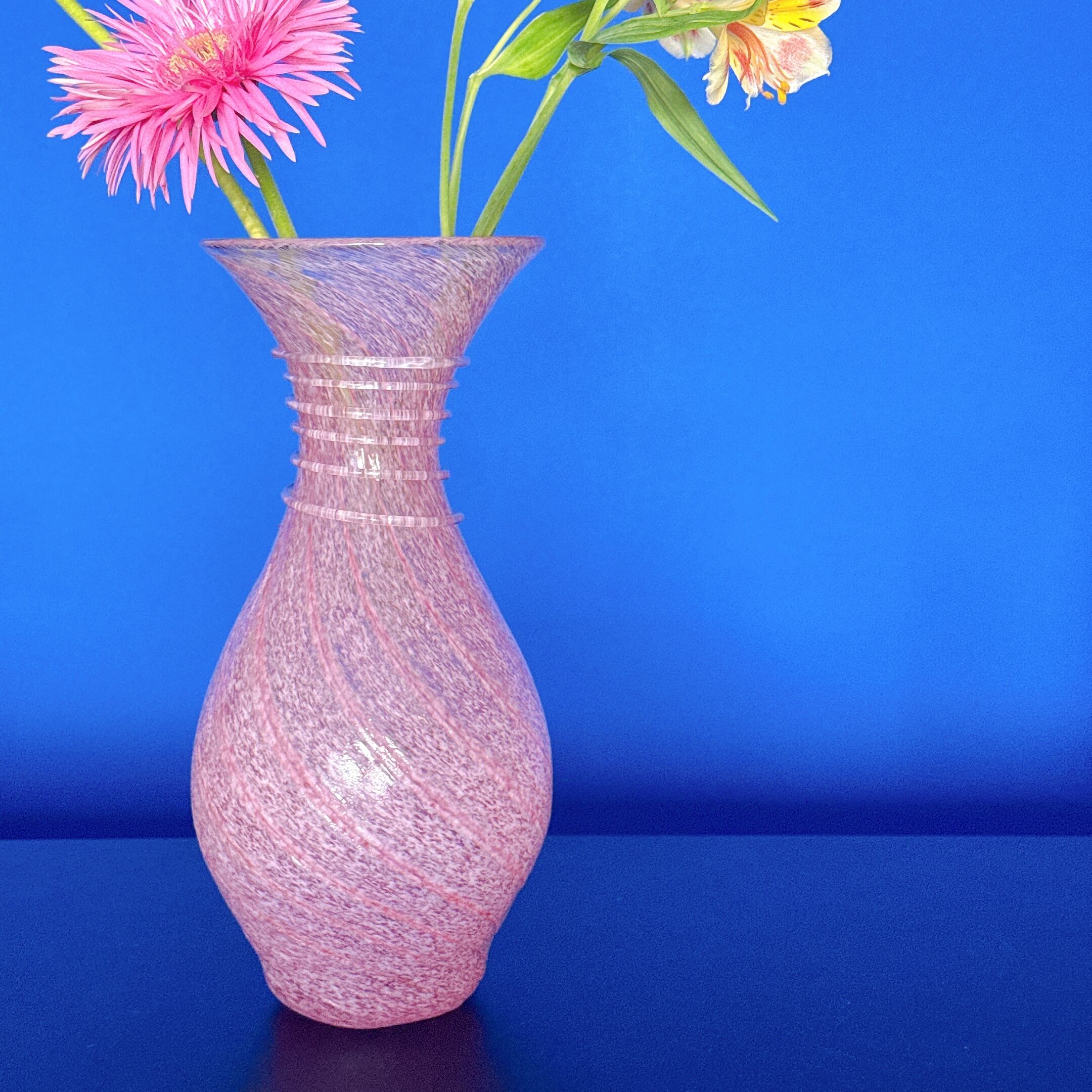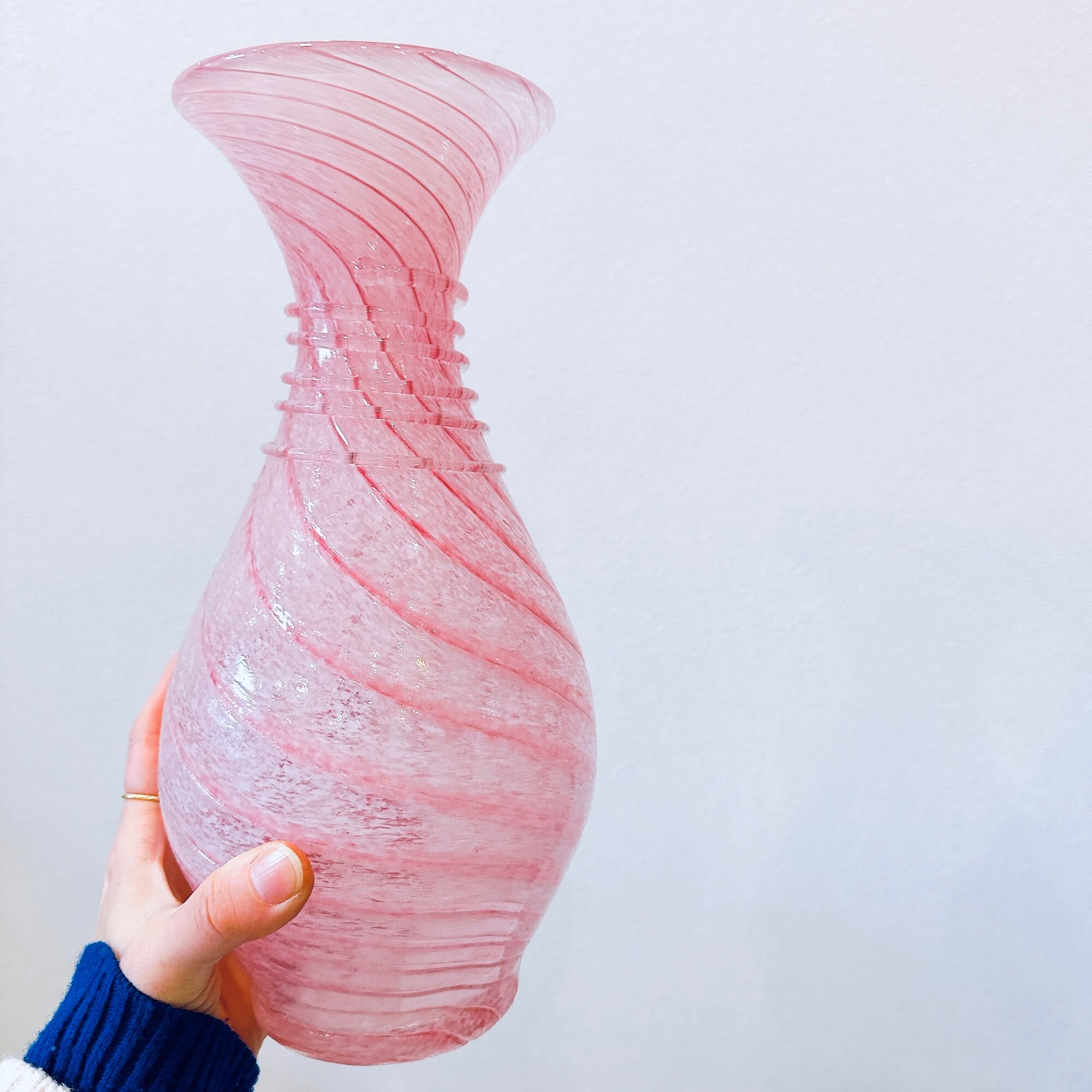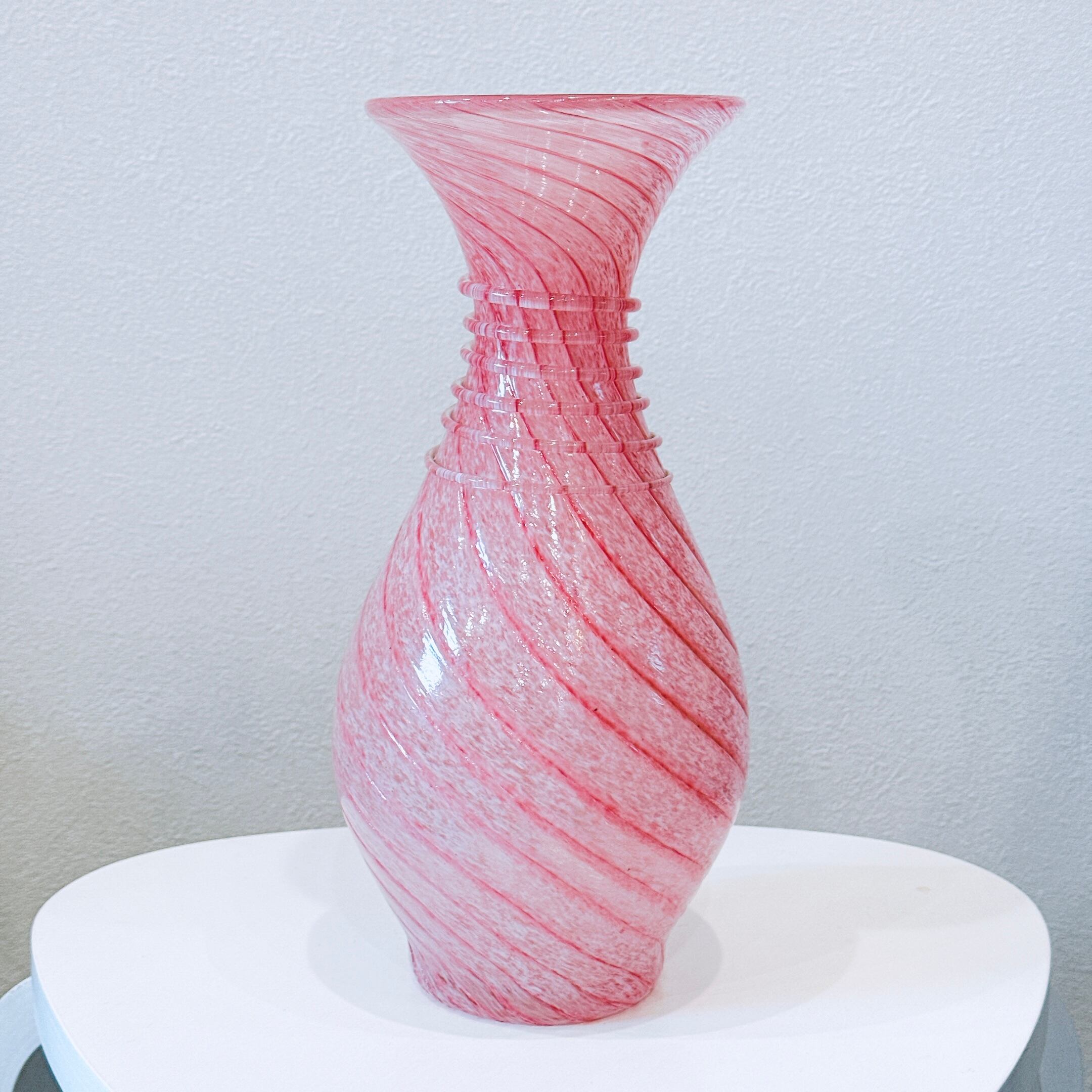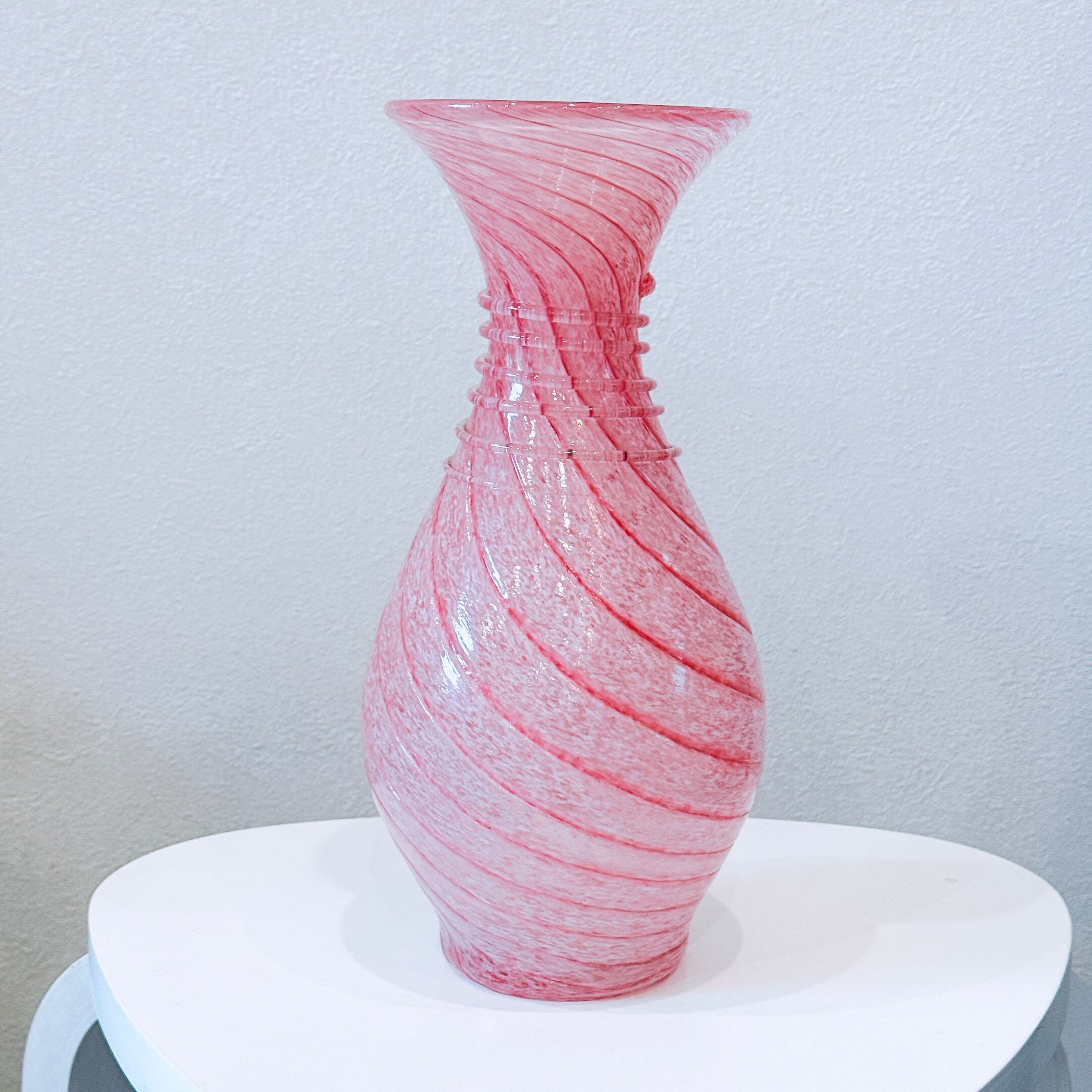 ピンクのスパイラル模様が可愛い、昭和のレトロポップなヴィンテージフラワーベースです。1点ものになります。